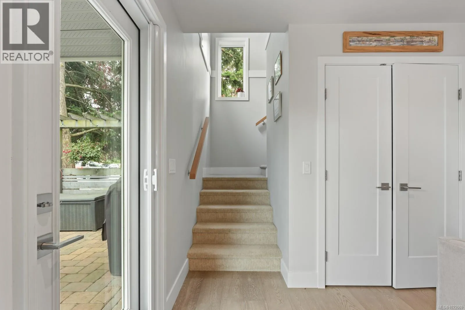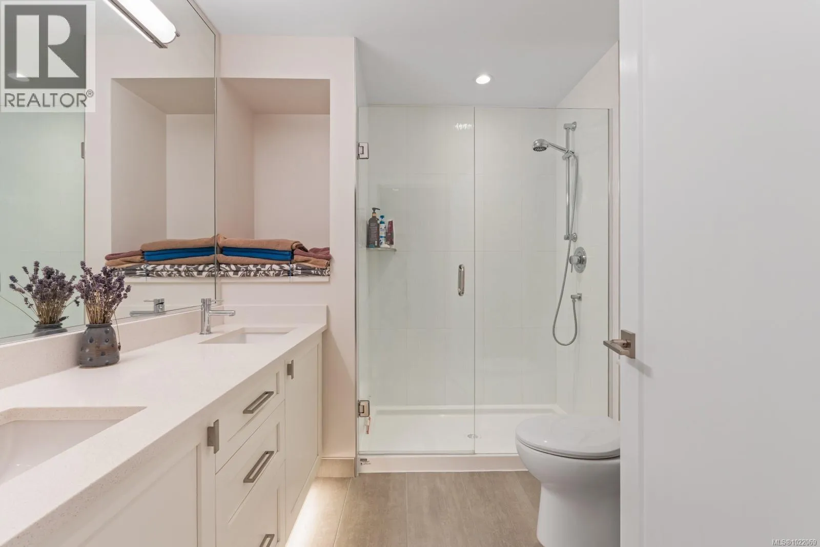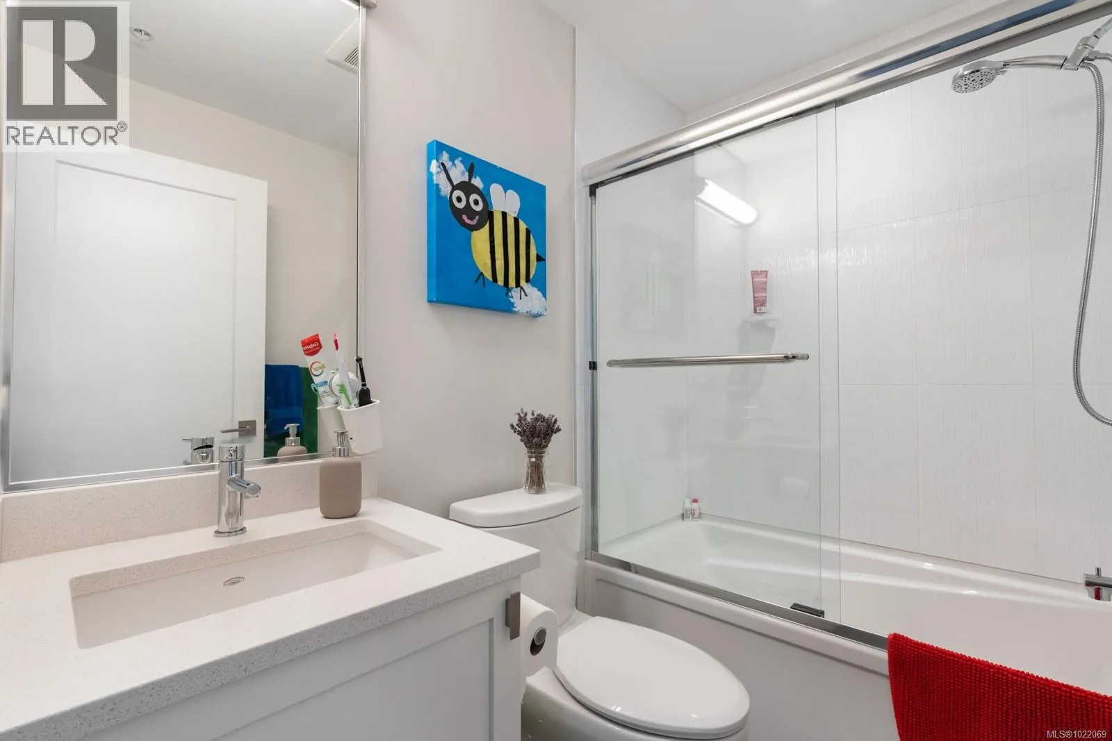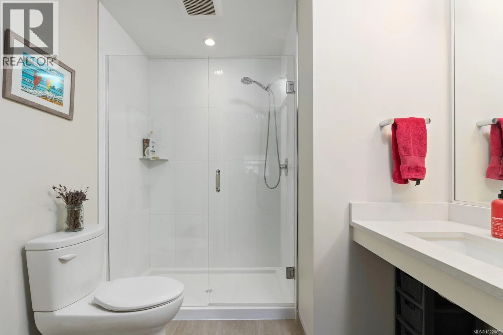 Welcome to Seahaven, a locally inspired boutique development in an unparalleled Sidney location. Townhome 7 is a desirable end unit, and is one of only 4 with the large ground lvl side patio. Faultless features include wood flooring, high ceilings, EV-wired garages and more. On the main, a designer kitchen is fitted with chic white cabinetry, quartz counters and upscale SS appliances w/gas range. The open concept living/dining is flooded with natural light, and boasts cozy gas FP & french doors leading to the private patio. A good sized bedroom, laundry room and 3P bathroom completes. *This level is also wheelchair accessible*. Upstairs, you will find a lavish primary suite w/walk in closet, sumptuous 4P ensuite, and access to your private deck. Down the hall, another large bedroom and 4P bathroom. Lastly, a massive flex space lends itself to either a family room or bedroom. Located steps to shops, dining & parks, this is your opportunity to live the urban seaside lifestyle. (id:27476)