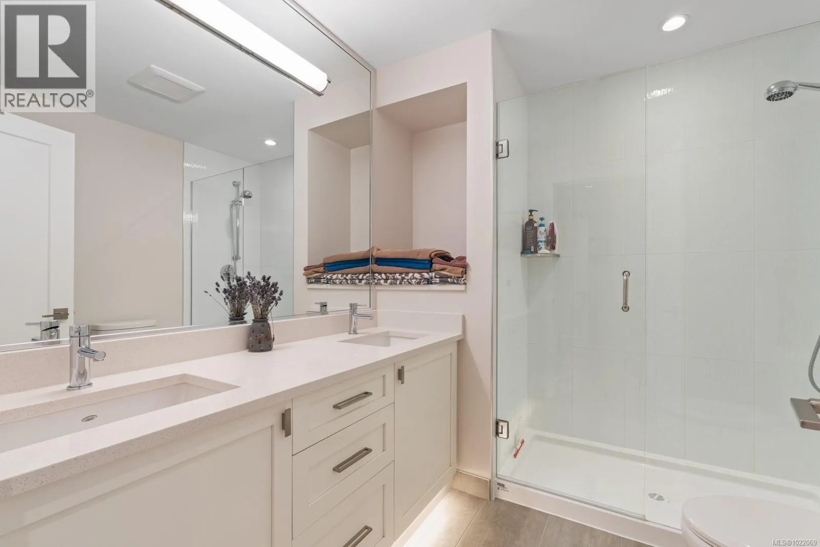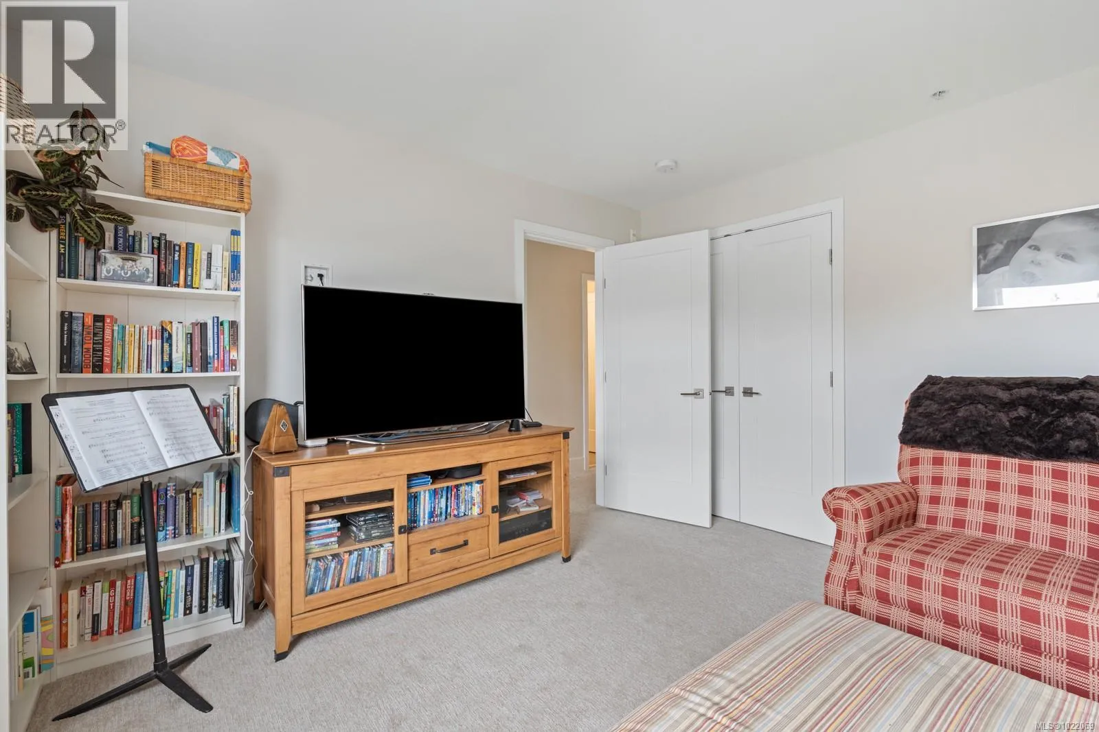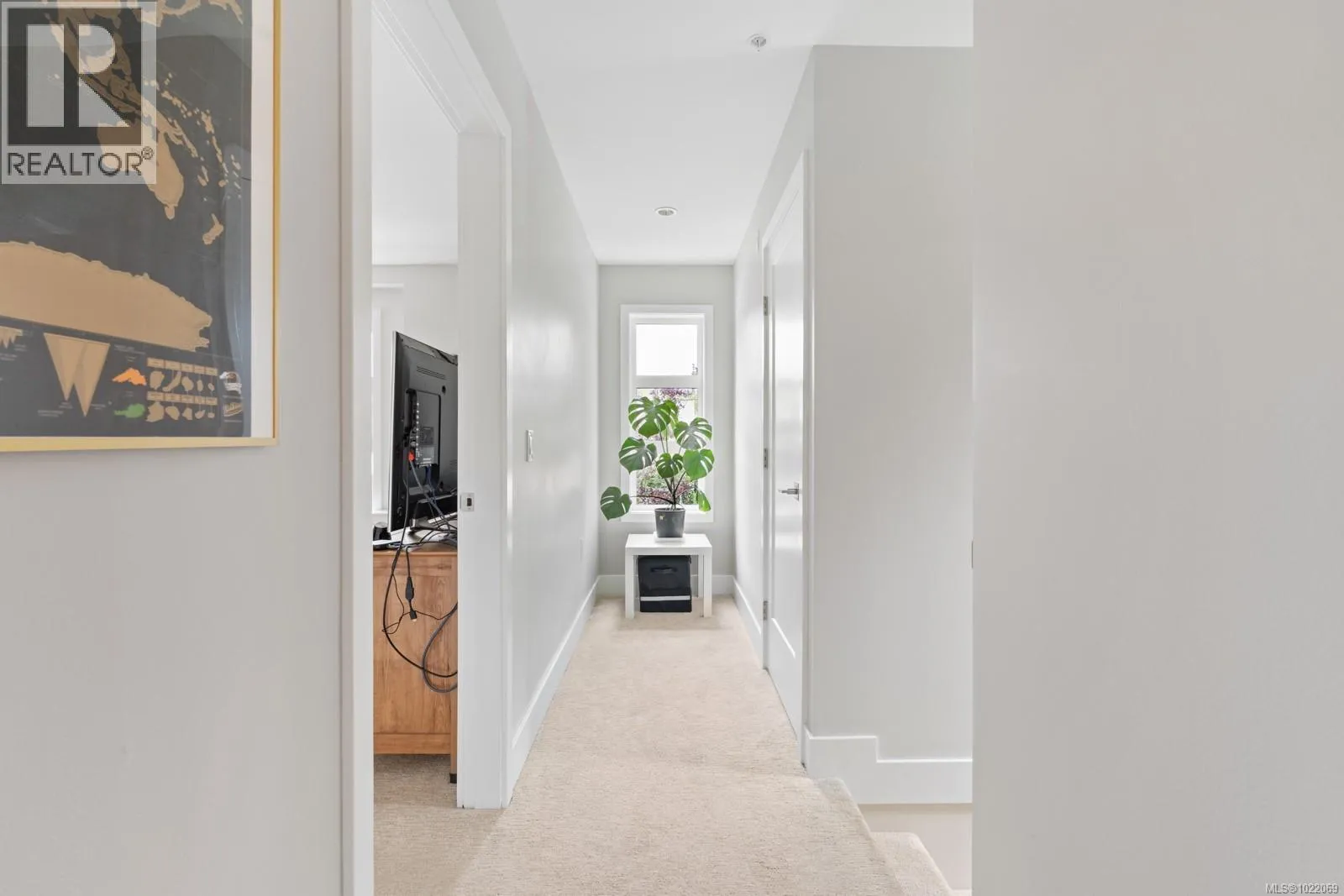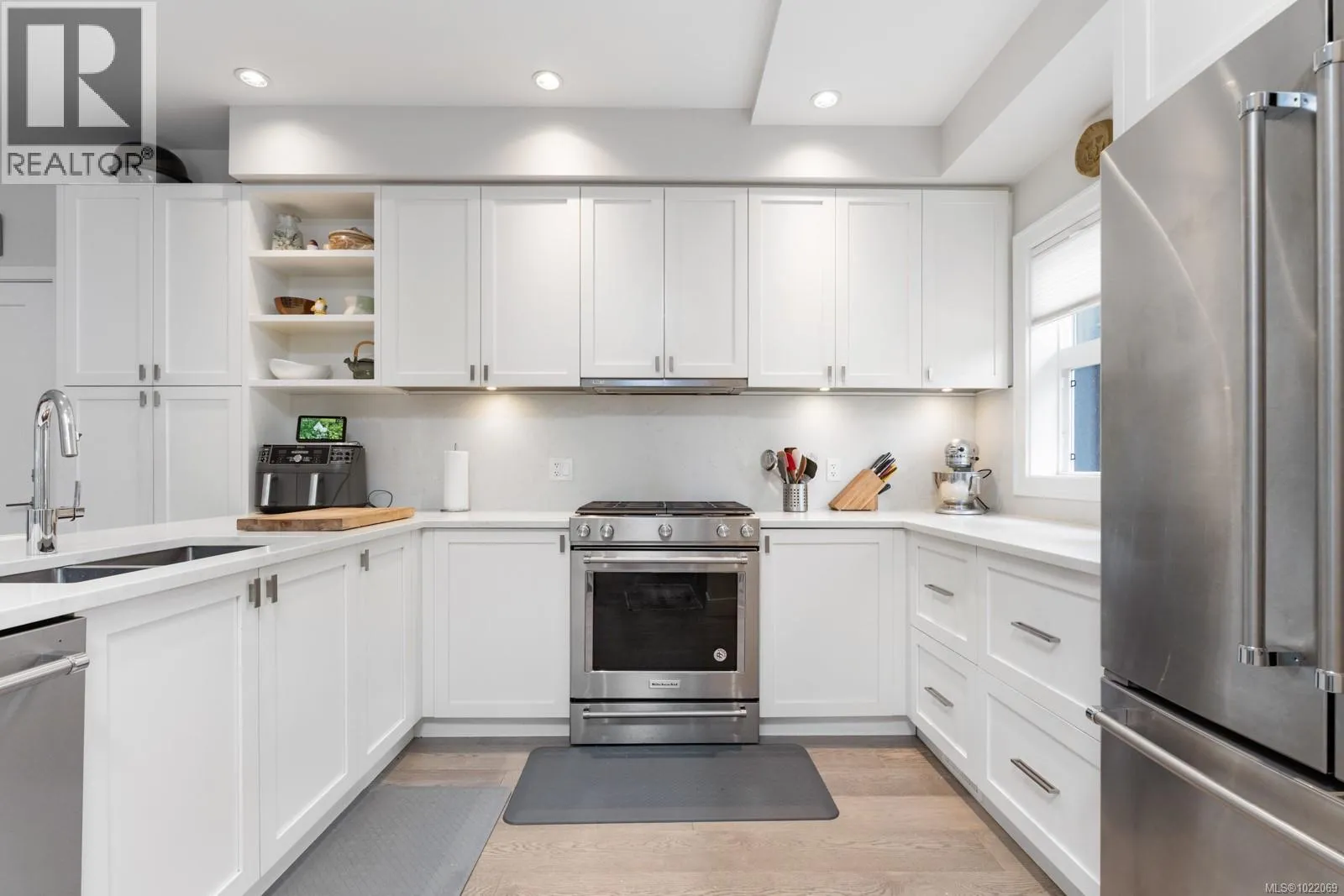Welcome to Seahaven, a locally inspired boutique development in an unparalleled Sidney location. Townhome 7 is a desirable end unit, and is one of only 4 with the large ground lvl side patio. Faultless features include wood flooring, high ceilings, EV-wired garages and more. On the main, a designer kitchen is fitted with chic white cabinetry, quartz counters and upscale SS appliances w/gas range. The open concept living/dining is flooded with natural light, and boasts cozy gas FP & french doors leading to the private patio. A good sized bedroom, laundry room and 3P bathroom completes. *This level is also wheelchair accessible*. Upstairs, you will find a lavish primary suite w/walk in closet, sumptuous 4P ensuite, and access to your private deck. Down the hall, another large bedroom and 4P bathroom. Lastly, a massive flex space lends itself to either a family room or bedroom. Located steps to shops, dining & parks, this is your opportunity to live the urban seaside lifestyle. (id:27476)