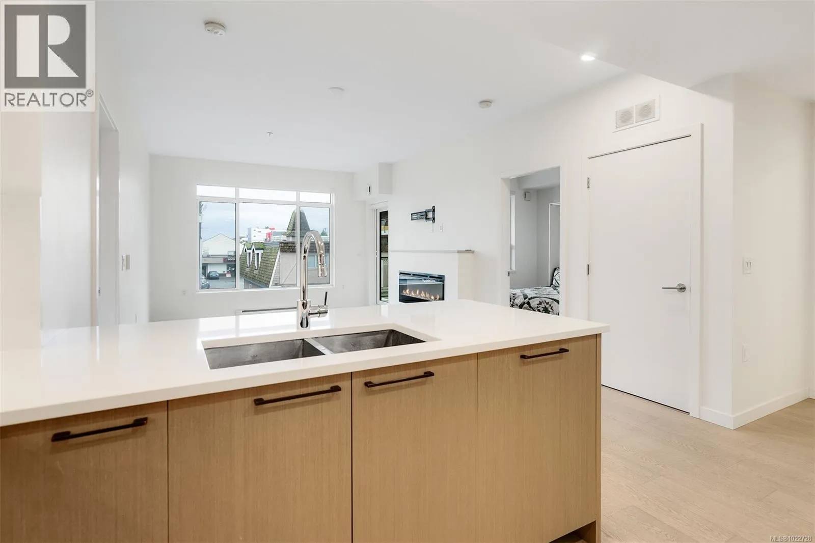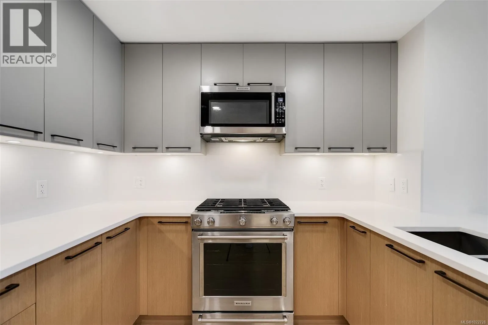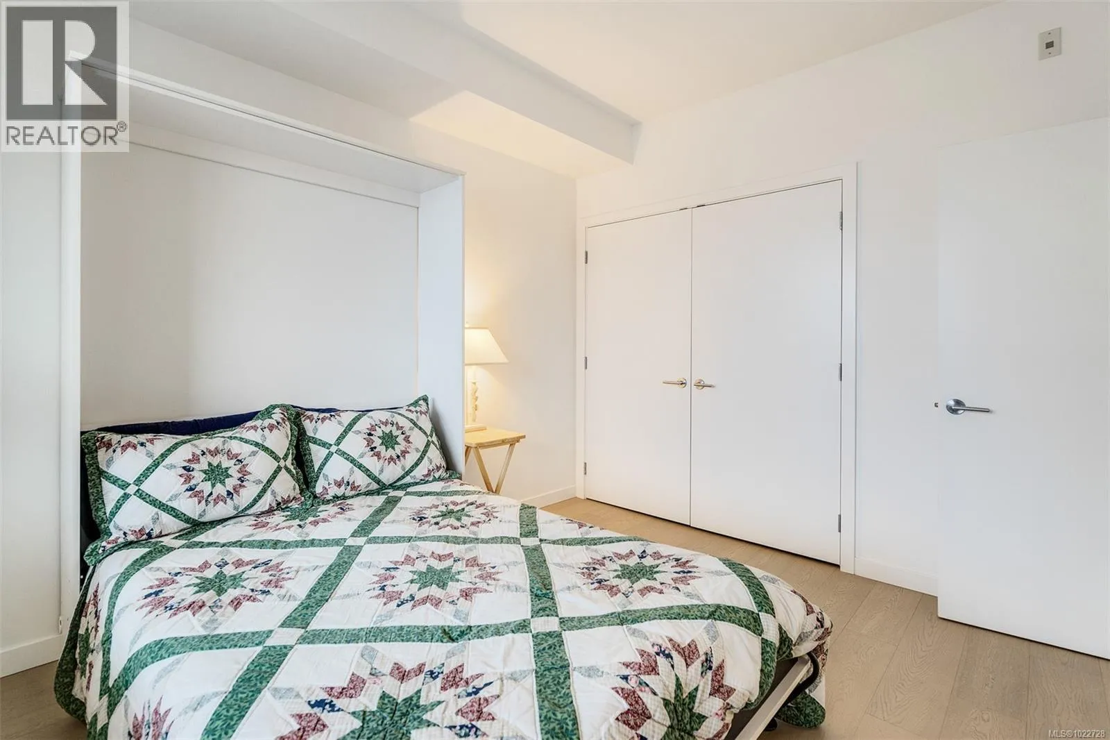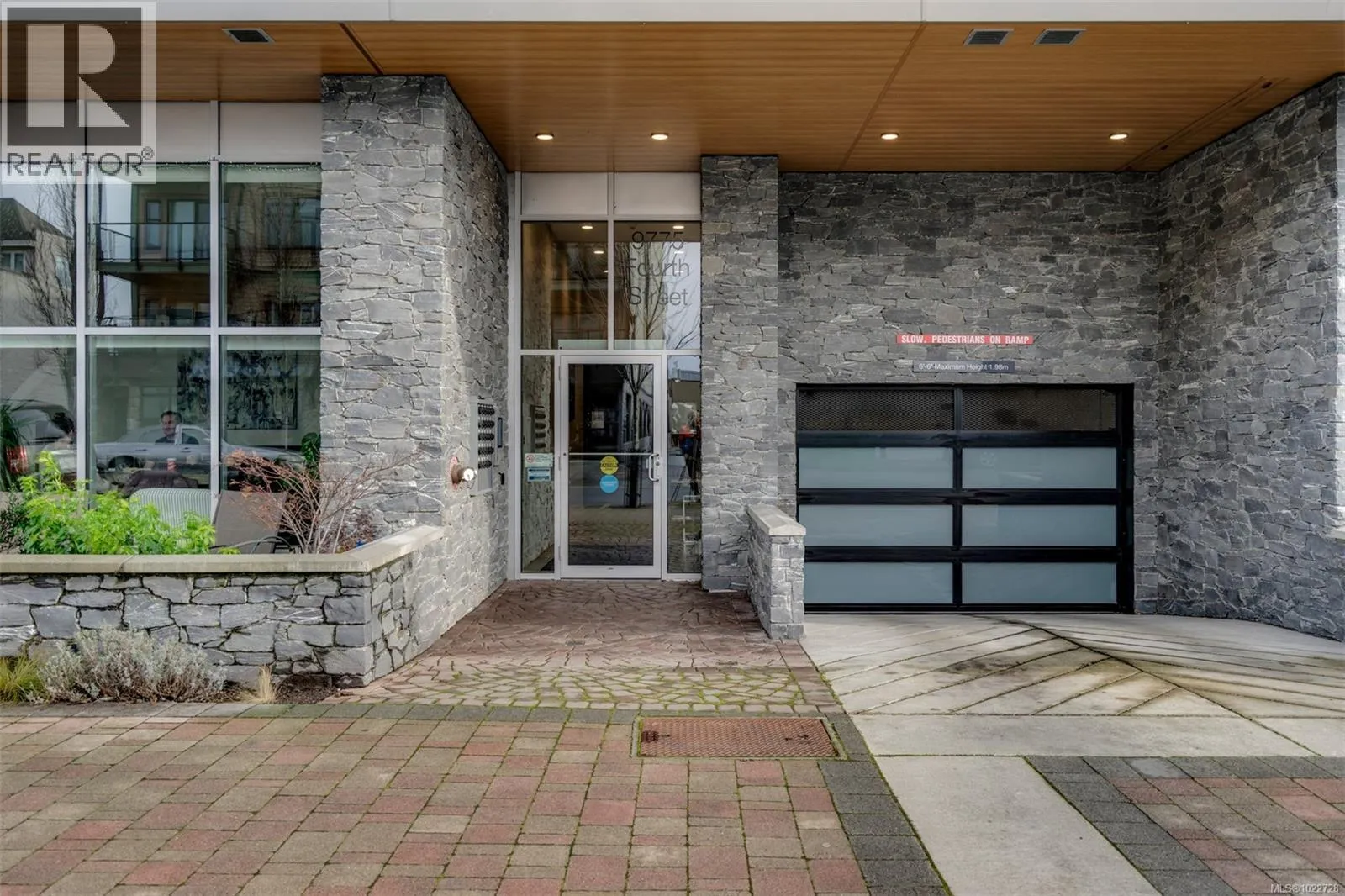 Two bedroom two full bathroom plus large den unit at The Quartet in downtown Sidney! Immaculate condition, durable construction built in 2019 and ready for immediate occupancy. Large 1060sqft floorplan plus 100sqft covered balcony with gas outlet for year round enjoyment to enjoy sunrises and your morning coffee. Unit features nine foot ceilings, open concept design with bedrooms on opposite sides, large 10x7 den/office a very flexible space, primary bedroom with double closets and ensuite with walk-in shower and heated floors, cozy living room with feature fireplace, hardwood floors, large windows, gourmet kitchen with Kitchen-Aid stainless steel appliance package and quartz countertops, insuite laundry and secure underground parking stall! Built for convenience and accessibility in mind. Centrally located just off the Avenue in Sidney for easy walking access to all levels of amenities and the ocean nearby. Dogs or cats allowed, 2 of any size! Ideal for retirees or downsizers! (id:27476)