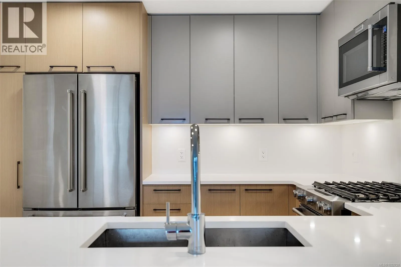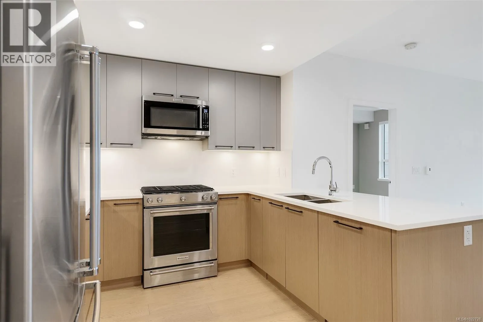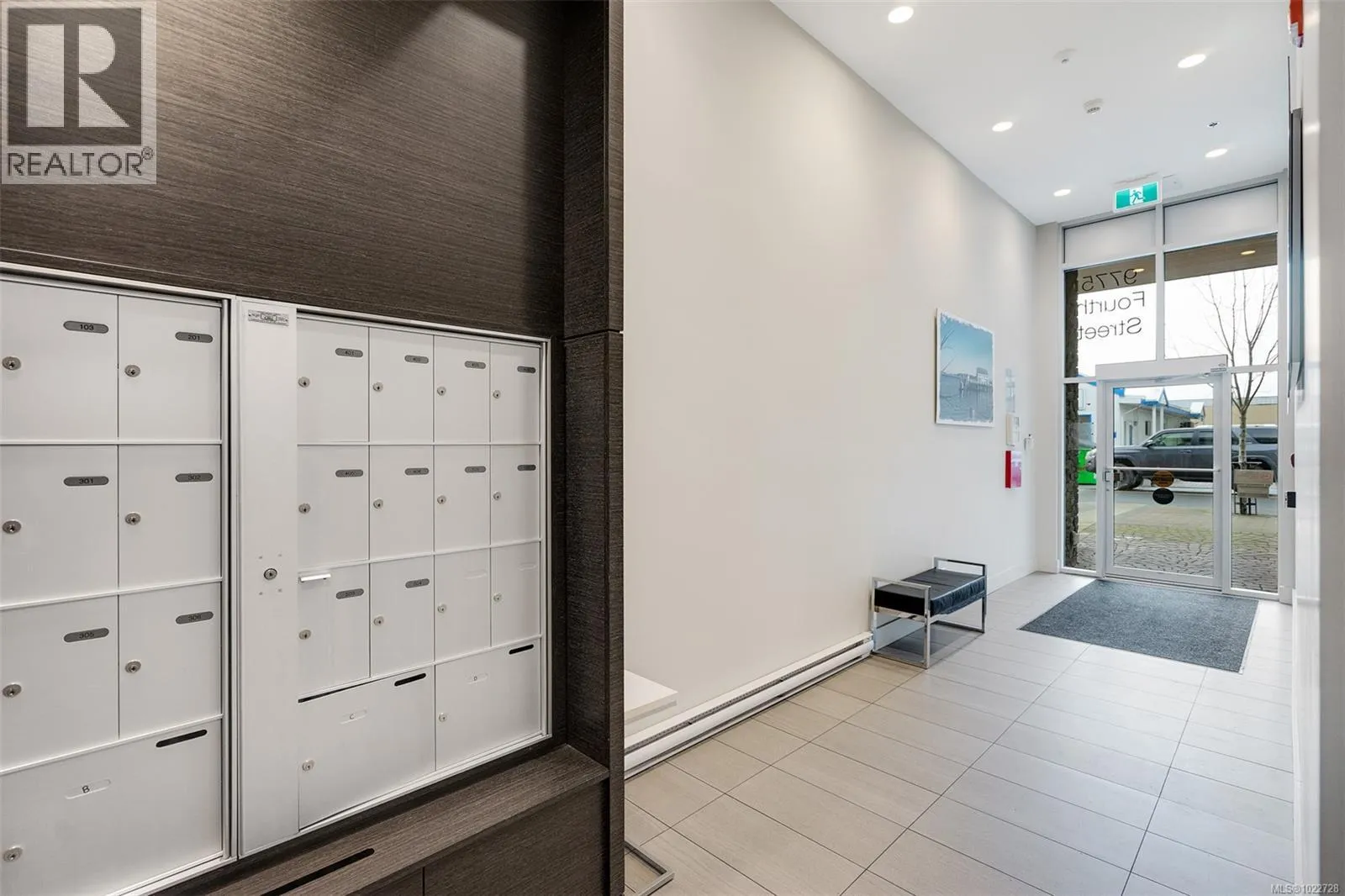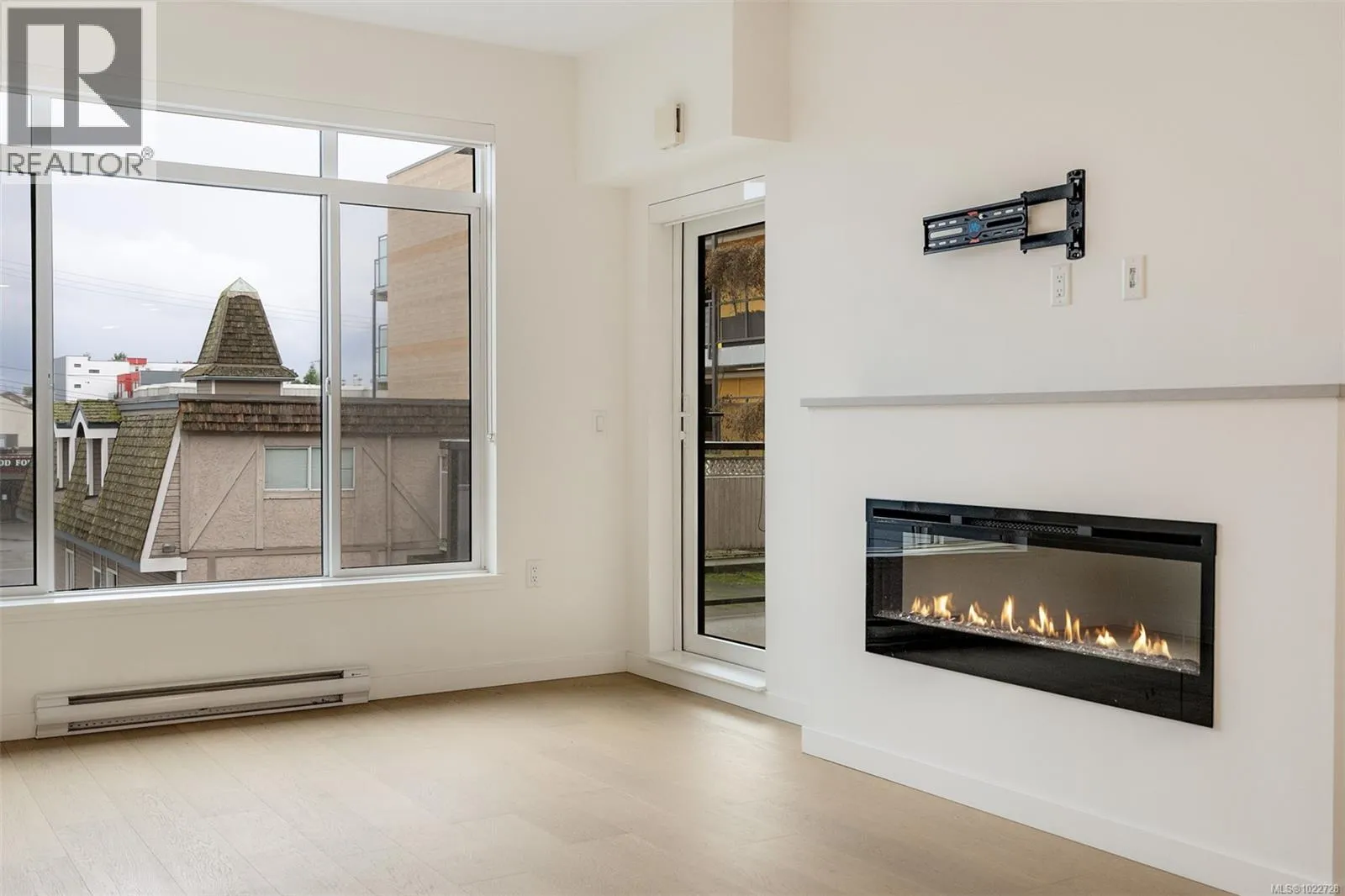 Two bedroom two full bathroom plus large den unit at The Quartet in downtown Sidney! Immaculate condition, durable construction built in 2019 and ready for immediate occupancy. Large 1060sqft floorplan plus 100sqft covered balcony with gas outlet for year round enjoyment to enjoy sunrises and your morning coffee. Unit features nine foot ceilings, open concept design with bedrooms on opposite sides, large 10x7 den/office a very flexible space, primary bedroom with double closets and ensuite with walk-in shower and heated floors, cozy living room with feature fireplace, hardwood floors, large windows, gourmet kitchen with Kitchen-Aid stainless steel appliance package and quartz countertops, insuite laundry and secure underground parking stall! Built for convenience and accessibility in mind. Centrally located just off the Avenue in Sidney for easy walking access to all levels of amenities and the ocean nearby. Dogs or cats allowed, 2 of any size! Ideal for retirees or downsizers! (id:27476)