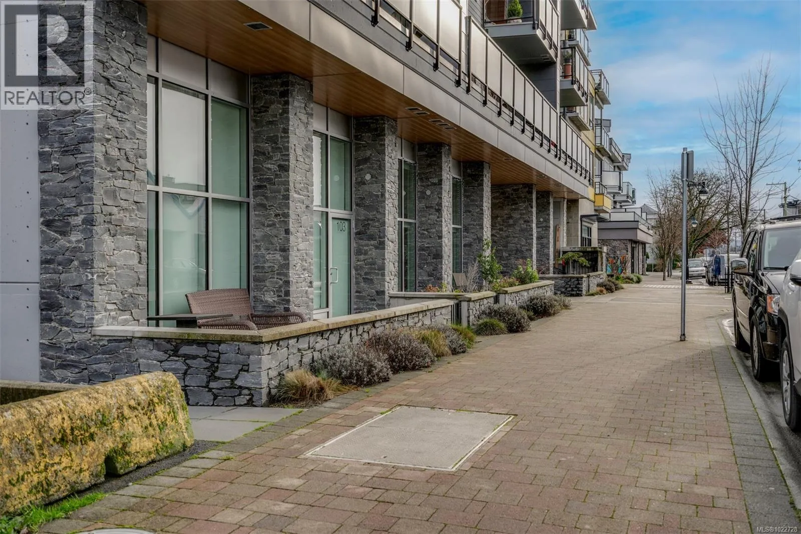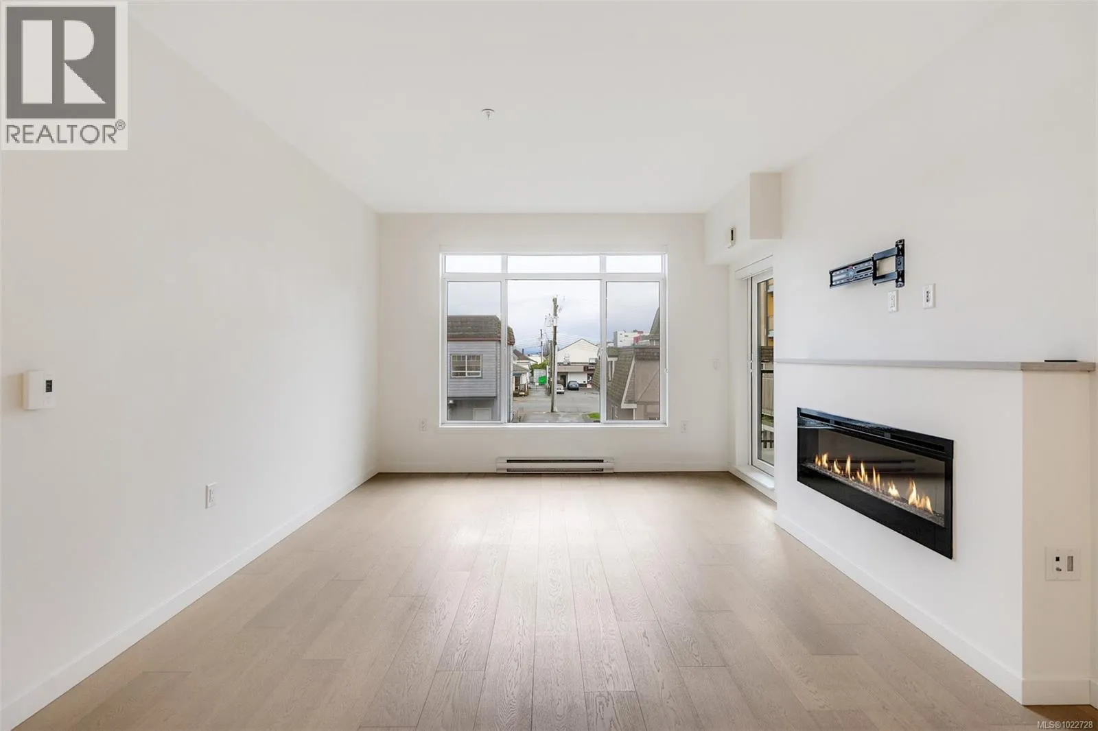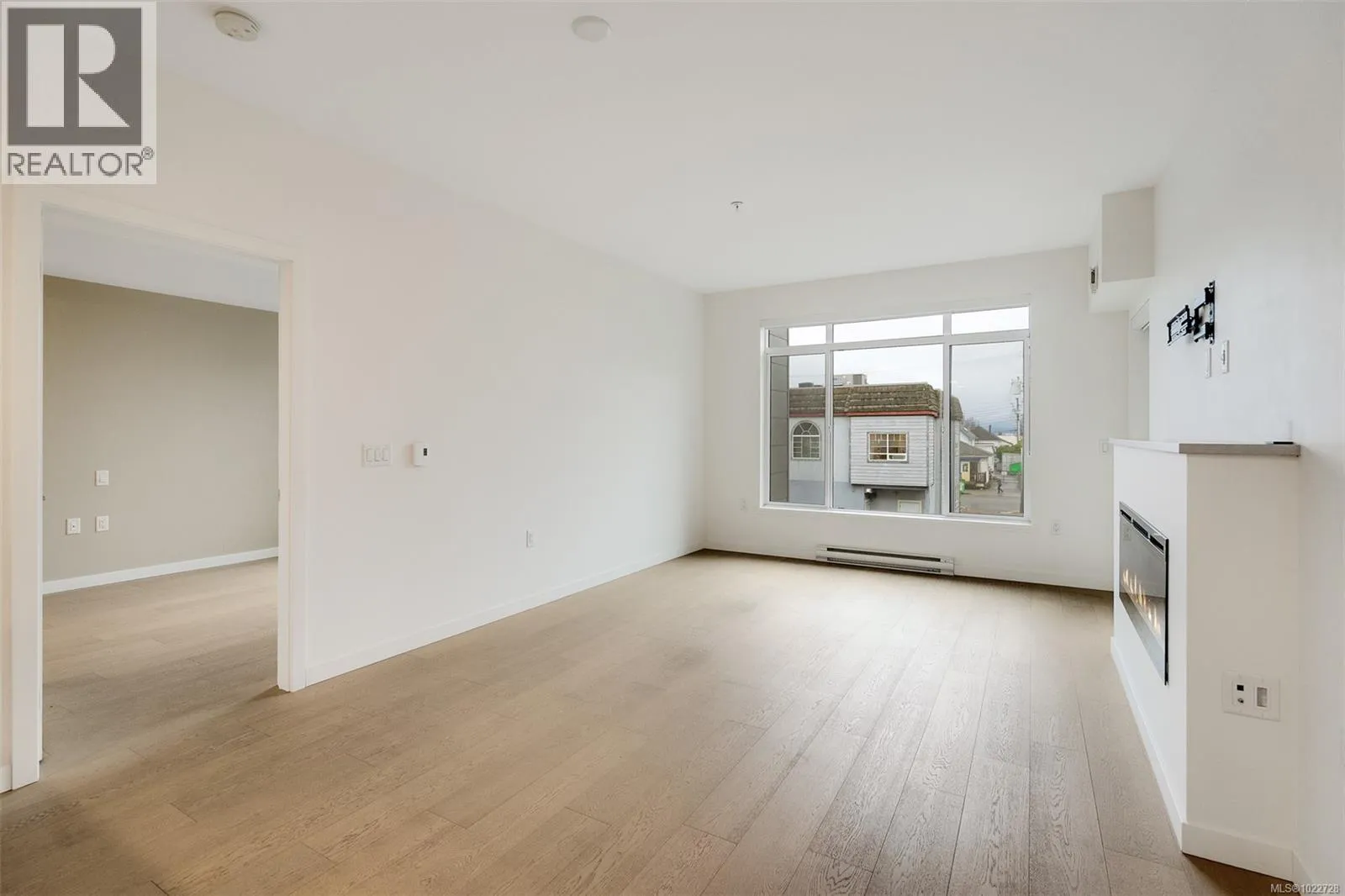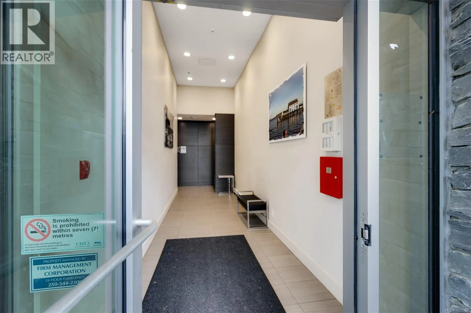 Two bedroom two full bathroom plus large den unit at The Quartet in downtown Sidney! Immaculate condition, durable construction built in 2019 and ready for immediate occupancy. Large 1060sqft floorplan plus 100sqft covered balcony with gas outlet for year round enjoyment to enjoy sunrises and your morning coffee. Unit features nine foot ceilings, open concept design with bedrooms on opposite sides, large 10x7 den/office a very flexible space, primary bedroom with double closets and ensuite with walk-in shower and heated floors, cozy living room with feature fireplace, hardwood floors, large windows, gourmet kitchen with Kitchen-Aid stainless steel appliance package and quartz countertops, insuite laundry and secure underground parking stall! Built for convenience and accessibility in mind. Centrally located just off the Avenue in Sidney for easy walking access to all levels of amenities and the ocean nearby. Dogs or cats allowed, 2 of any size! Ideal for retirees or downsizers! (id:27476)