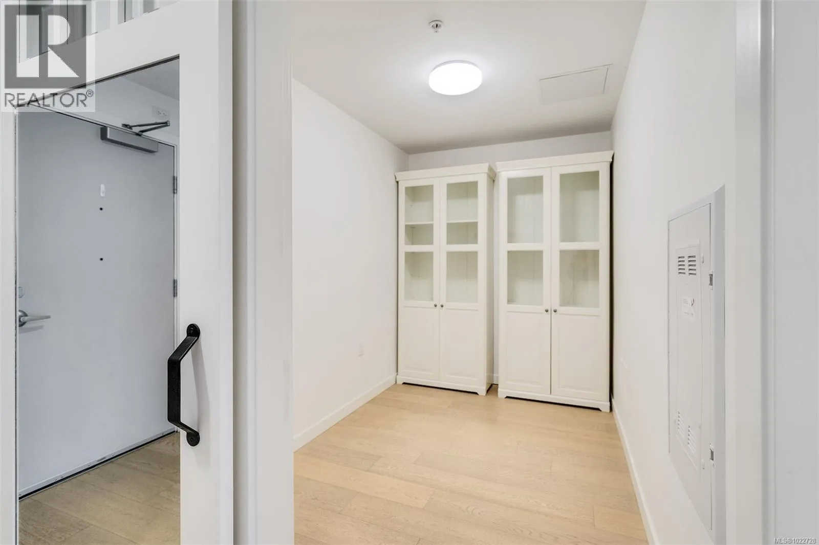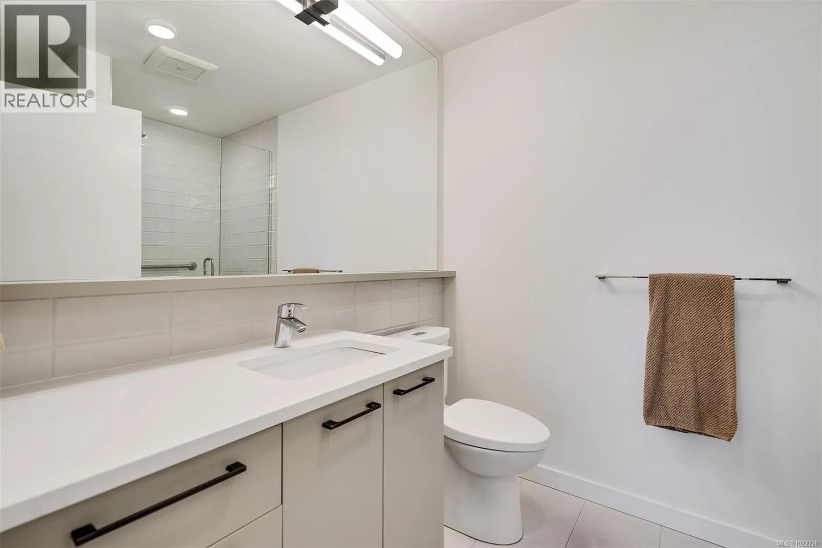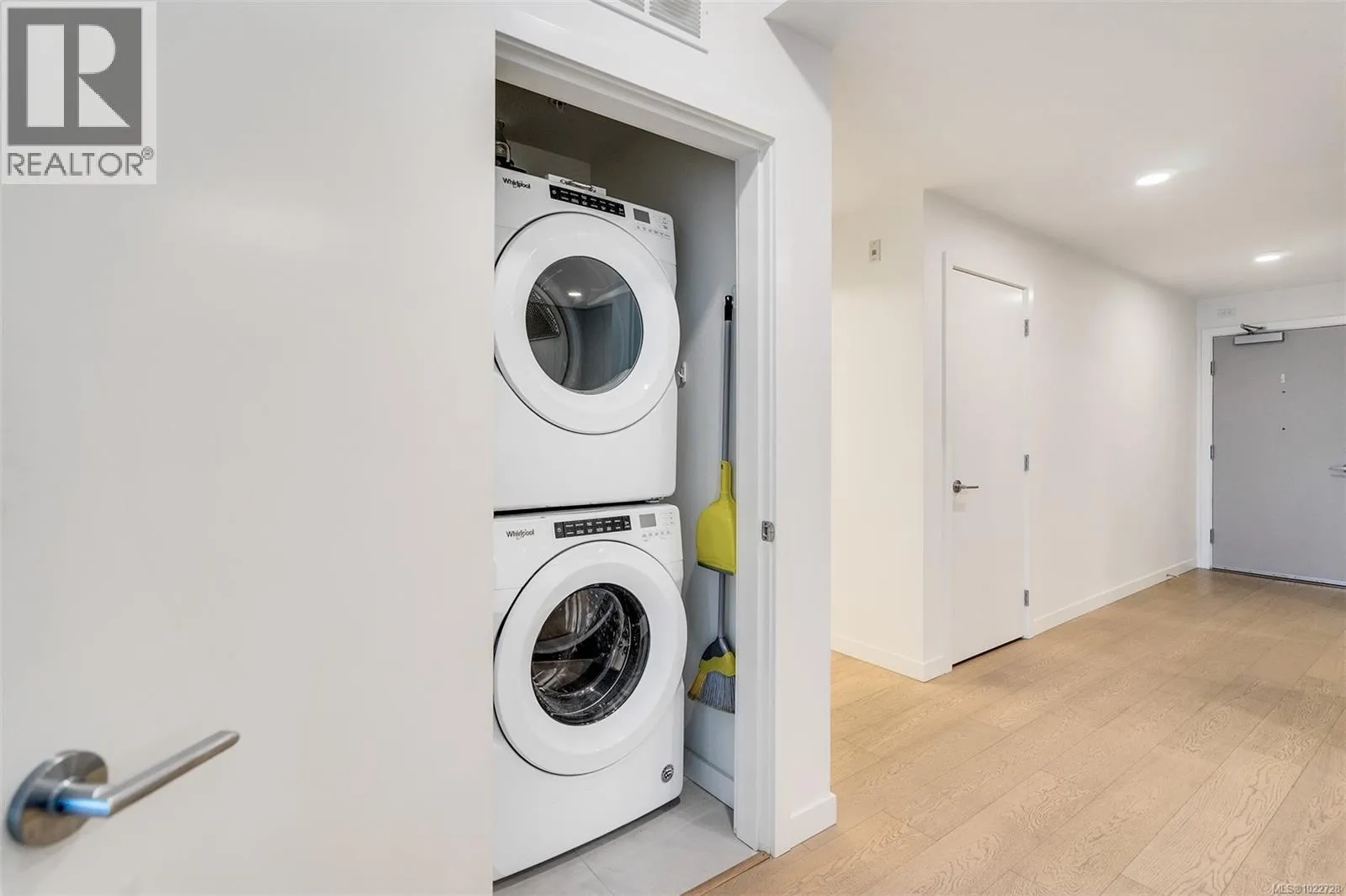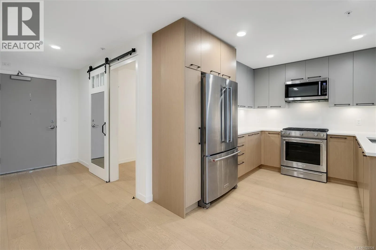 Two bedroom two full bathroom plus large den unit at The Quartet in downtown Sidney! Immaculate condition, durable construction built in 2019 and ready for immediate occupancy. Large 1060sqft floorplan plus 100sqft covered balcony with gas outlet for year round enjoyment to enjoy sunrises and your morning coffee. Unit features nine foot ceilings, open concept design with bedrooms on opposite sides, large 10x7 den/office a very flexible space, primary bedroom with double closets and ensuite with walk-in shower and heated floors, cozy living room with feature fireplace, hardwood floors, large windows, gourmet kitchen with Kitchen-Aid stainless steel appliance package and quartz countertops, insuite laundry and secure underground parking stall! Built for convenience and accessibility in mind. Centrally located just off the Avenue in Sidney for easy walking access to all levels of amenities and the ocean nearby. Dogs or cats allowed, 2 of any size! Ideal for retirees or downsizers! (id:27476)
