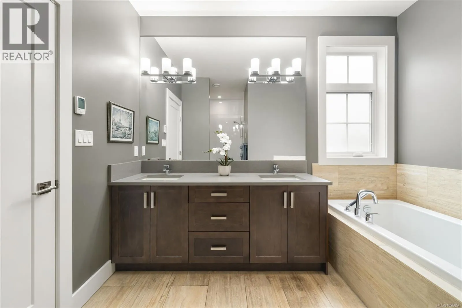 This beautifully maintained 2,631 sq ft, 4-bedroom, 4-bathroom home sits on a private 4,030 sq ft lot (buyer to verify if important) and is completely move-in ready. Built in 2015, it features 10-foot ceilings, a bright open-concept layout, and engineered plank-style hardwood floors throughout the main living areas. The main level offers spacious living and dining rooms with a cozy gas fireplace, a sleek gourmet kitchen with quartz Caesarstone countertops, a large island, abundant soft-close cabinetry, pantry space, and quality Whirlpool and Bosch stainless steel appliances. The primary bedroom is also on the main level, complete with a spa-inspired five-piece ensuite and a generous walk-in closet. Two large bedrooms are located upstairs. An exceptionally private one-bedroom suite generates $1,800 per month and offers true separation with enhanced soundproofing, its own hydro meter, dedicated hot water tank, separate Canada Postâregistered address, six appliances including a brand-new washer and dryer, and flexible month-to-month tenancy. Additional features include a heat pump, hot water on demand, heated crawl space and garage, central vacuum, Illusion blinds, fresh interior and exterior paint, three parking areas, and ample storage. Outdoor living shines with a covered patio for year-round use, irrigation with drip lines, and three exterior storage sheds. Ideally located in a prime, walkable neighbourhood close to schools, parks, transit, and shopping, just 15 minutes to the airport and ferries and 30 minutes to downtown Victoria. Incredible neighbourhood with a strong sense of community, featuring organized initiatives such as a shared community snowblower (1/6 ownership per home), emergency preparedness plans, book nook and food bank bottle collections. Book your showing today! (id:27476)