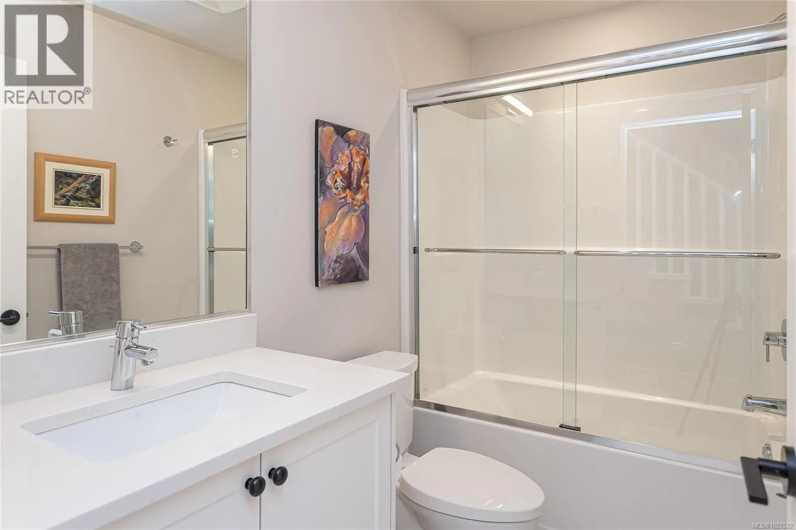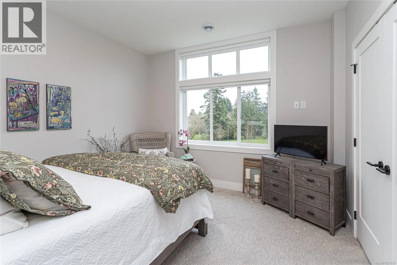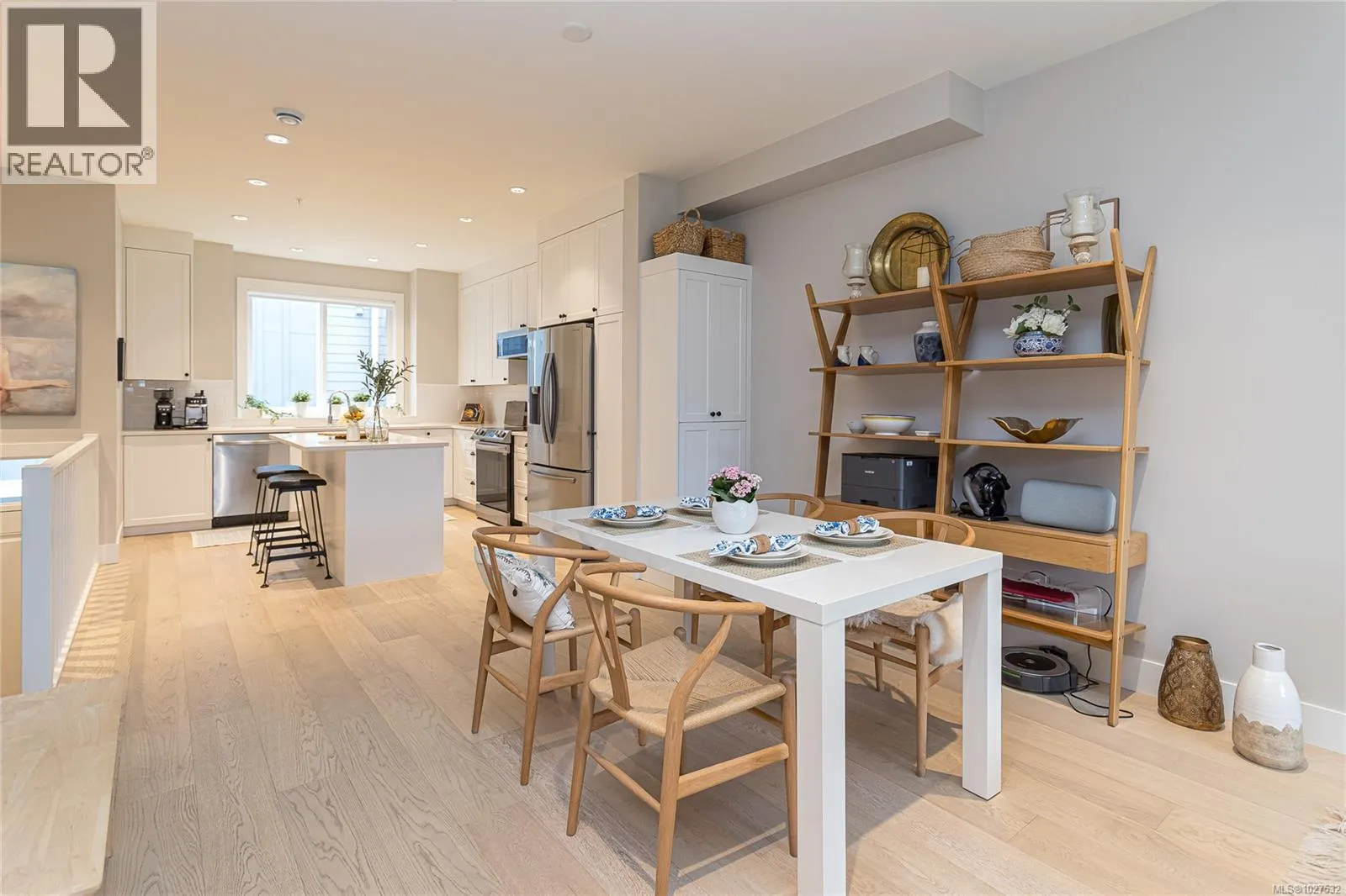 Tucked away on the quiet side of the complex and backing directly onto Melville Park, this nearly new 3-bedroom, 4-bathroom townhome offers privacy, green space, and exceptional walkability. The smart layout features two upper-level bedrooms, each with its own ensuite, plus a third bedroom and full bathroom on the lower levelâideal for guests, teens, or a home office. The bright main floor features 9' ceilings, large windows with peaceful park views, quartz countertops, full-height cabinetry, and a spacious island for entertaining. Enjoy year-round comfort with an efficient ducted heat pump and wall unit for heating and cooling. A sunny, south-facing fenced patio provides the perfect space for gardening or relaxing. Heated bathroom floors, full-size laundry, a powder room, and an oversized EV-ready garage add to the homeâs appeal. Walk to schools, the beach, oceanfront trails, and downtown Sidney in minutes. (id:27476)
