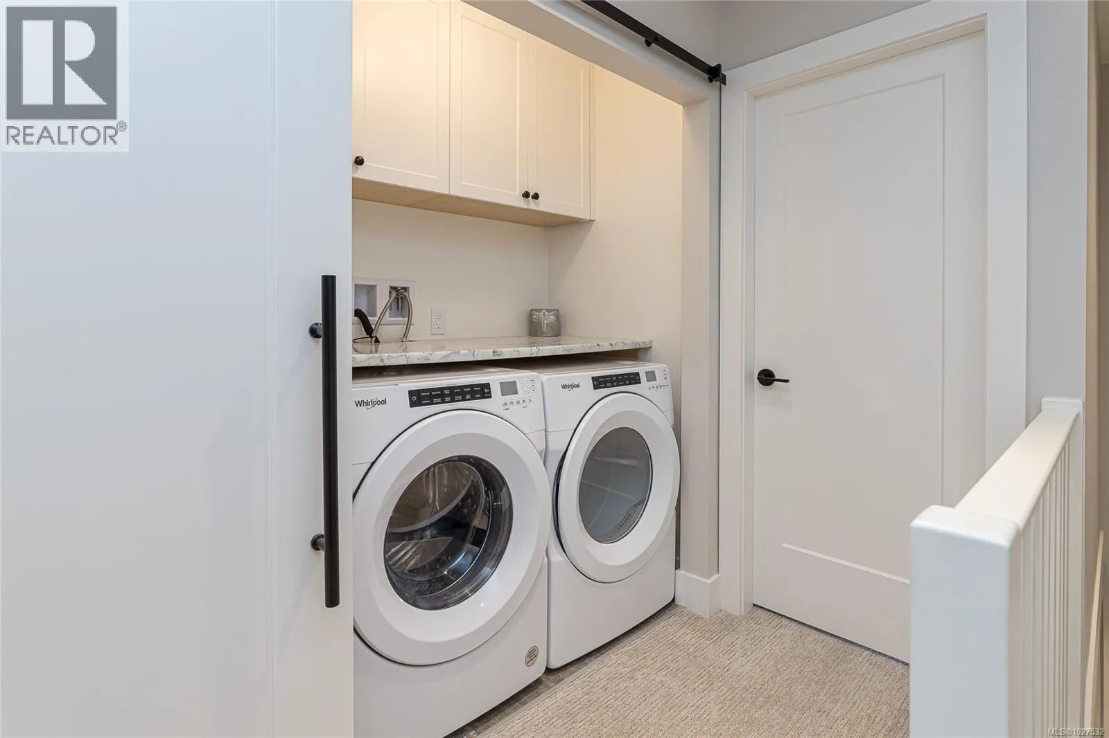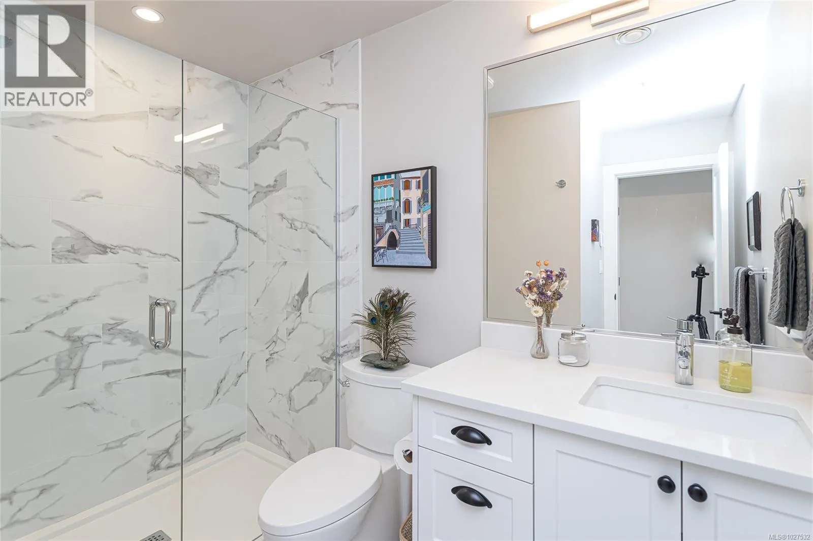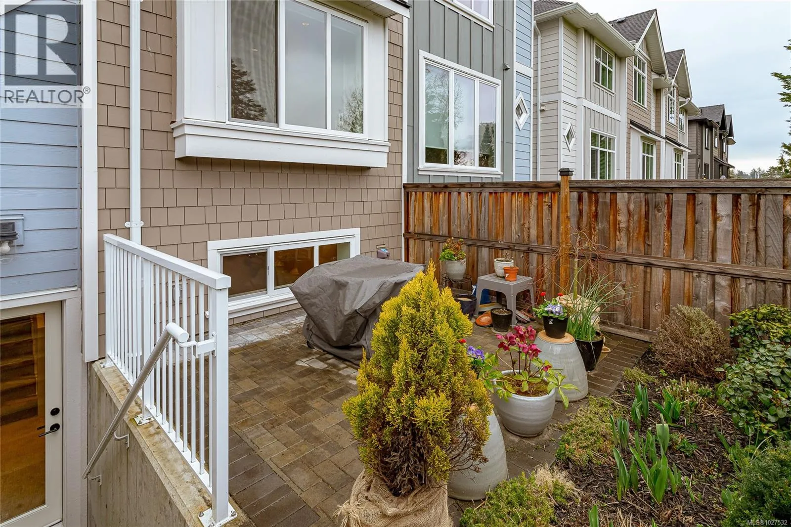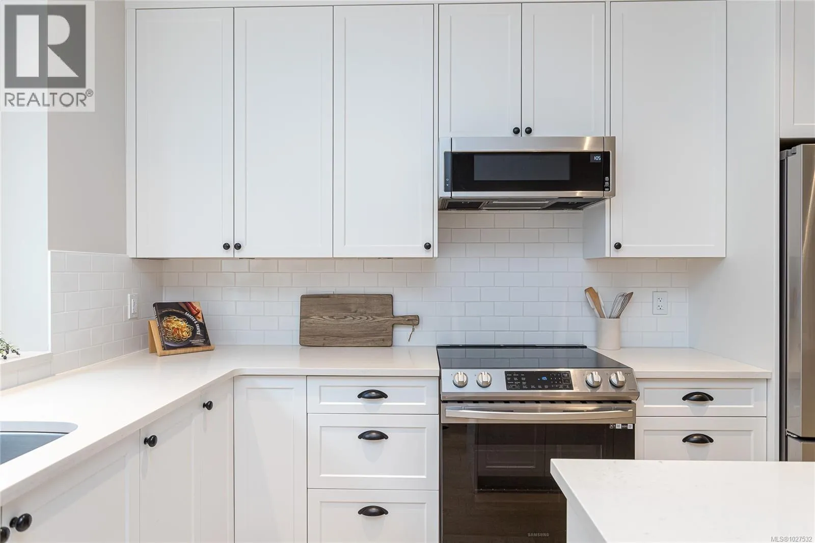 Tucked away on the quiet side of the complex and backing directly onto Melville Park, this nearly new 3-bedroom, 4-bathroom townhome offers privacy, green space, and exceptional walkability. The smart layout features two upper-level bedrooms, each with its own ensuite, plus a third bedroom and full bathroom on the lower levelâideal for guests, teens, or a home office. The bright main floor features 9' ceilings, large windows with peaceful park views, quartz countertops, full-height cabinetry, and a spacious island for entertaining. Enjoy year-round comfort with an efficient ducted heat pump and wall unit for heating and cooling. A sunny, south-facing fenced patio provides the perfect space for gardening or relaxing. Heated bathroom floors, full-size laundry, a powder room, and an oversized EV-ready garage add to the homeâs appeal. Walk to schools, the beach, oceanfront trails, and downtown Sidney in minutes. (id:27476)