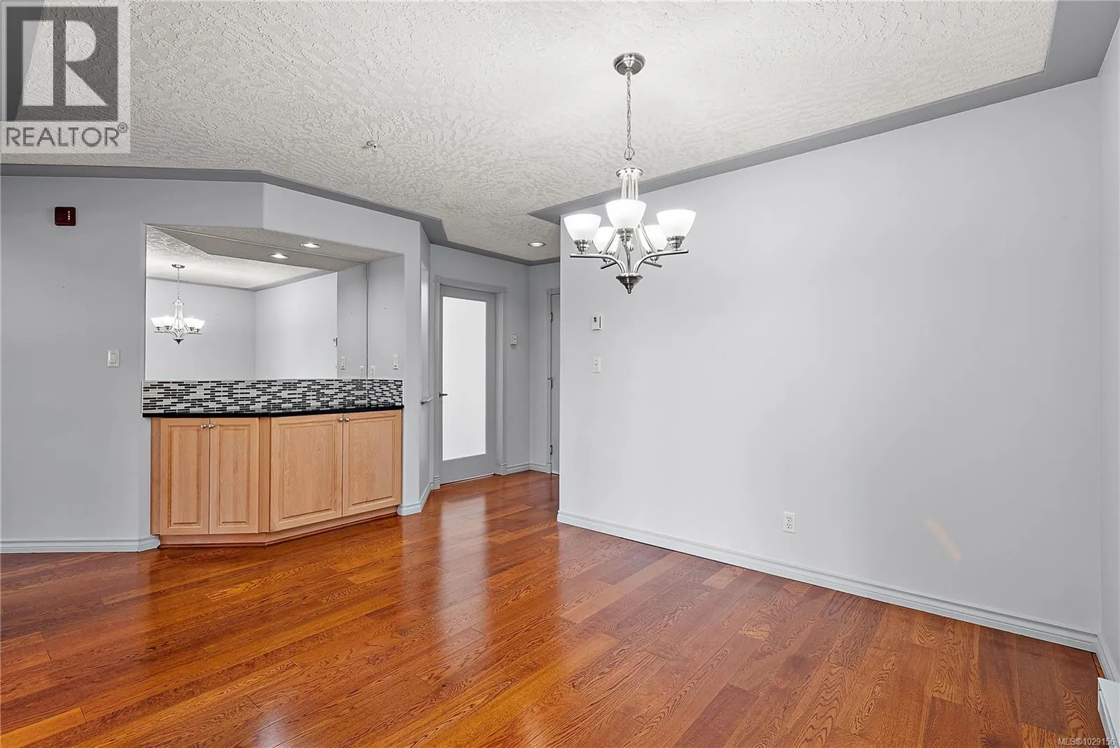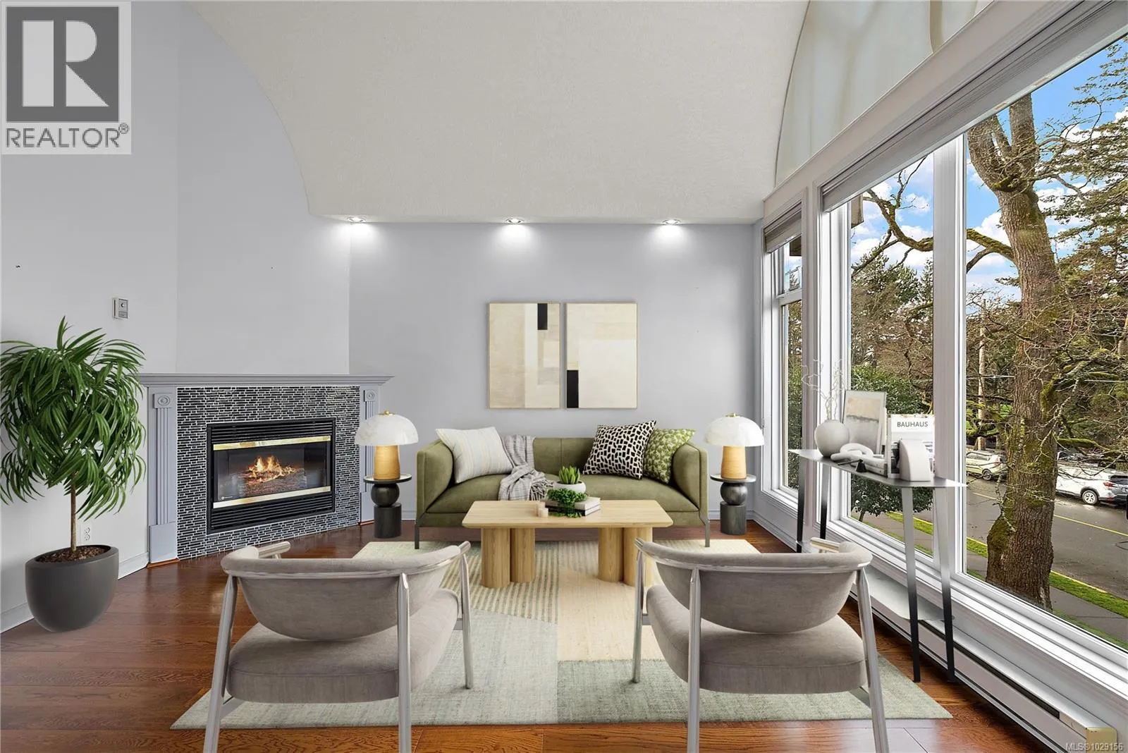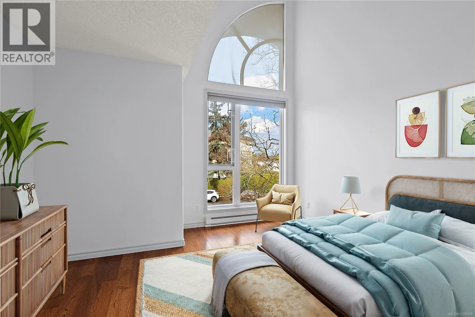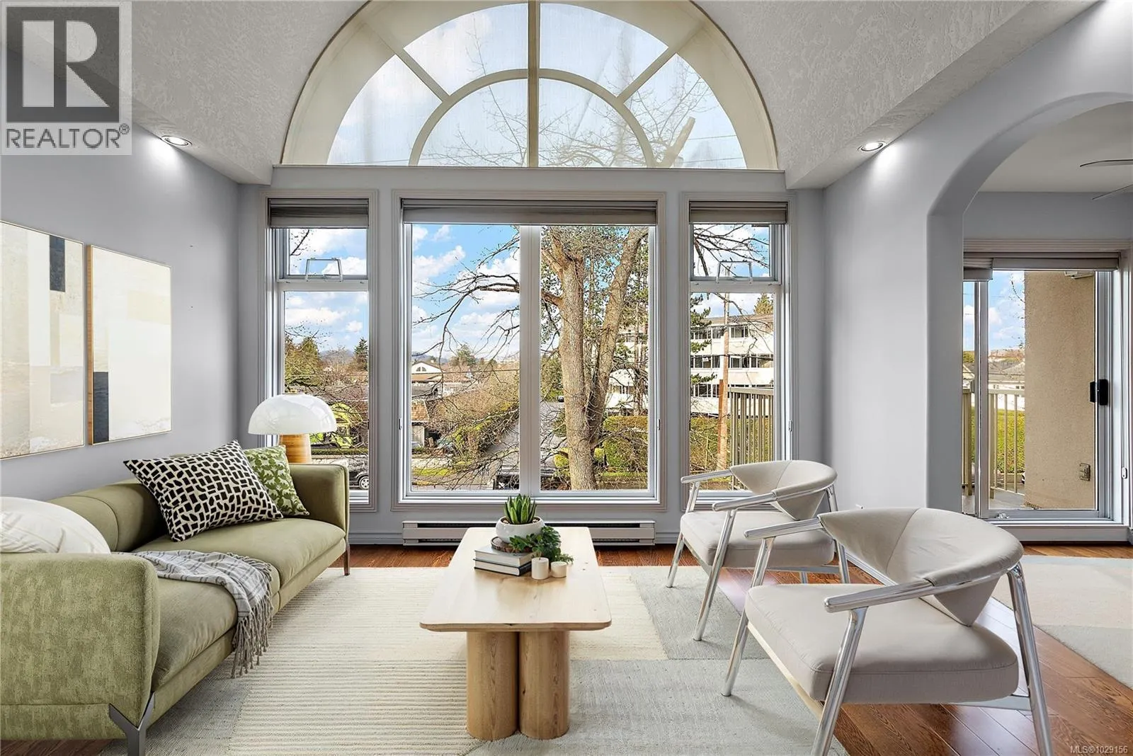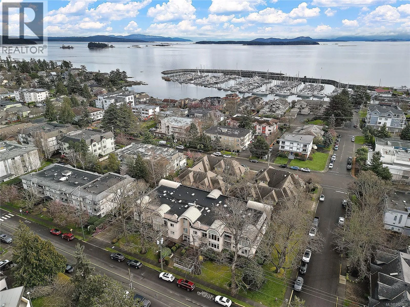 Welcome to The Marlena, one of downtown Sidneyâs most sought-after condominium residences. This beautifully updated top-floor unit offers 1,161 sq ft of bright and inviting living space with high vaulted ceilings and impressive floor-to-ceiling windows that fill the home with natural light. The desirable west-facing exposure provides a warm, sunny outlook over the surrounding neighbourhood and lovely sunsets from your private deck. The spacious layout features a large living room, separate dining area, and an updated kitchen with quartz countertops, quality appliances, and a convenient eating area. The home has been tastefully updated throughout, including wood floors, updated bathrooms, and new window coverings, creating a move-in ready space that blends comfort and style. There are two generously sized bedrooms and two full bathrooms, including a well-appointed primary bedroom with excellent closet space. A separate laundry room with additional storage adds convenience and functionality. This exceptionally well-maintained building offers just 14 units, creating a quiet and welcoming community. Additional features include secure underground parking and a large storage locker. Ideally located just steps from Beacon Avenue, youâll enjoy easy access to Sidneyâs charming shops, restaurants, transit, and the beautiful oceanfront walkways. Opportunities to own in this highly regarded building rarely come available, making this a fantastic chance to enjoy comfortable, low-maintenance living in the heart of Sidney. (id:27476)
