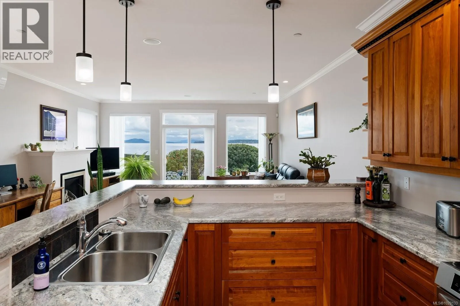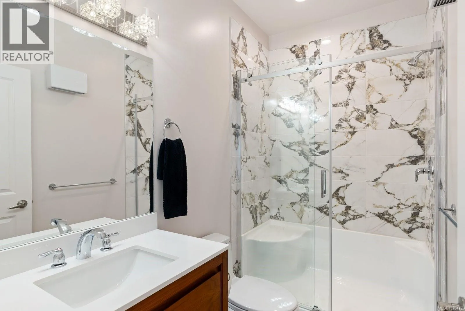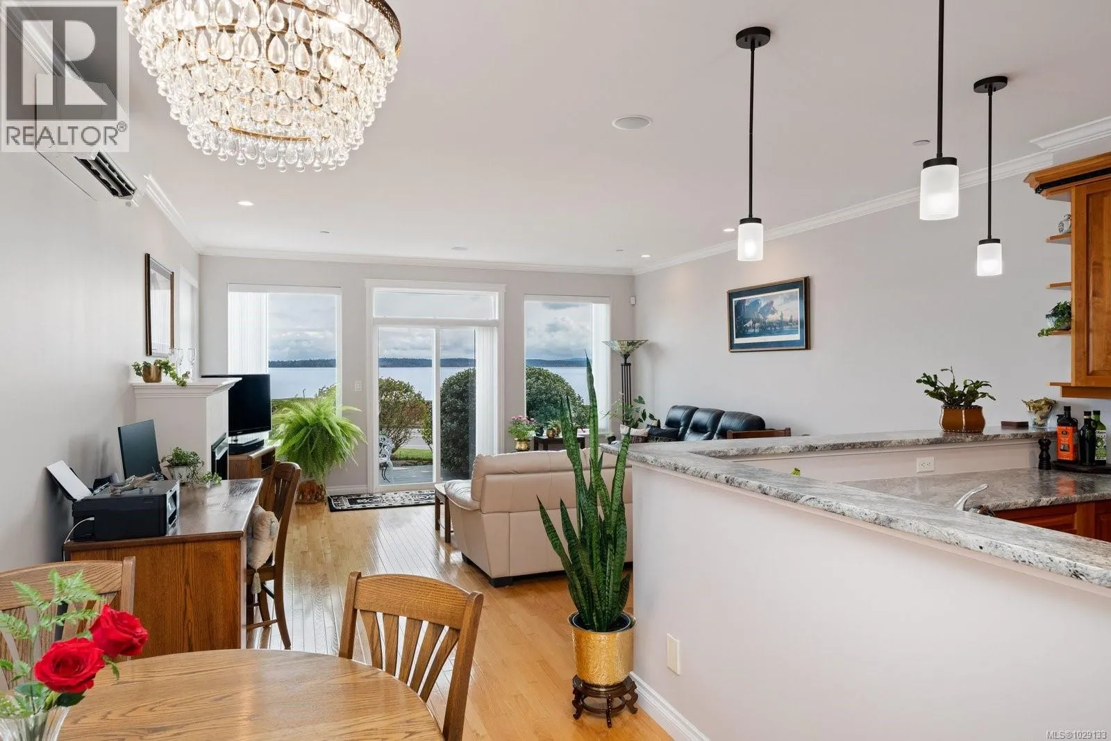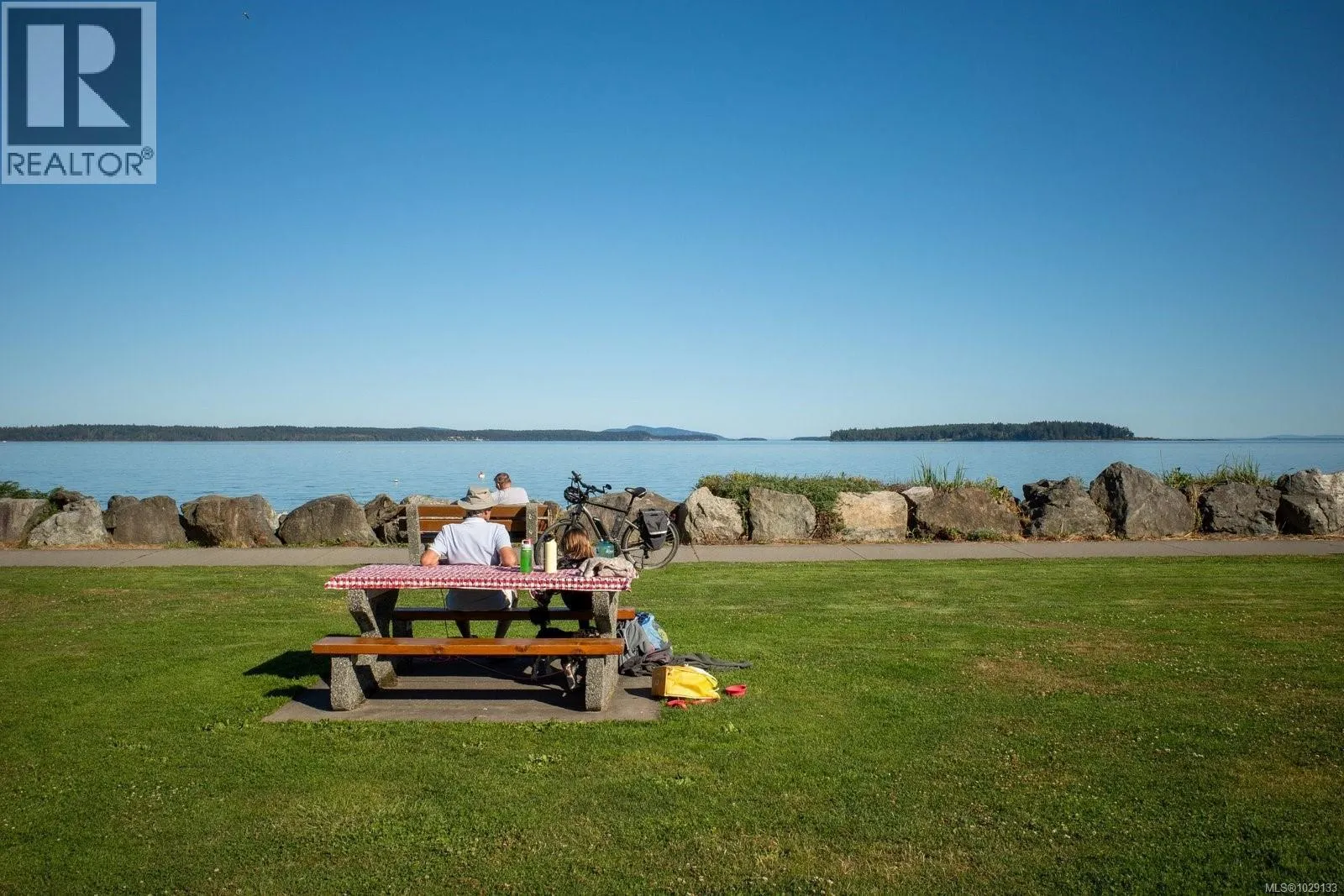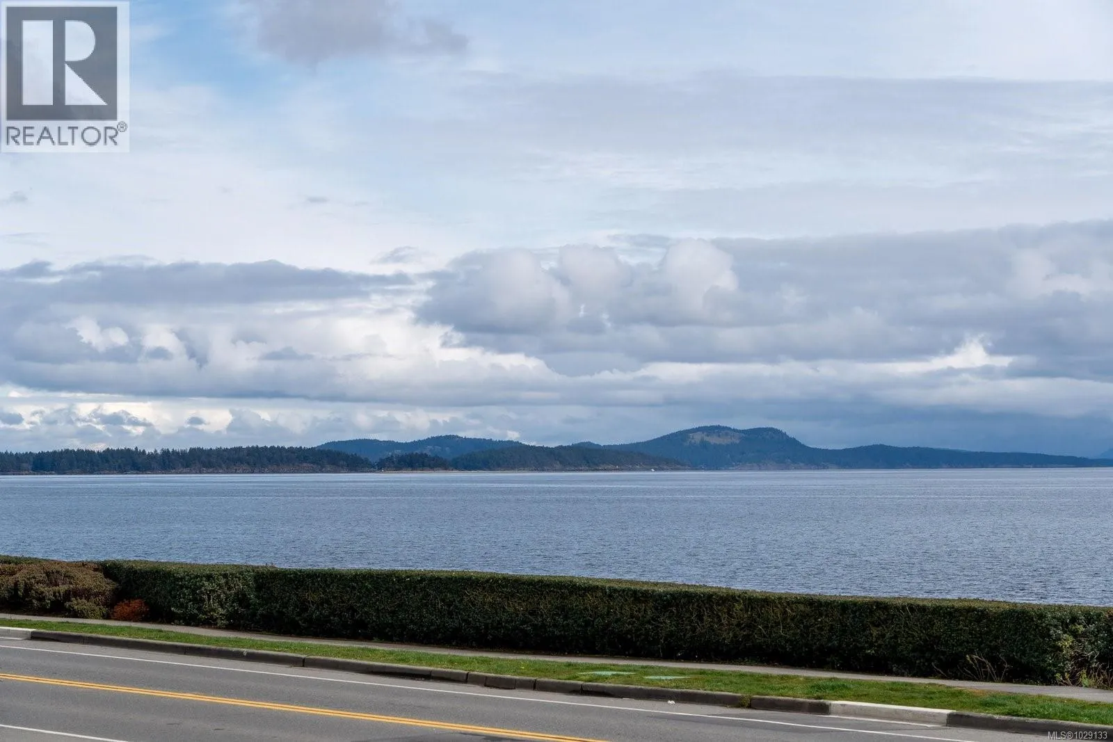 This freshly updated 2,000 sf half-duplex boasts spectacular uninterrupted ocean, island and mountain views. The sun-filled main level features open kitchen, living and dining rooms with a new Valor gas fireplace, hardwood floors and air conditioning. This level also has a renovated 3-piece bathroom and a bedroom/office that opens to the private west facing fenced backyard. Upstairs offers a primary bedroom with a fireplace and a/c, a flex room (that can easily be added back to the primary bedroom), full ensuite with heated floors, an office nook, laundry room, plus an additional bedroom with a 3-piece ensuite. There is plenty of storage throughout the home and a secure detached garage plus a parking stall. Located across from Lochside waterfront park and within walking distance to downtown Sidney, this is a mint condition gem! (id:27476)
