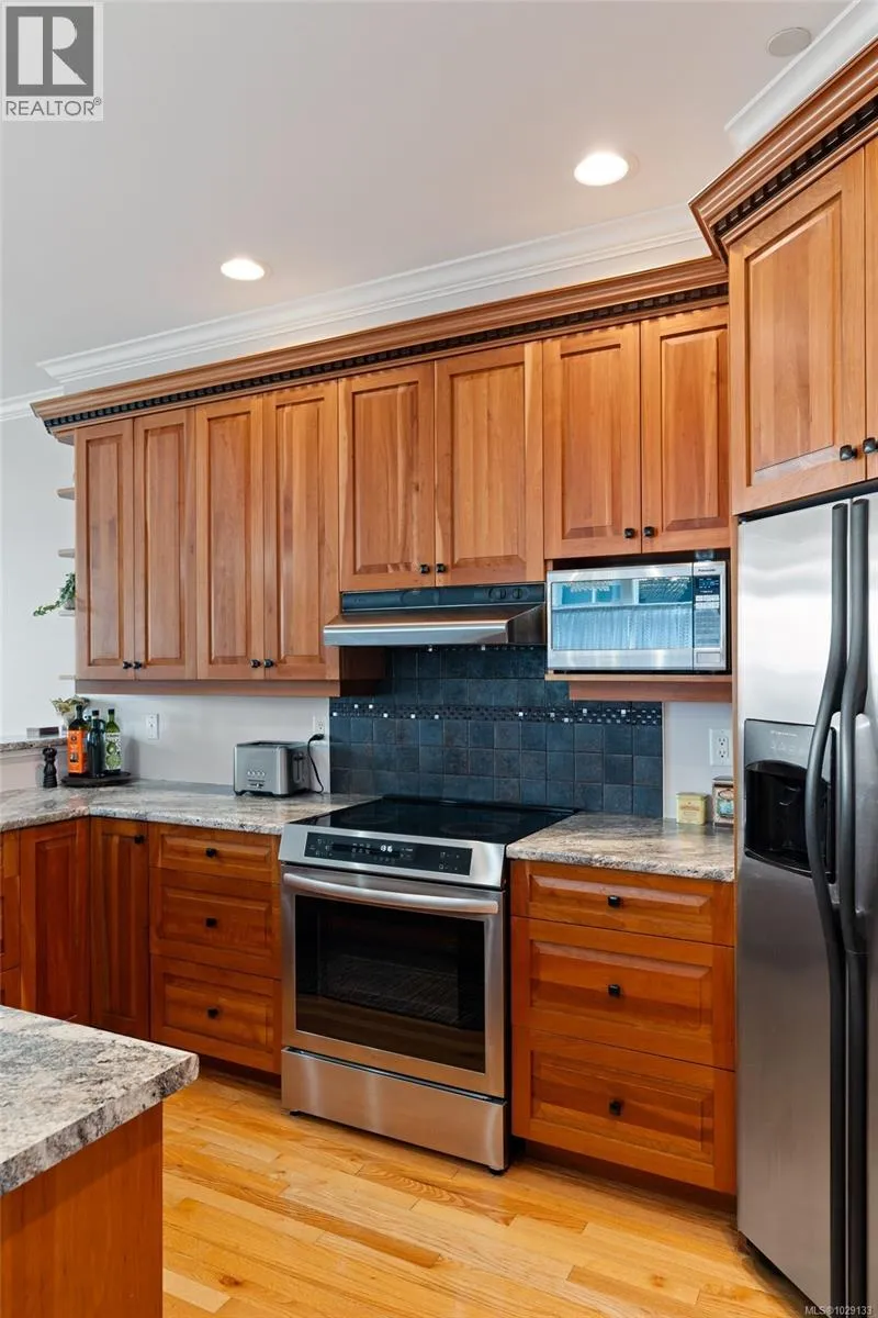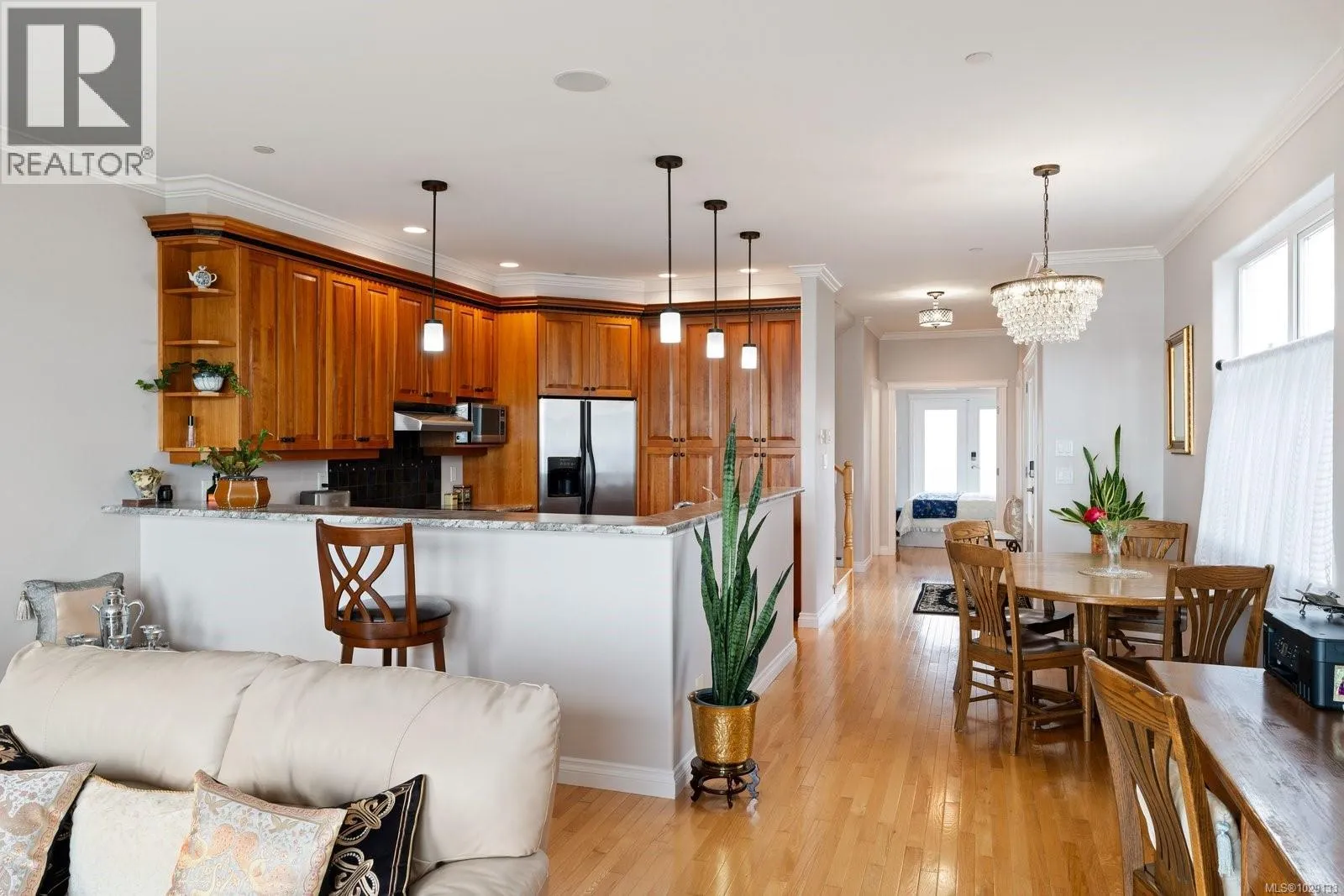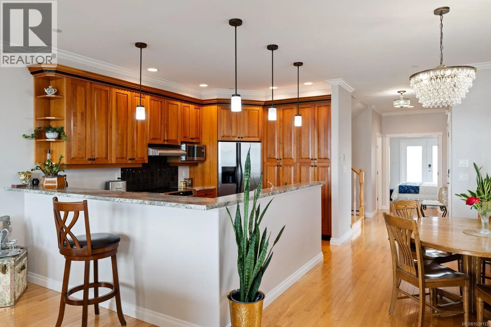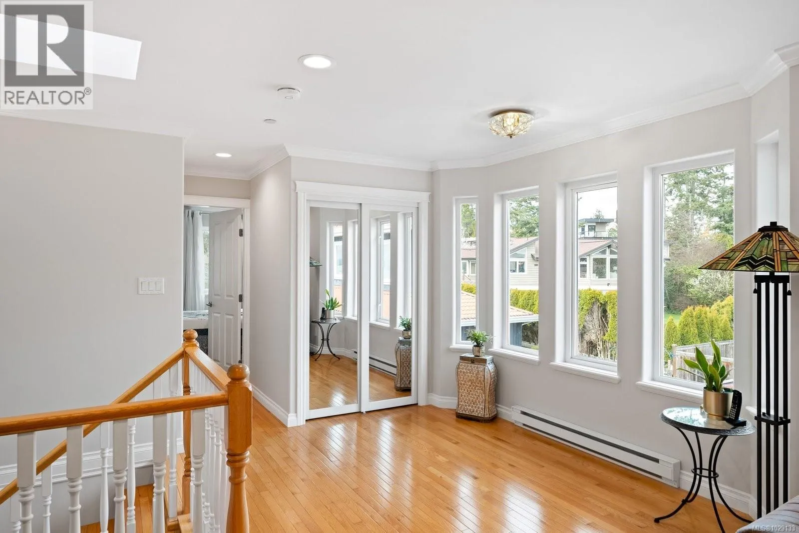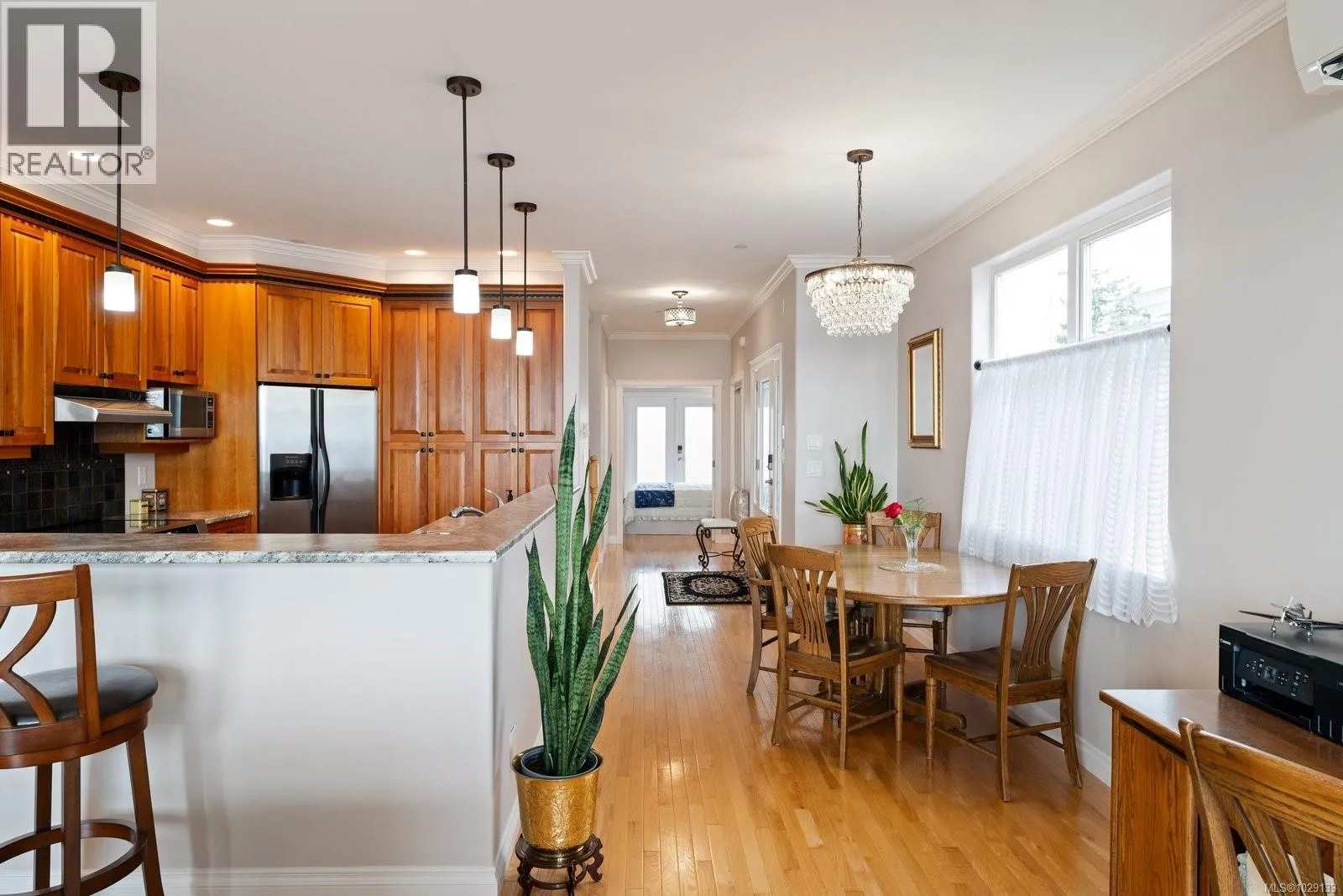 This freshly updated 2,000 sf half-duplex boasts spectacular uninterrupted ocean, island and mountain views. The sun-filled main level features open kitchen, living and dining rooms with a new Valor gas fireplace, hardwood floors and air conditioning. This level also has a renovated 3-piece bathroom and a bedroom/office that opens to the private west facing fenced backyard. Upstairs offers a primary bedroom with a fireplace and a/c, a flex room (that can easily be added back to the primary bedroom), full ensuite with heated floors, an office nook, laundry room, plus an additional bedroom with a 3-piece ensuite. There is plenty of storage throughout the home and a secure detached garage plus a parking stall. Located across from Lochside waterfront park and within walking distance to downtown Sidney, this is a mint condition gem! (id:27476)