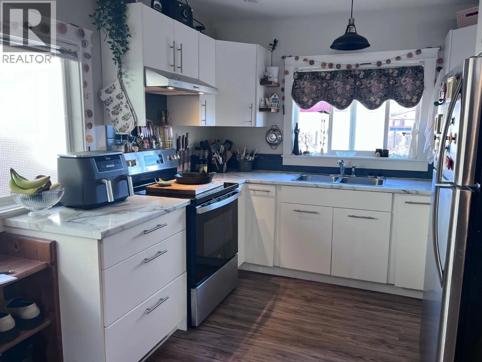 Good exposure for this Building consisting of 6 Commercial leases including a restaurant, and offices on the main floor and 2 residential suites on the upper floor. All units are currently rented. The building area covers 8019 Sq feet on both floors. Main floor is 6522 sq ft. The upper floor has one bedroom apt 600 sq ft and a 2 bedroom 900 sq. ft. The exterior of the building is finished in a Bavarian style. Conventional washrooms in each tenancy. (id:27476)