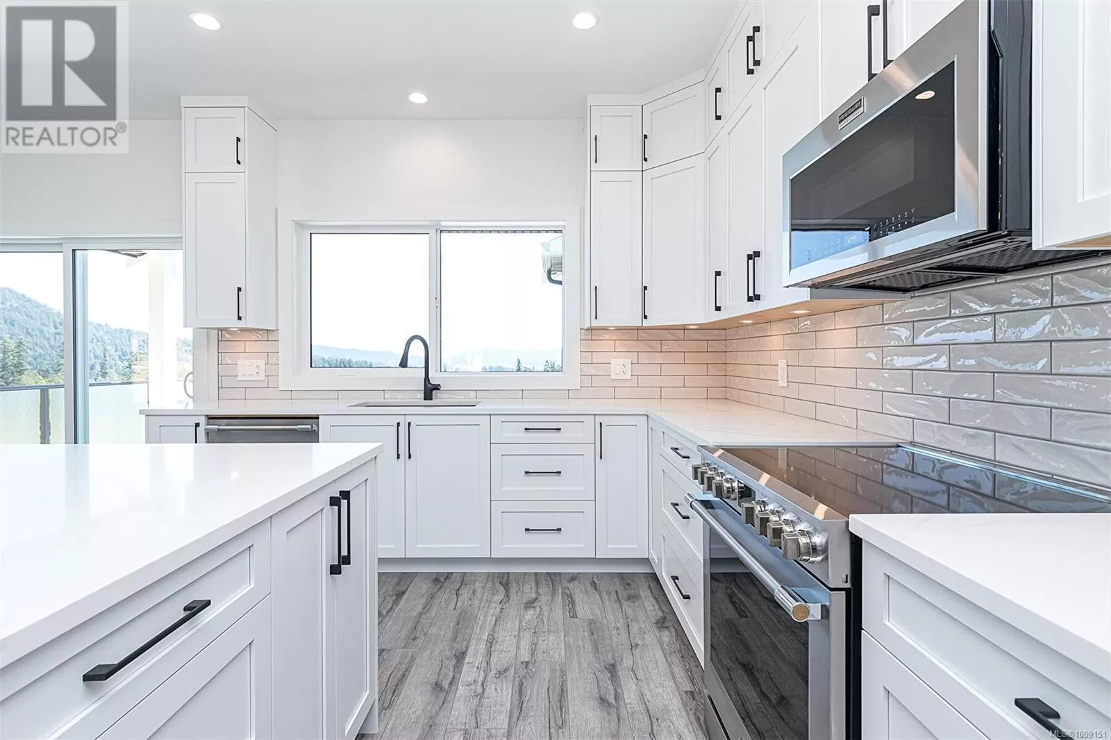 OPEN HOUSE SAT NOV 15TH 12-1:30 PM. Located in a quiet cul-de-sac with views of Sooke Harbour and Straits of Juan de Fuca, this impressive Brand New 4+ Bedroom 3 bath Rancher with walk out basement is ready for immediate possession. On the main floor your immediately impressed with Open Floorplan the classy Hardwood Floors the living room with Gas FP with smartly done built-in cabinets, gourmet style kitchen with granite countertops, classy island, master bedroom has great views, good sized walk in and great ensuite, 2nd bedroom is good sized on main. Down has a huge Rec room area, built in bar, 2 other bedrooms ( potential suite? ) 4 pce bathroom, and massive crawl space entrance for storage, listed at 1,299,900 plus GST. (id:27476)