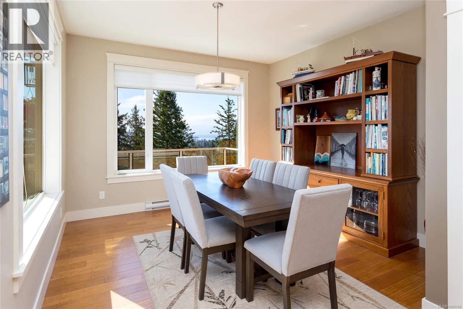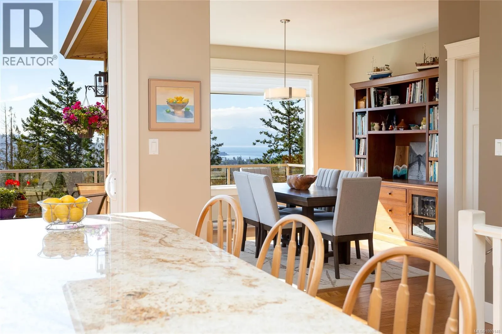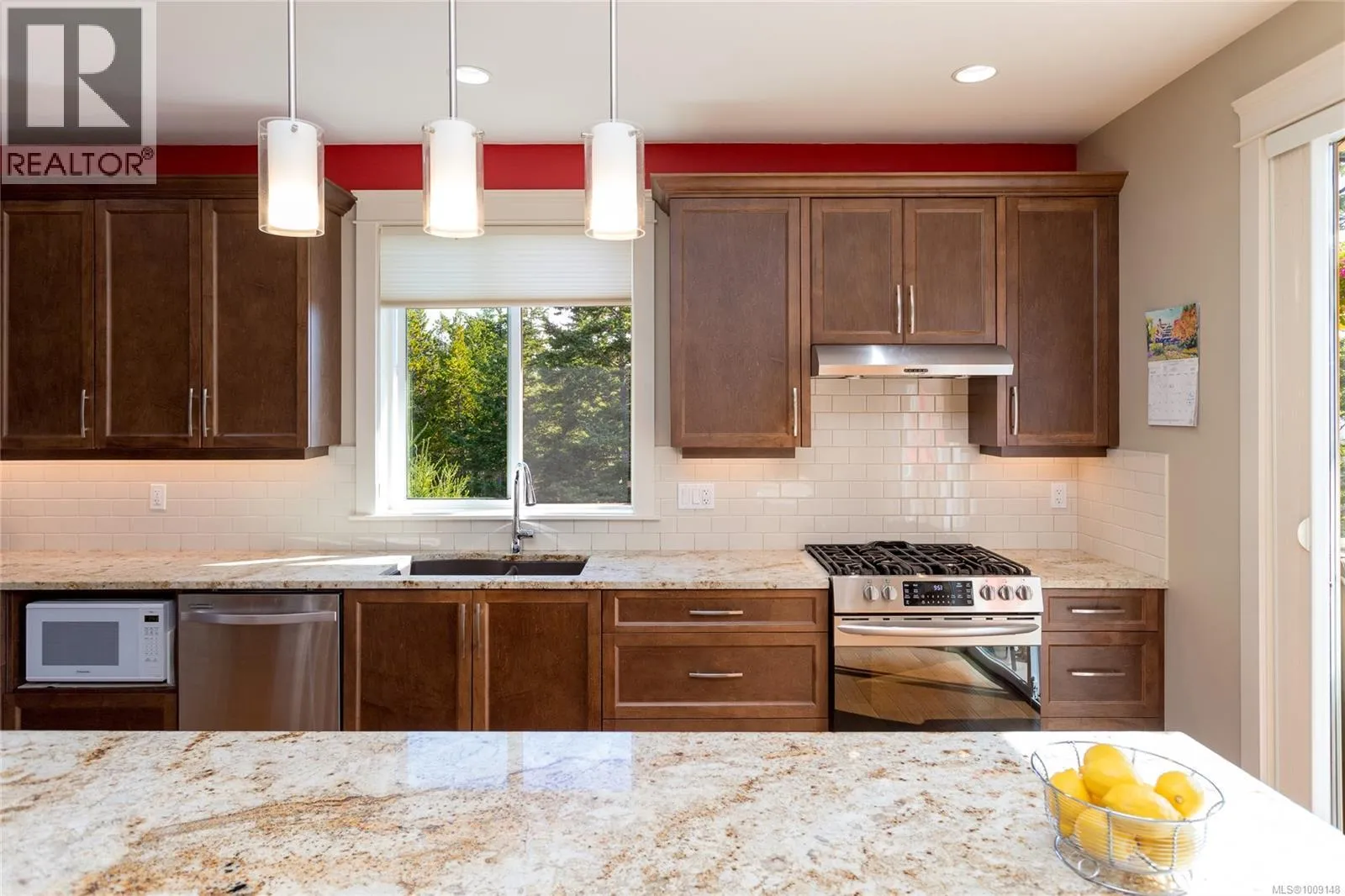 Welcome to this beautifully crafted 3 bed, 3 bath custom home in coveted Stone Ridge Estates, perfectly positioned at the end of a quiet cul-de-sac. Backing onto Stone Creek Place Park on two sides, this private 7,567 sq ft lot offers stunning views over the Sooke Hills, Juan de Fuca Strait, and Sooke Harbour. With almost 2,400 sq ft of thoughtfully designed living space, the main level offers true one-level living: kitchen, dining, living, and primary suiteâall with engineered hardwood and custom window coverings. Enjoy cooking in the gorgeous open kitchen with granite counters, maple cabinetry, and a 7.5 ft island offering great separation for two to cook! The expansive wrap-around deck is a morning favourite, surrounded by beautiful trees & birdsong. Downstairs offers two bedrooms, media room, and a cool, bonus wine/canning storage room. Low-maintenance yard, large guest bedroom with walk-in closet, and just 5 minutes to shops and trailsâthis is West Coast living at its finest. (id:27476)