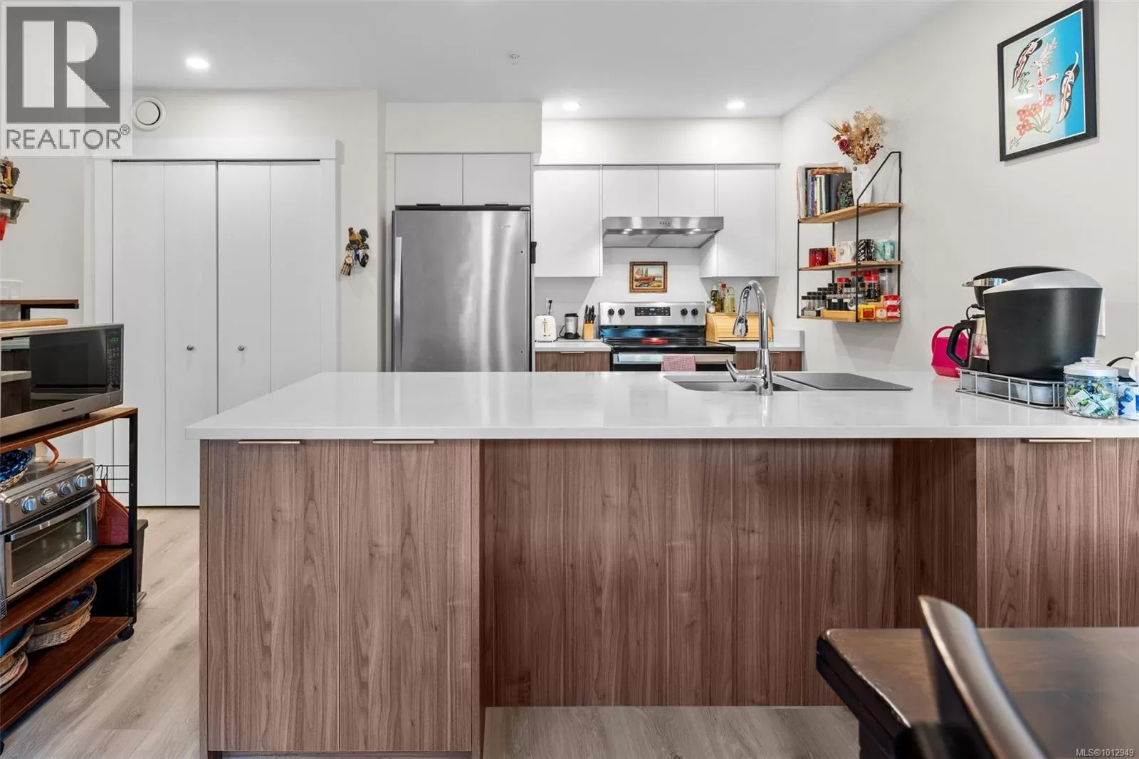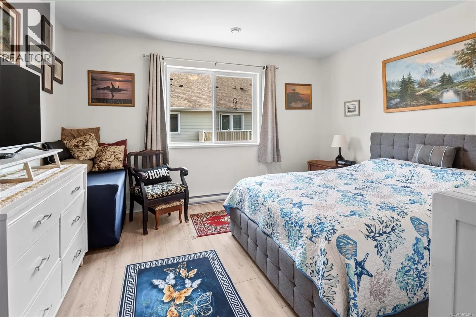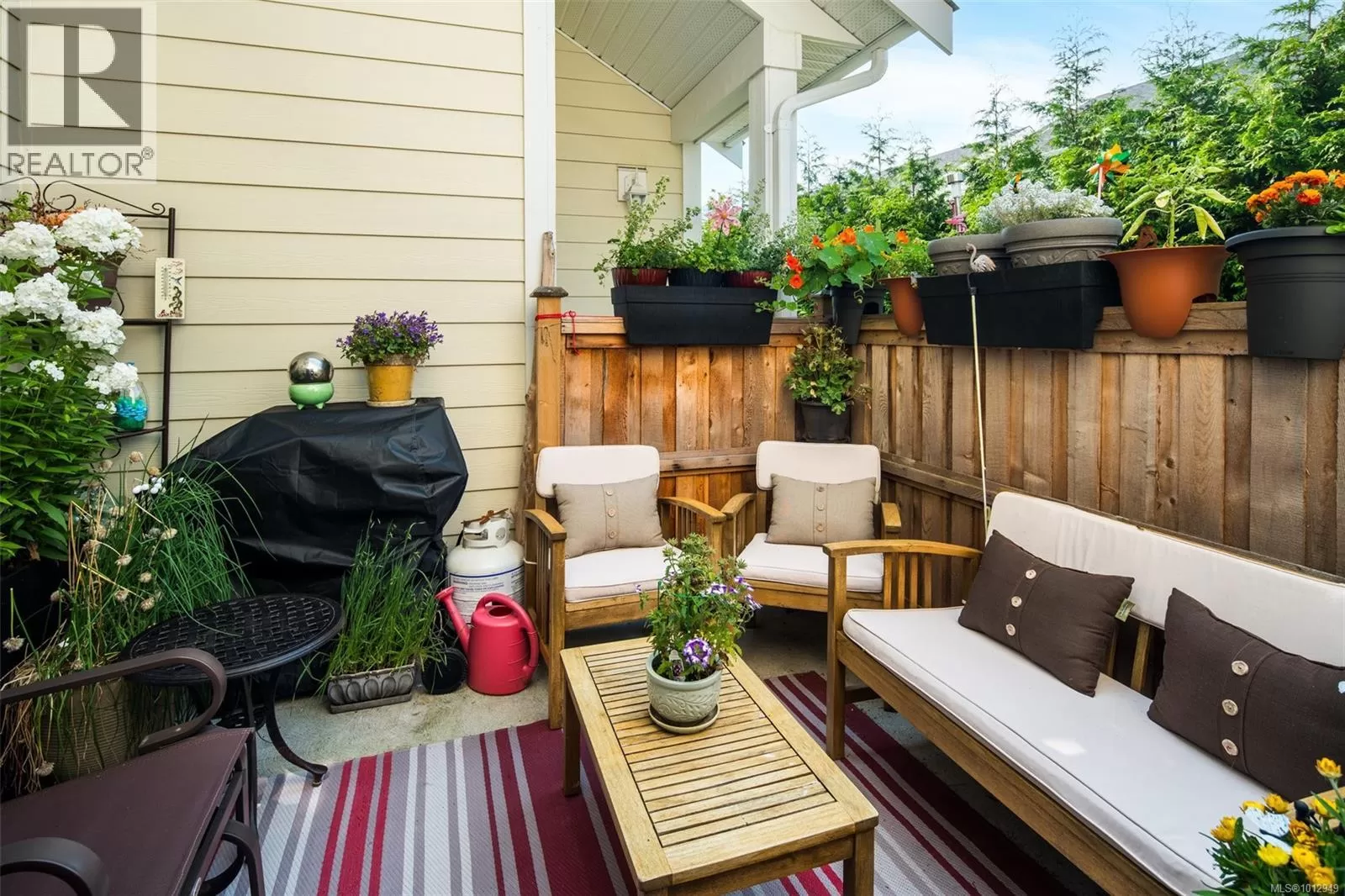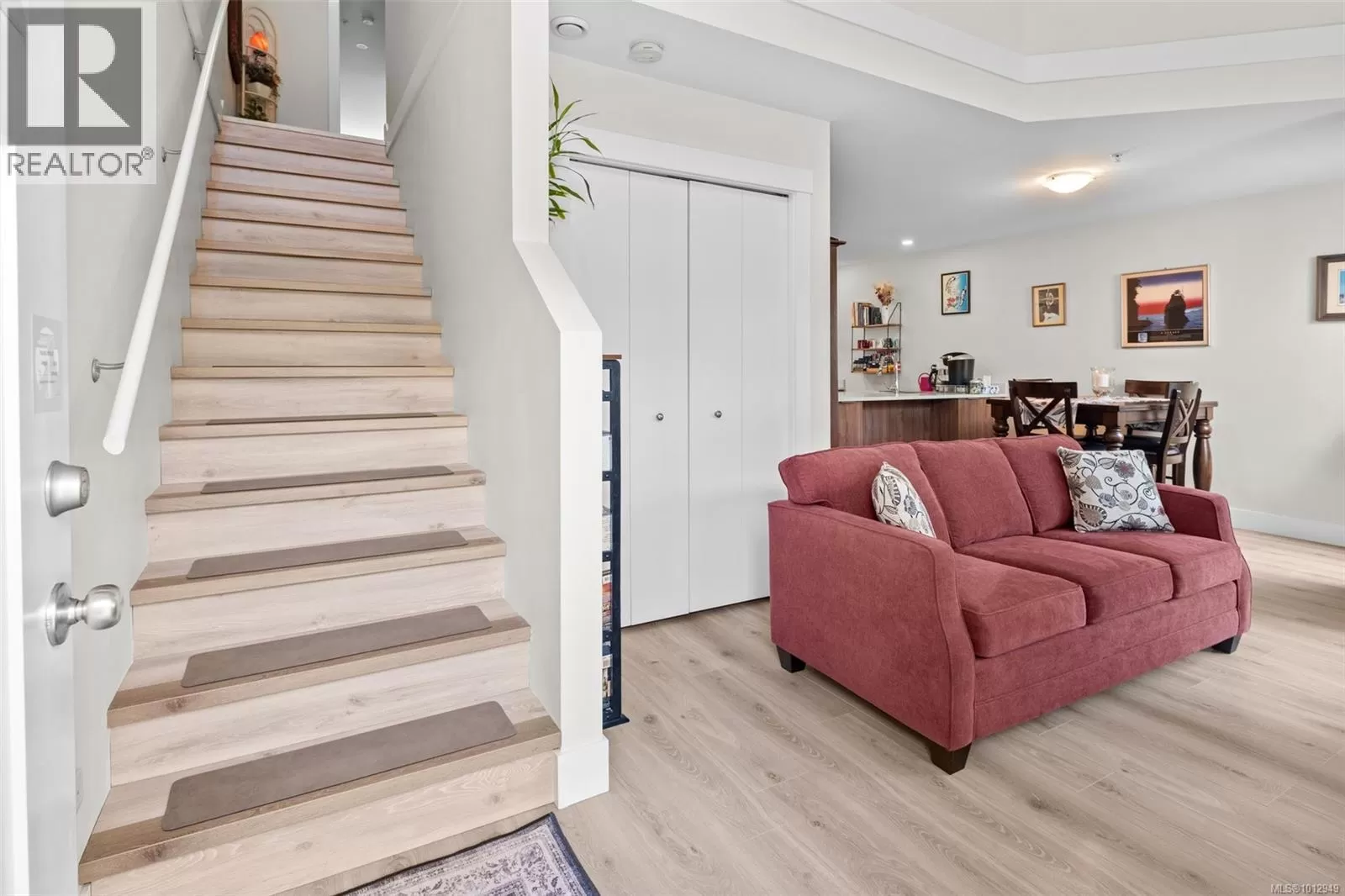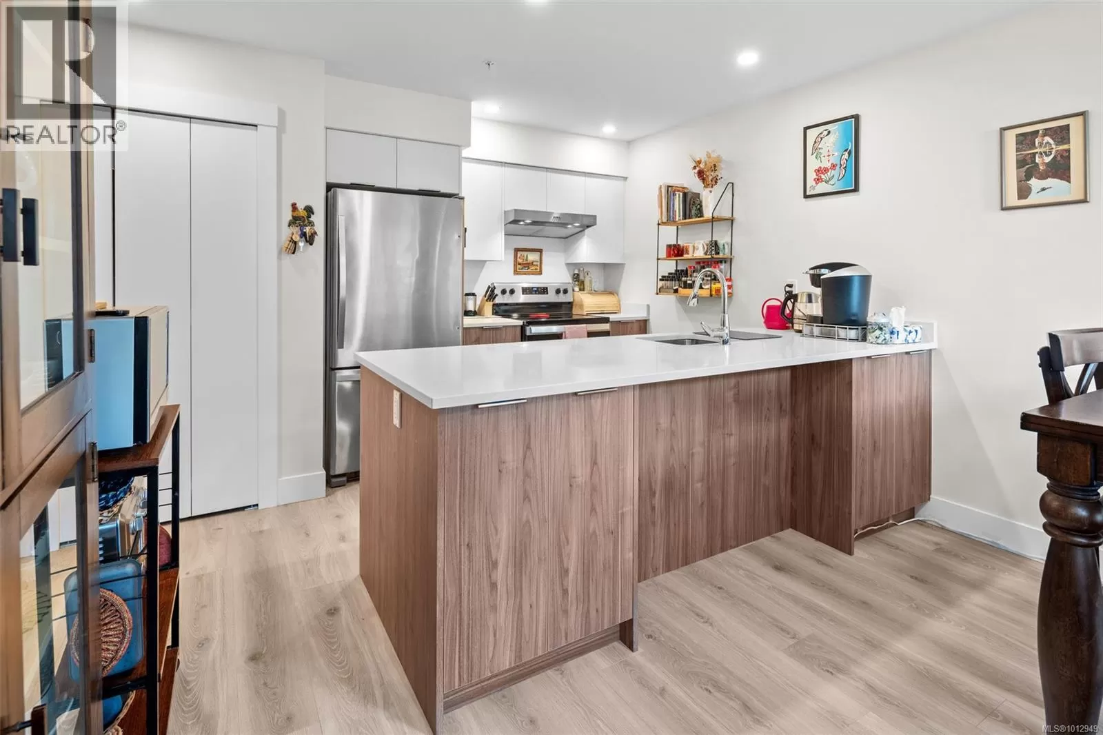 Move right in to this beautifully-appointed townhouse, right in the centre of Sooke! With its two bedrooms, each with its own ensuite bathroom, this 1250 sqft home is the ideal spot! Park in the single car garage, and enter into the open-plan west-facing main floor, with 17' vaulted ceilings and lots of windows for a bright living experience. The kitchen features stainless steel appliances and quartz counters, and a stylish electric fireplace is in the living room. Enjoy a fenced patio right off the living and dining room. Upstairs, you'll find two spacious bedrooms - each with its own ensuite bath - it's like having two primary bedrooms! This home features laminate floors in the living areas and bedrooms, and tile in the bathrooms. Walking distance to shops, restaurants, parks, and more! Low strata fees in a well-managed community of 18 homes. Clean and bright and ready for you to make it yours - call today! (id:27476)