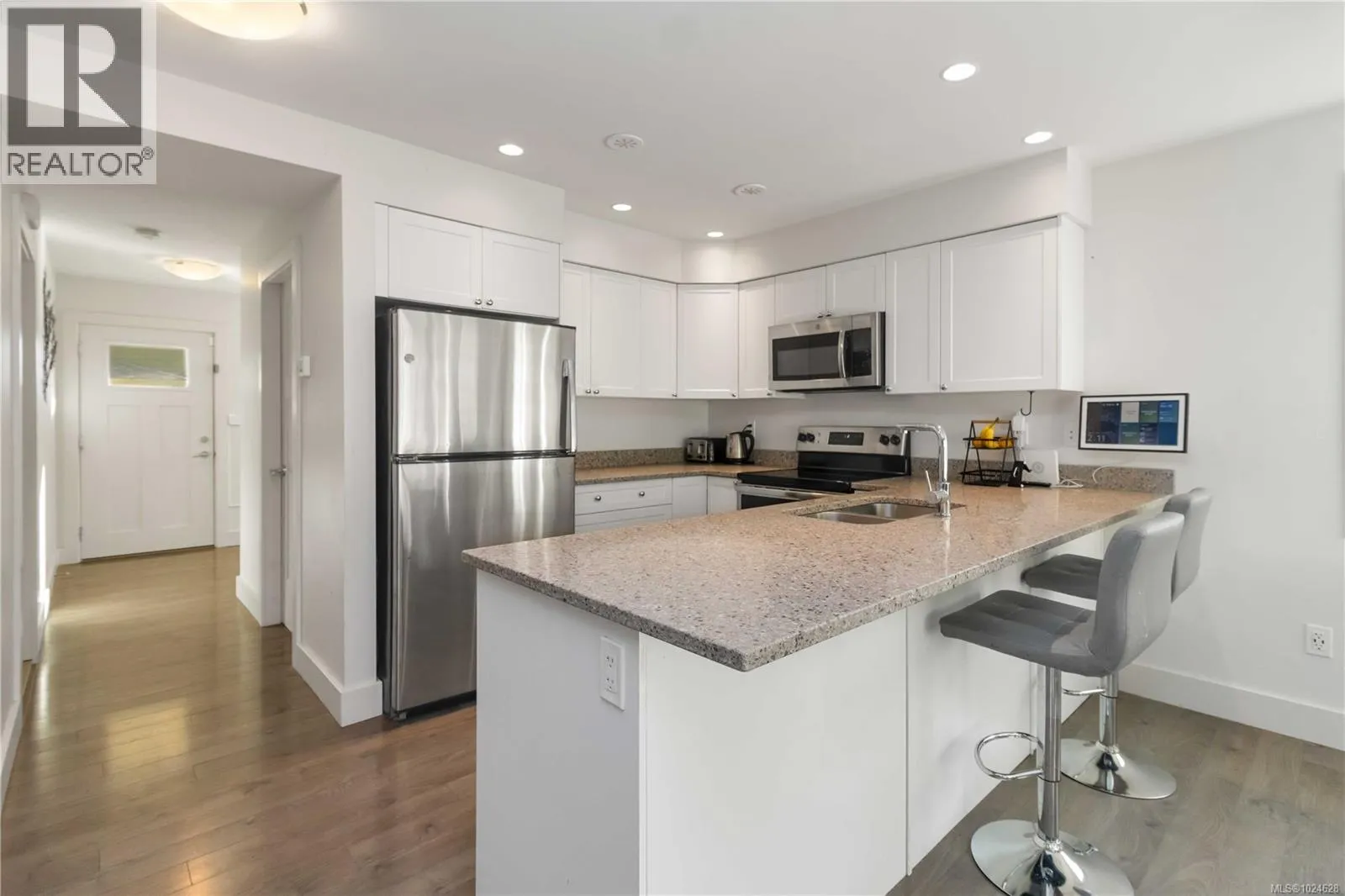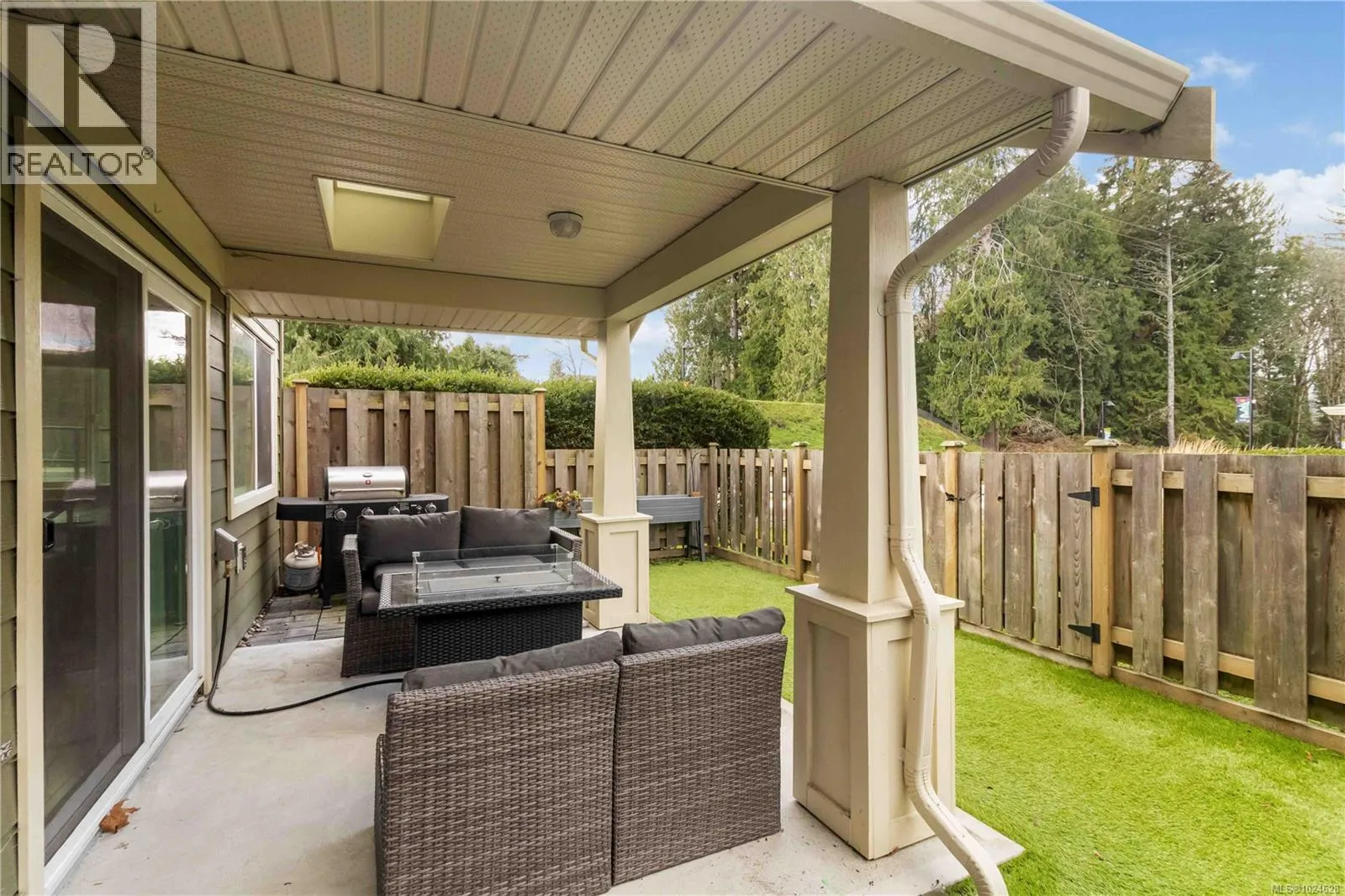 Presenting this stunning corner unit 3 bed townhome located in the charming Grasslands complex. The main floor boasts a bright and spacious open concept design, complete with quartz countertops in the kitchen, stainless steel appliances, hot water on demand, a generous dining area that flows into the bright living room featuring an electric fireplace. Step outside to the covered patio and fenced backyard with a convenient gas hookup for your BBQ needs. Upstairs, the spacious Primary Bedroom offers a walk-in closet and ensuite with quartz countertops and luxurious stand-up shower, along with two additional bedrooms, a second full bathroom, and a convenient laundry area. Enjoy the serene backdrop of forest greenspace right in your backyard. This home also includes a single car garage plus a driveway. Low Strata Fees of $240! Gas forced air heating makes it super affordable to heat the home in the winter! Conveniently located within walking distance to a variety of amenities including shopping centers, recreational facilities, restaurants, library, oceanfront, and picturesque walking trails. (id:27476)