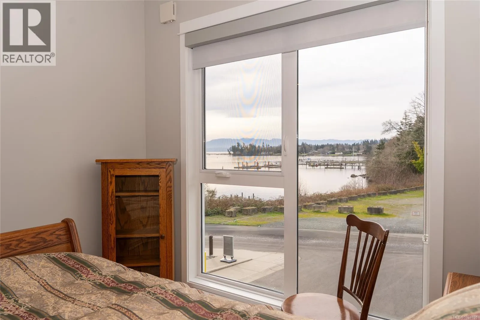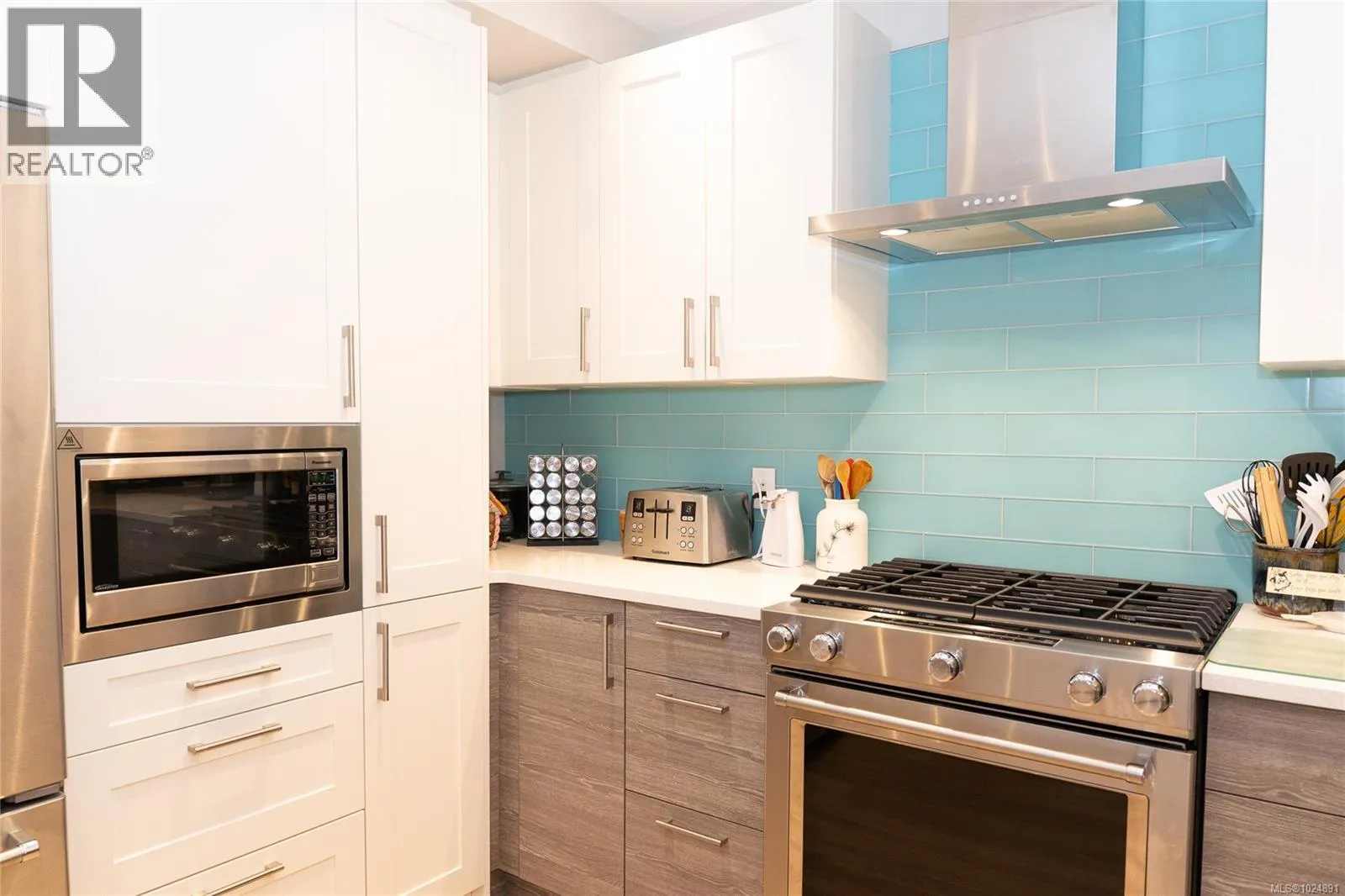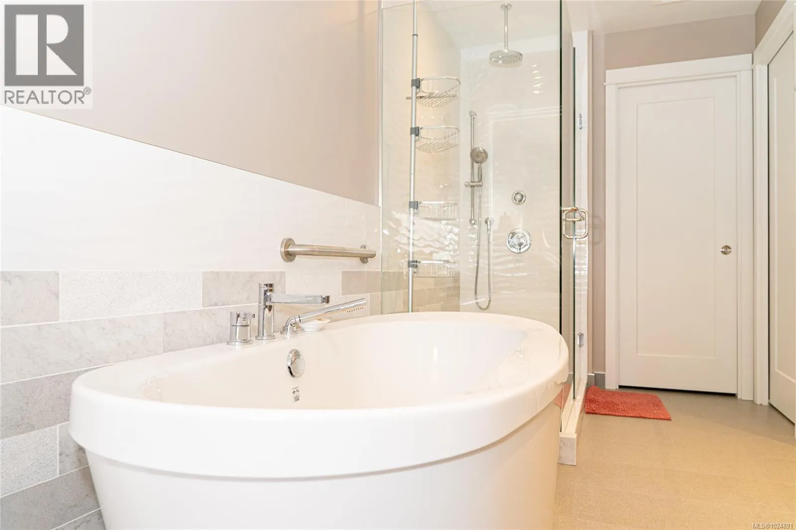 Enjoy refined oceanfront living in this oversized 2-bed+Den, 2-bath residence offering just under 900 sq. ft. of thoughtfully designed space. The open-concept layout features a stylish kitchen with stainless KitchenAid appliances, gas range, quartz countertops, and seamless flow to the dining and living areas. Step outside to an expansive 263 sq. ft. patio with gas BBQ hookupâideal for entertaining while taking in ocean and mountain views. Quality finishes include oak hardwood flooring, 9-ft ceilings, and oversized windows that flood the home with natural light. The king-size primary bedroom connects to a spa-inspired ensuite with dual vanities, soaker tub, glass shower, heated floors, and private water closet. A separate 3pc bath, secured underground parking, and storage locker complete the home. Located in the exclusive Residences on Sooke Harbour, a boutique collection of just 27 oceanfront homes offering a private fitness studio, kayak storage with ocean access, and secured entry. (id:27476)