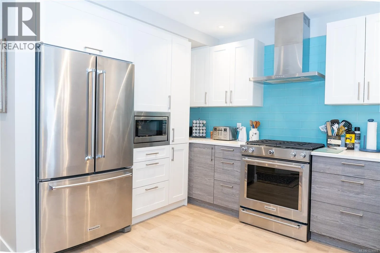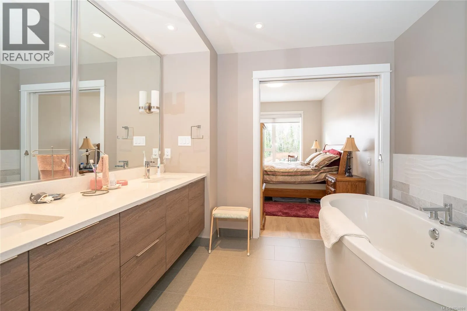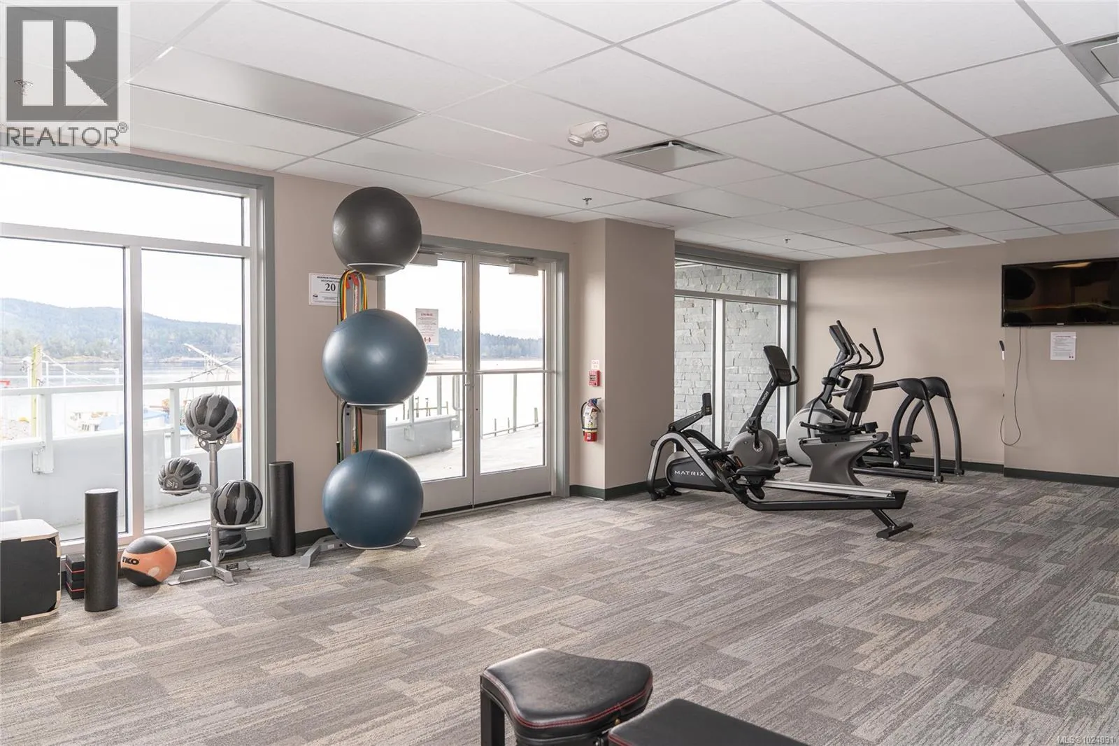 Enjoy refined oceanfront living in this oversized 2-bed+Den, 2-bath residence offering just under 900 sq. ft. of thoughtfully designed space. The open-concept layout features a stylish kitchen with stainless KitchenAid appliances, gas range, quartz countertops, and seamless flow to the dining and living areas. Step outside to an expansive 263 sq. ft. patio with gas BBQ hookupâideal for entertaining while taking in ocean and mountain views. Quality finishes include oak hardwood flooring, 9-ft ceilings, and oversized windows that flood the home with natural light. The king-size primary bedroom connects to a spa-inspired ensuite with dual vanities, soaker tub, glass shower, heated floors, and private water closet. A separate 3pc bath, secured underground parking, and storage locker complete the home. Located in the exclusive Residences on Sooke Harbour, a boutique collection of just 27 oceanfront homes offering a private fitness studio, kayak storage with ocean access, and secured entry. (id:27476)