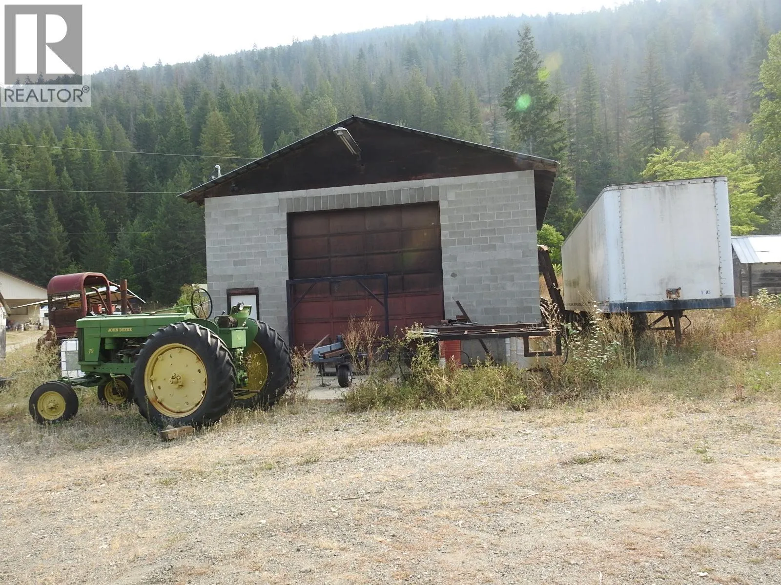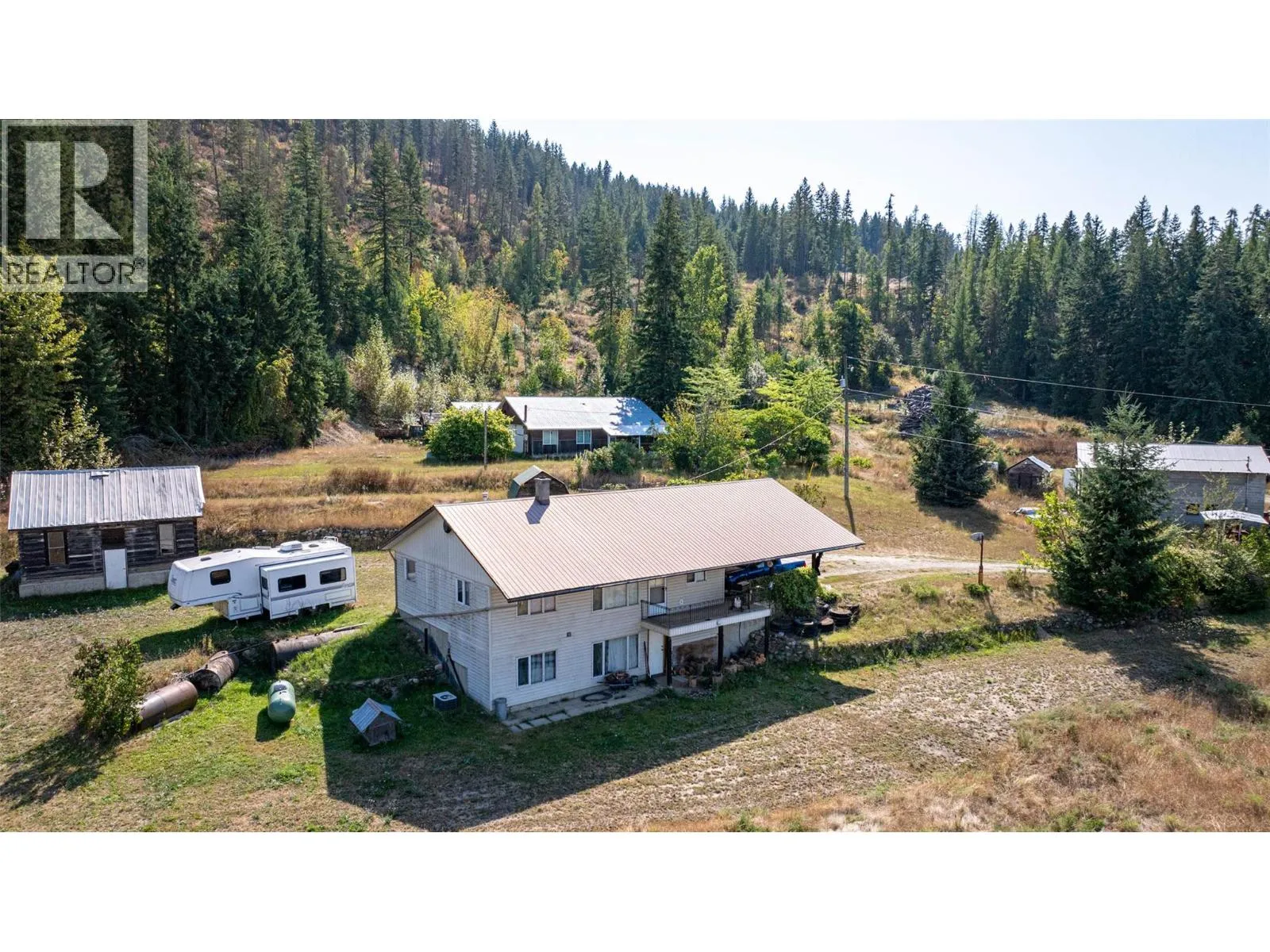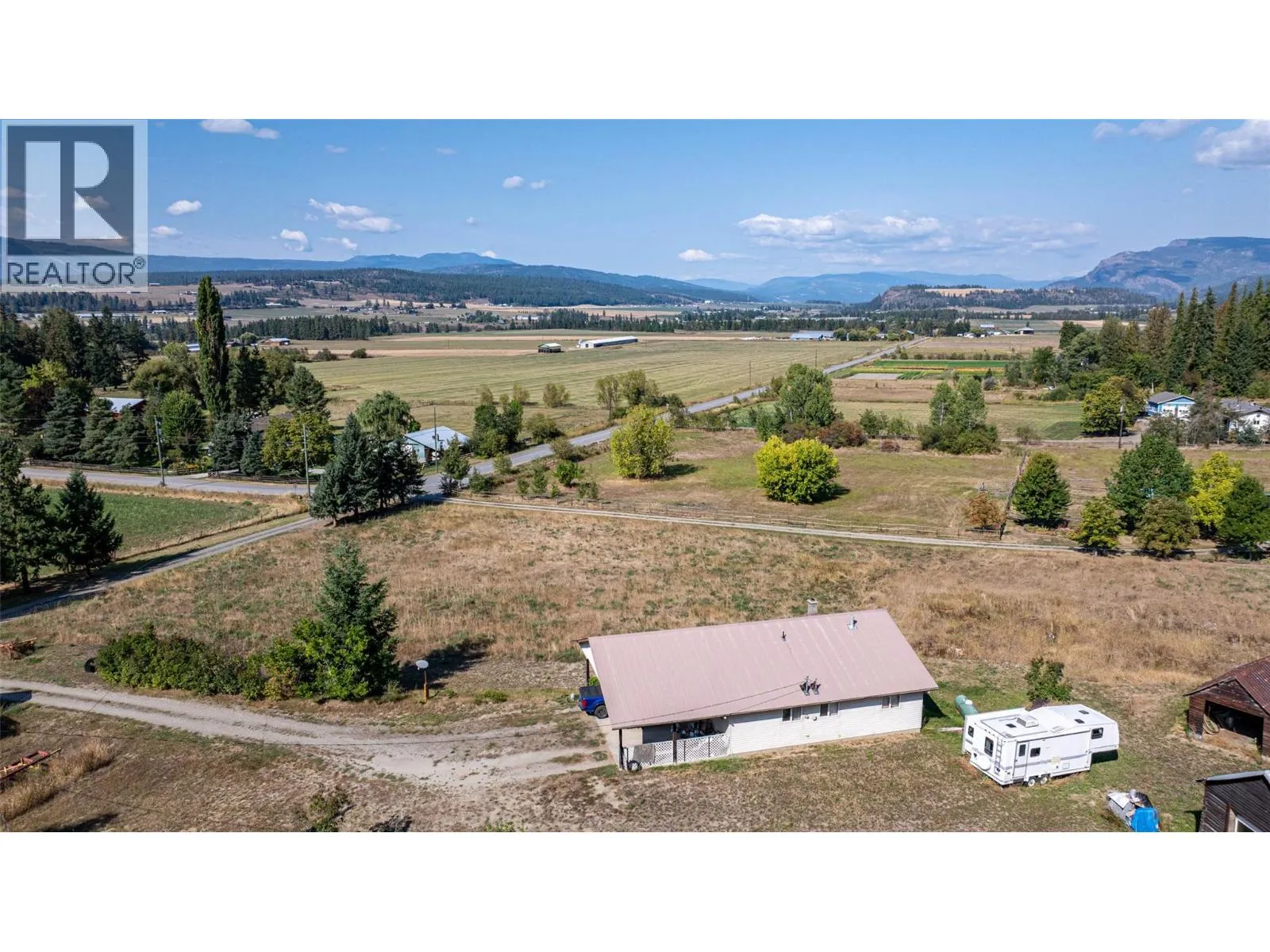 120 acres on 2 Titles. 1990's level entry home with walkout basement, 2 beds plus a den and 2 full baths. Great 30'x40' Industrial style Shop with 2 roll up doors (14'). Main level of home has a big open kitchen-living room. 2 beds are on this level with the full bath and laundry. Downstairs is a large unfinished family room with a 3 pce. bath and den/office. The home is heated with a propane forced air furnace and wood stove and cooled with central A/C. The home sits on a bench overlooking an approximate 5 acre level hay field, the balance of land is treed hillside. There are several good outbuildings for storage. The land has preliminary approval for gravel extraction and is located adjacent to an existing gravel pit. Most of the property outside the ALR, only flat area in front of home is in, (approx. 5 acres). The property is conveniently located between Armstrong and Enderby. (id:27476)