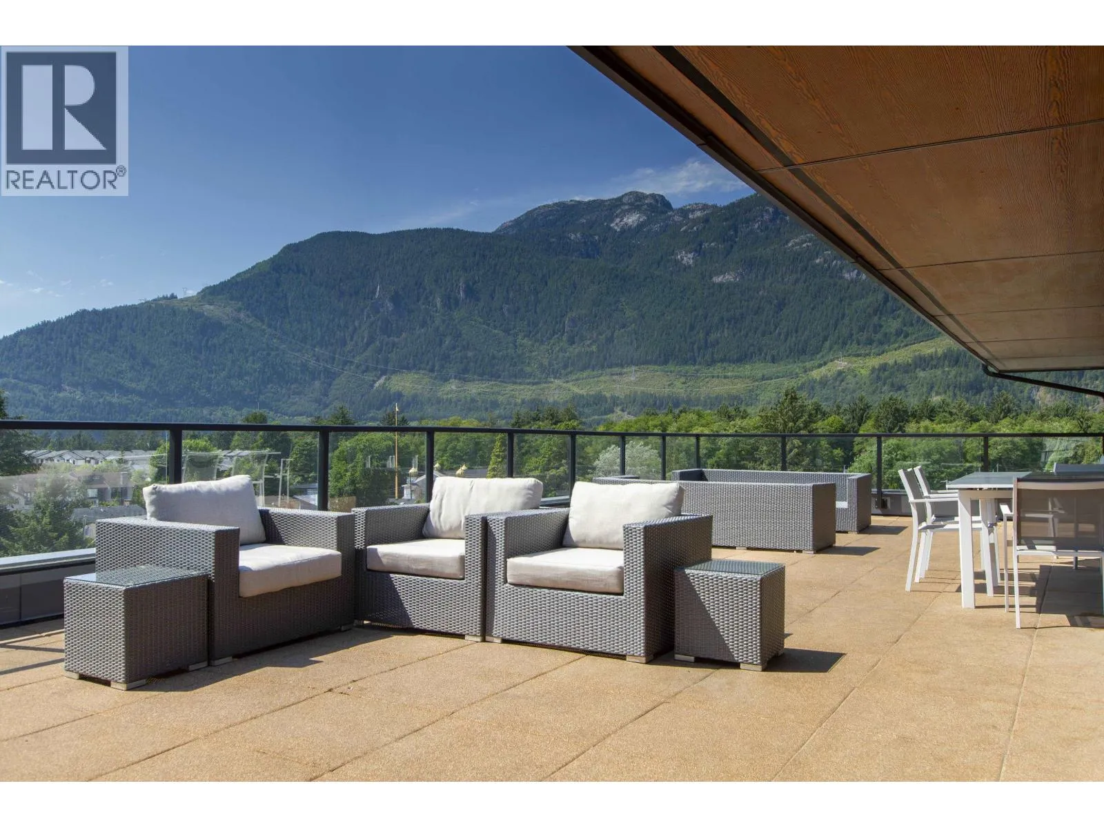 Welcome to SUITE 610 at the Lauren. This modern TOP FLOOR 2 bedroom LOFT PENTHOUSE with a super layout features 17 ft. high ceilings, luxury finishes and OPEN PLAN kitchen and dining areas. Large loft bedroom with a 4 piece ensuite has plenty of room for a king size bed and large furniture. Relax and enjoy morning coffee on your deck or upper roof top patio and gardens with STUNNING views of the Stawamus Chief and local mountains. Perfect for relaxing, entertaining guests and watching the sunsets. Located in the heart of Squamish within walking distance to all amenities , shopping, eateries, breweries, groceries, beautiful recreation and biking trails, the marina and estuary. Storage locker, bike room and bike wash. Enjoy Squamish Life!!! Great strata and still under warranty. (id:27476)