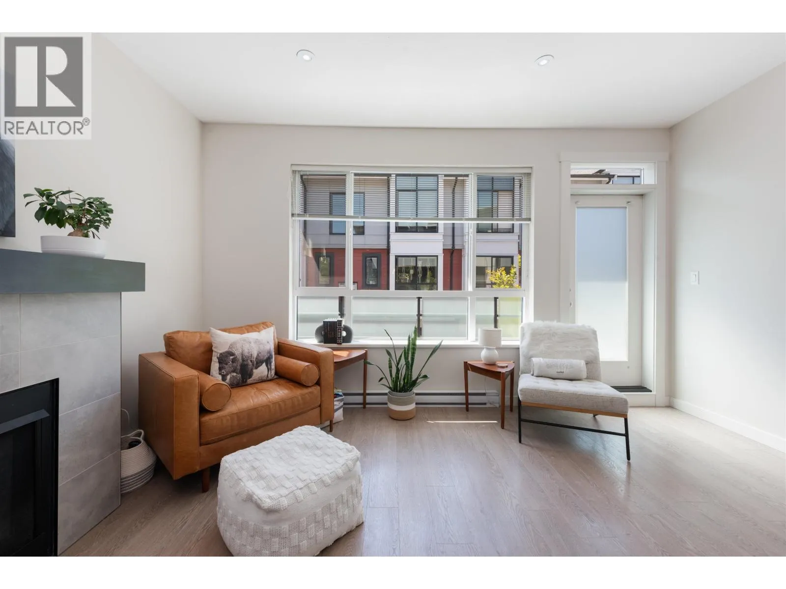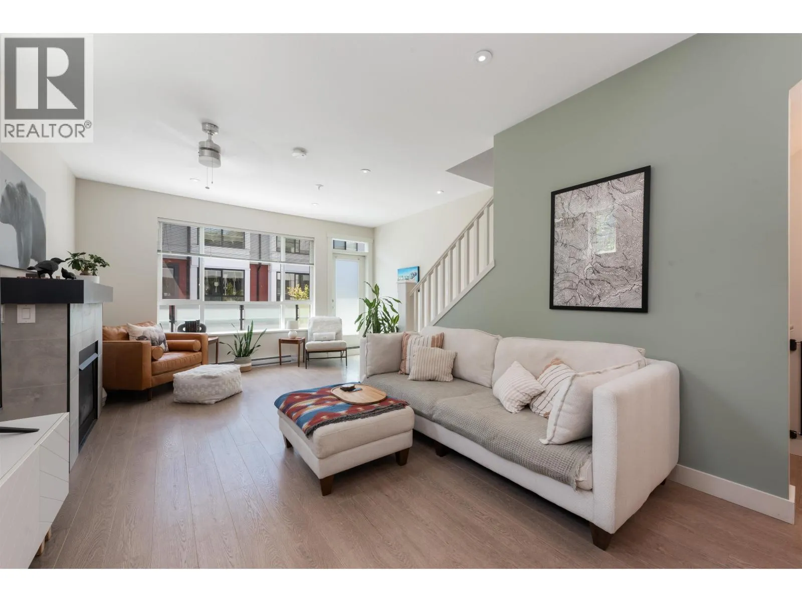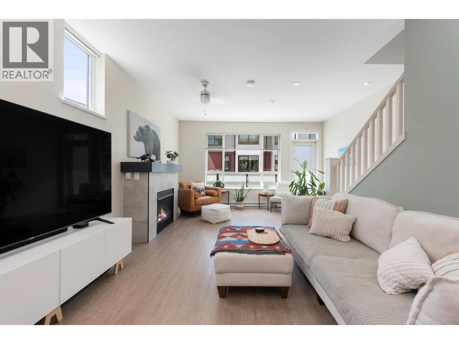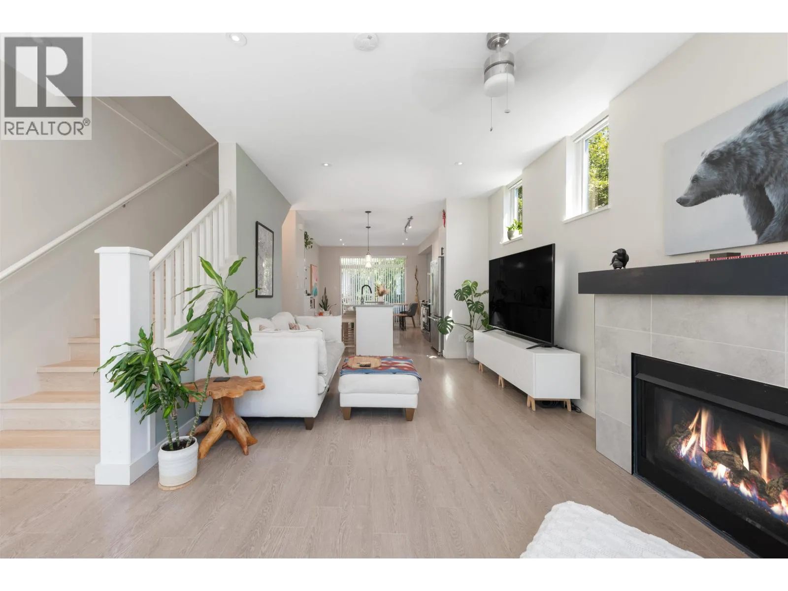 Bright end-unit townhome in the sought-after Eaglewind community. The open concept main floor features 9 ft ceilings, oversized windows, and a natural gas fireplace. The kitchen is equipped with quartz counters, stainless steel appliances, updated lighting, and a large island with seating for four. From the dining area, step directly into your private, fully fenced backyard, ideal for kids, pets, or outdoor entertaining. Upstairs offers three bedrooms, two bathrooms, and full-size laundry. The spacious primary bedroom includes an ensuite with heated tile floors, and an oversized tub and shower. A huge tandem garage provides ample space for parking and storage. (id:27476)