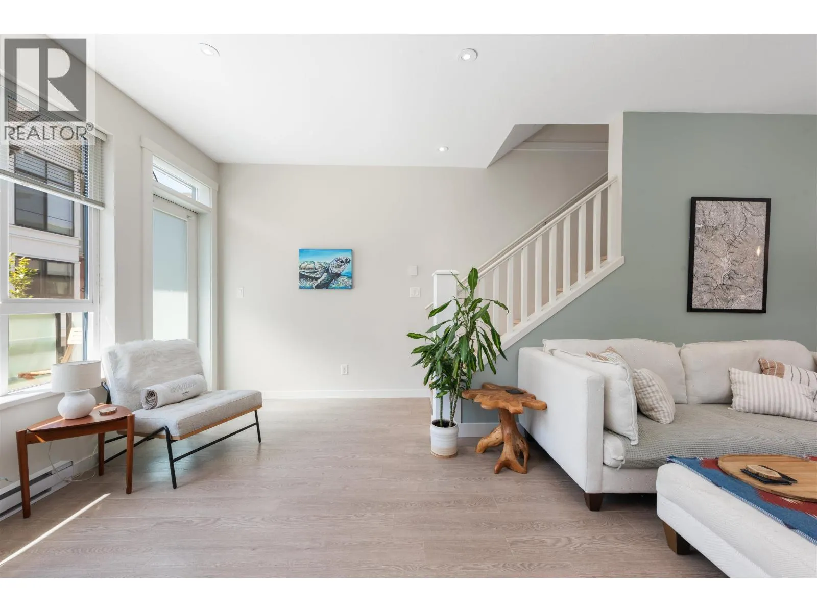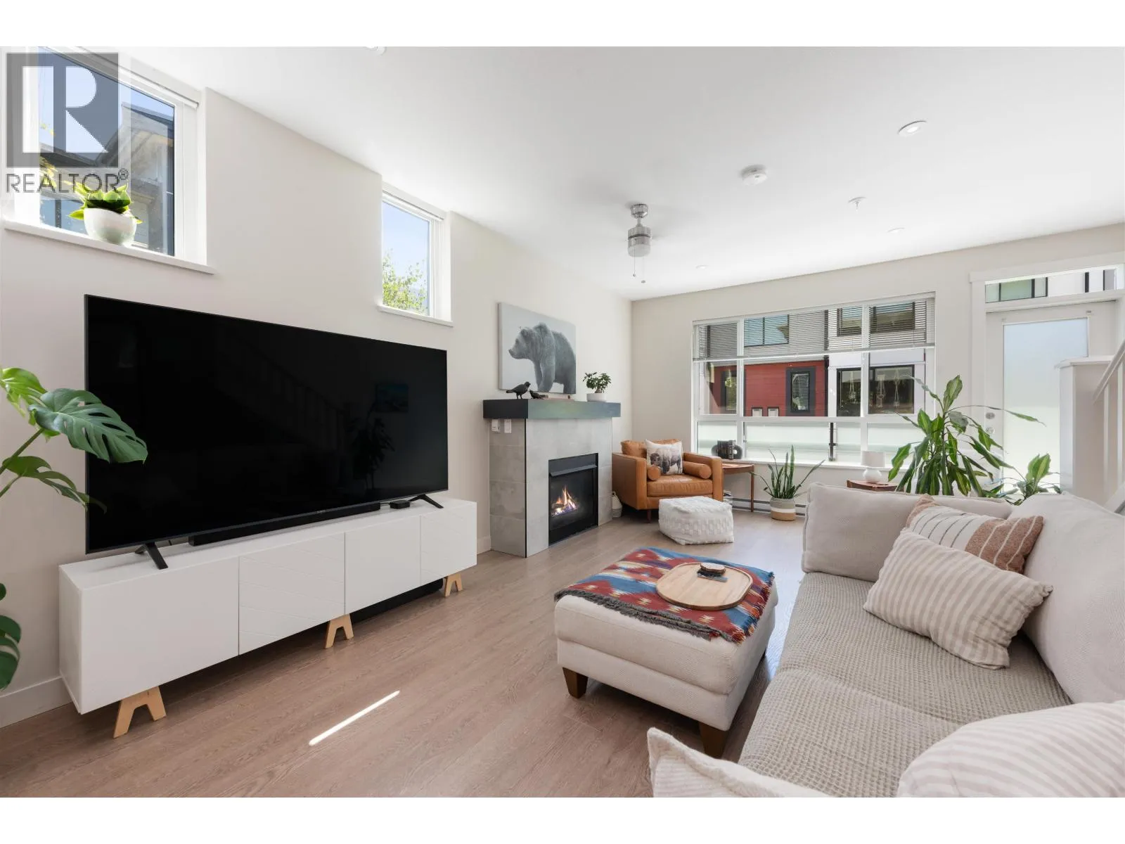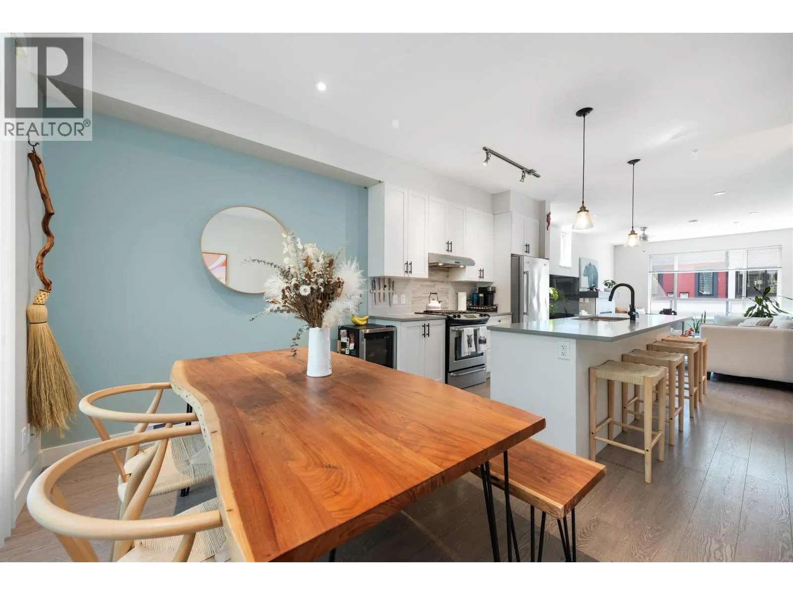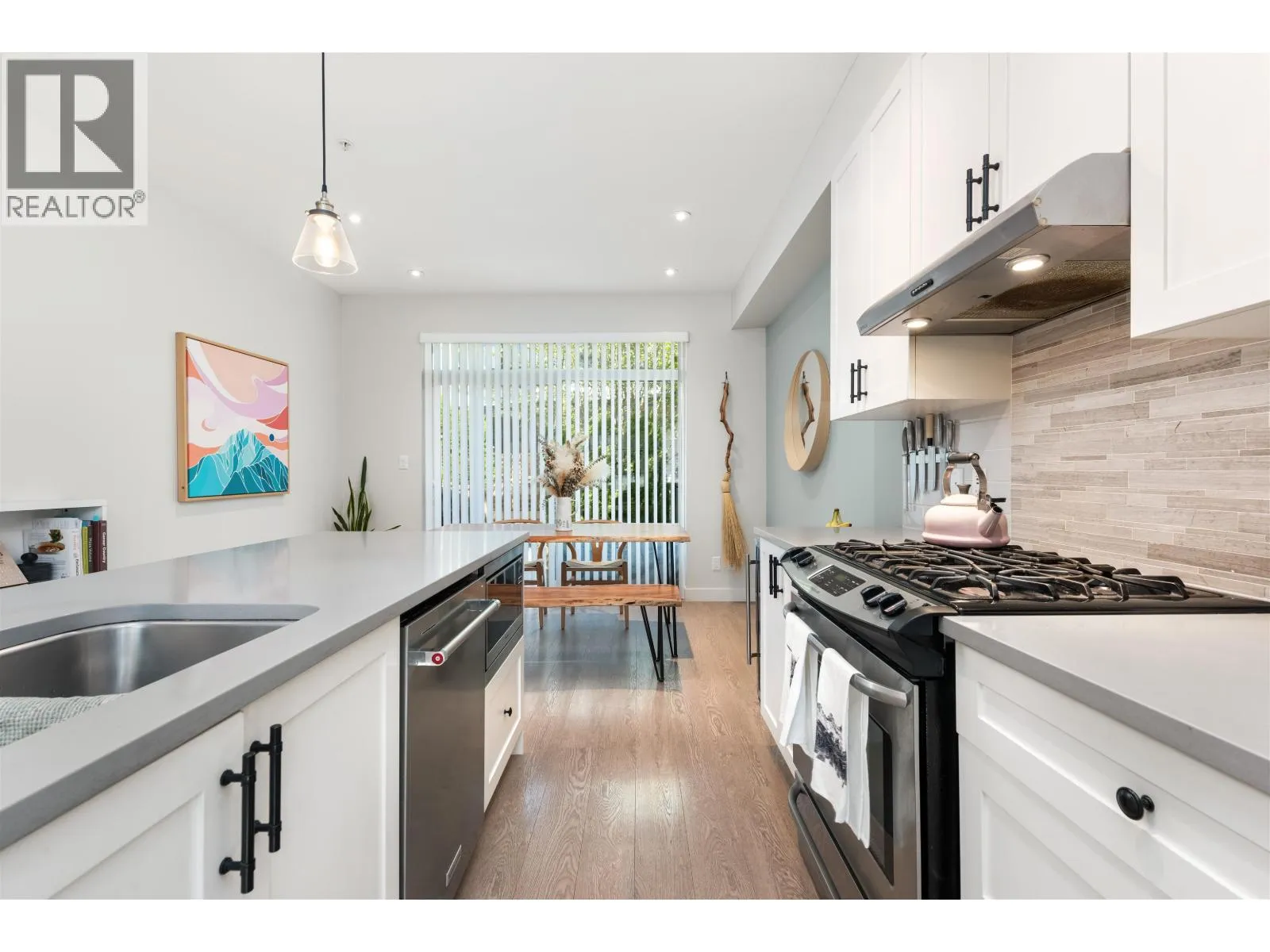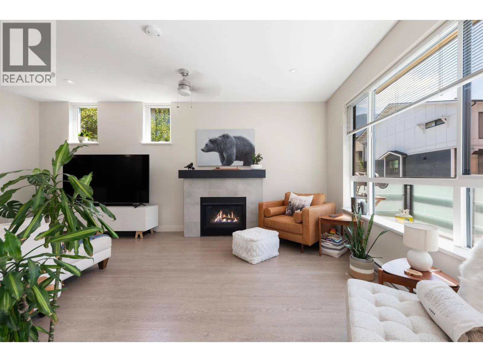 Bright end-unit townhome in the sought-after Eaglewind community. The open concept main floor features 9 ft ceilings, oversized windows, and a natural gas fireplace. The kitchen is equipped with quartz counters, stainless steel appliances, updated lighting, and a large island with seating for four. From the dining area, step directly into your private, fully fenced backyard, ideal for kids, pets, or outdoor entertaining. Upstairs offers three bedrooms, two bathrooms, and full-size laundry. The spacious primary bedroom includes an ensuite with heated tile floors, and an oversized tub and shower. A huge tandem garage provides ample space for parking and storage. (id:27476)