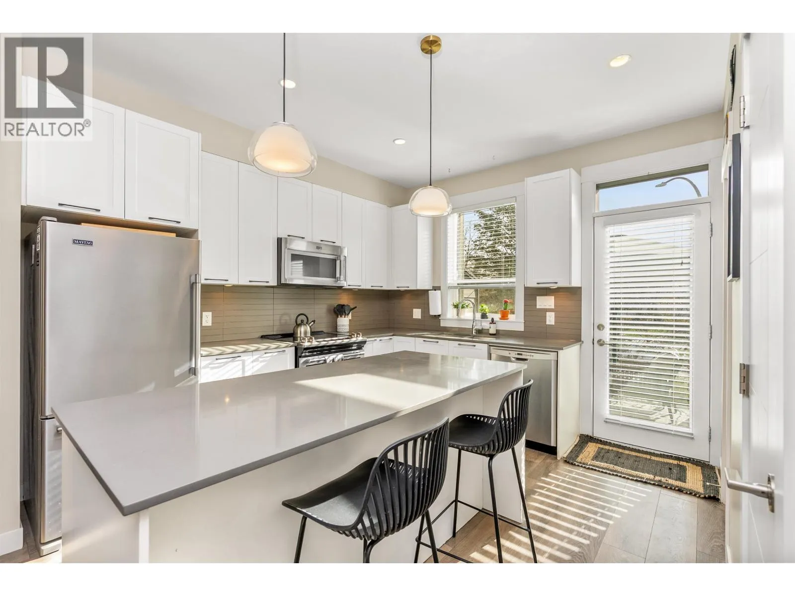 Welcome to Newport Landing in Dentville! This bright SW-facing 2 bed, 2.5 bath townhome offers a functional layout, large windows, and a peaceful green outlook w park & mountain views. Main- features 9' ceilings, wide plank flooring, and a stylish kitchen, quartz countertops, large island, SS appliances, and ample storage-plus a sundeck and designer powder room, ideal for entertaining. Up- Two generous bedrooms w large closets and 2 full baths, new carpet and eng hardwood flooring. Garage - well-appointed gear storage ready for your next adventure, driveway parking and ample overflow parking nearby. Addtl thoughtful upgrades include designer lighting and a full-size washer/dryer. Convenient location close to downtown amenities yet removed from busier core. OPEN HOUSE SAT APR 11th 10am - 12 (id:27476)