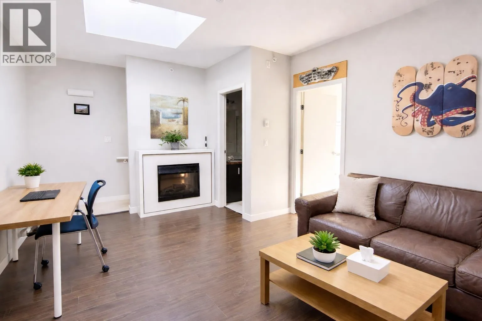 This unique two-level, 1-bedroom home offers 840 sq. ft. of thoughtfully designed living space with the added benefit of no neighbours above. Enjoy the peace and quiet of a top-tier layout, featuring a private entry, high ceilings, and a skylight that floods the upper level with natural light. The kitchen is finished with granite countertops and stainless steel appliances, opening seamlessly into the dining area. The versatile living space easily accommodates both a relaxation zone and a home office, complemented by a spacious walk-in closet. Step outside to your private, southwest-facing patio for afternoon sun. The unit includes one parking stall and one storage locker. (id:27476)