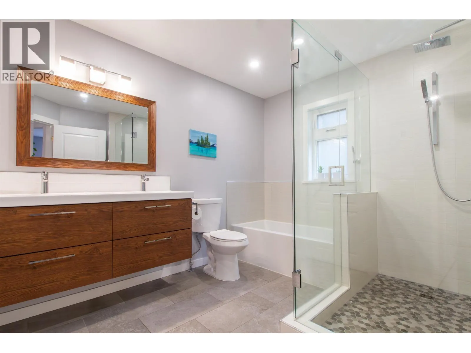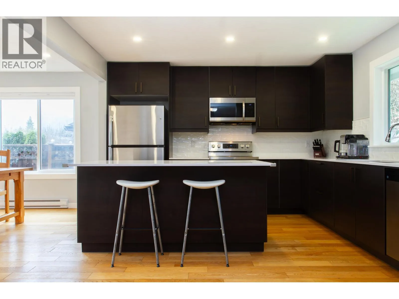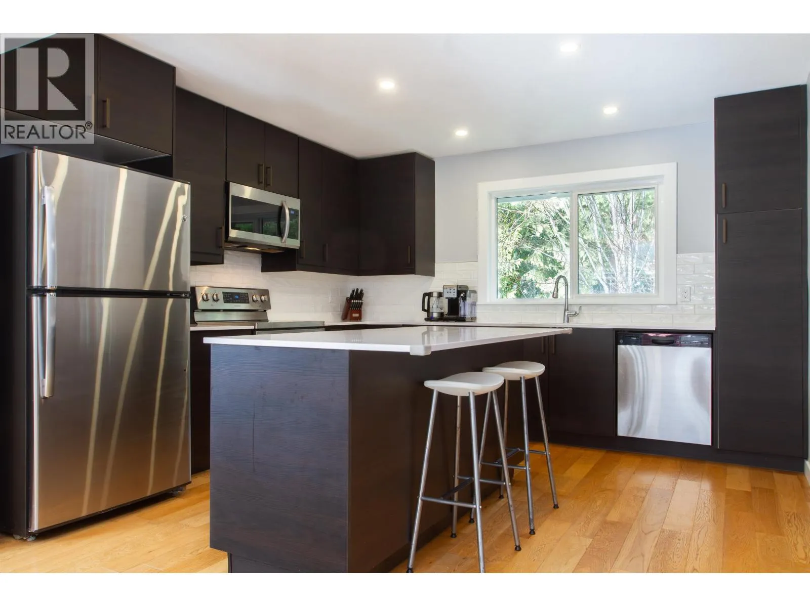 This charming character home lives much larger than the size indicated with 3 spacious bdrms, 2 1/2 new bathrooms, family room & "real" laundry room. Extensive renovations include an open plan living, oak engineered hardwood floors, triple glazed windows & new roof. The new kitchen offers an abundance of drawers & cabinets, quartzite counters & breakfast island. French doors open to the expansive private deck (32x14) that backs onto a meandering creek & easy care fenced yard. Upstairs are 2 bdrms, new 5 pc main bath, primary bedroom, w/in closet & new 4 pc ensuite. Enjoy the double garage with EV charger, level driveway, landscaped yard with a privacy hedge. Excellent location; family friendly, mountain bike trails & public transit around the corner & GH elementary school just blocks away. (id:27476)