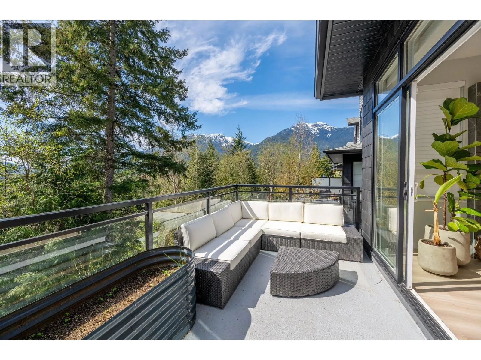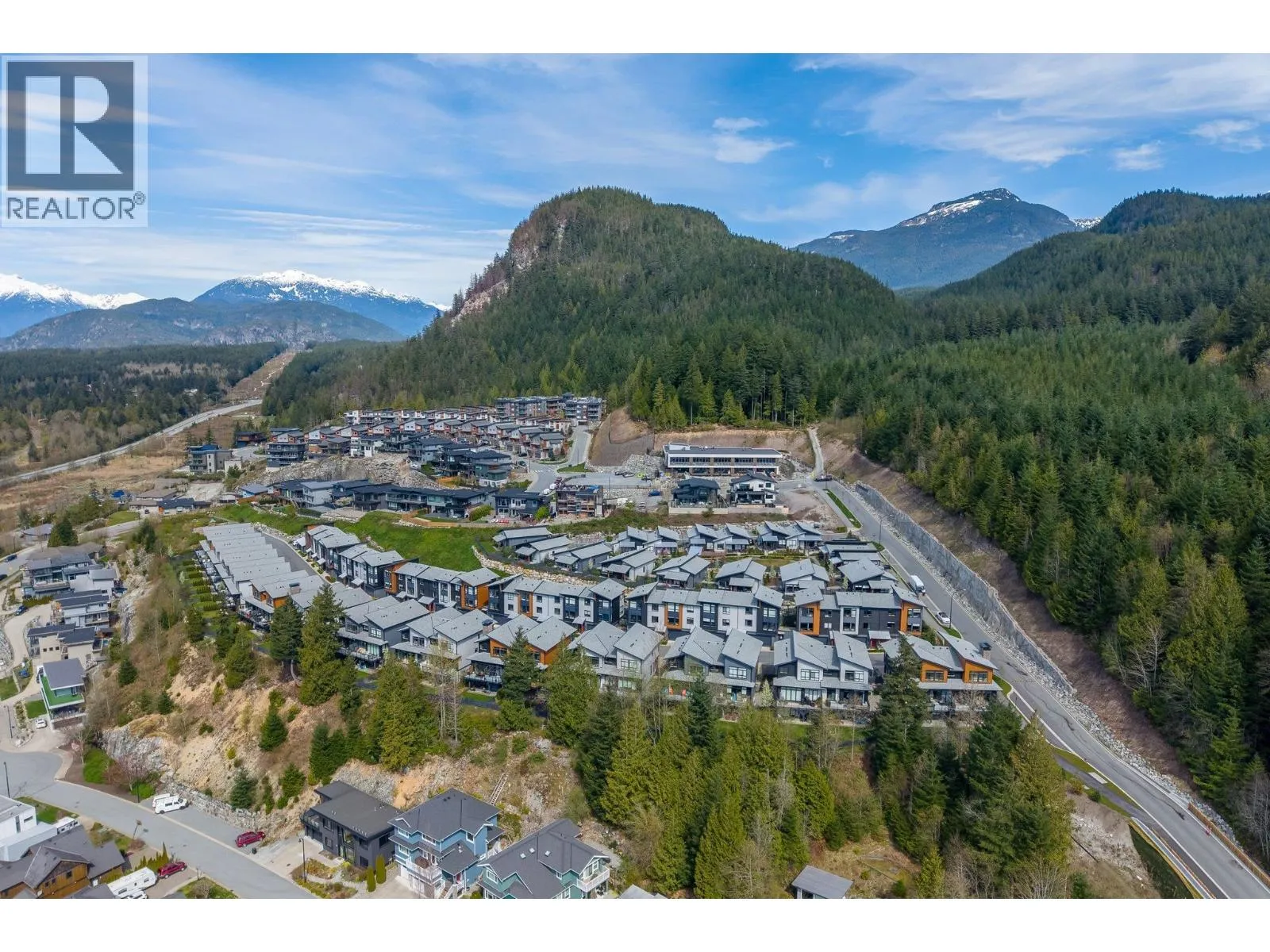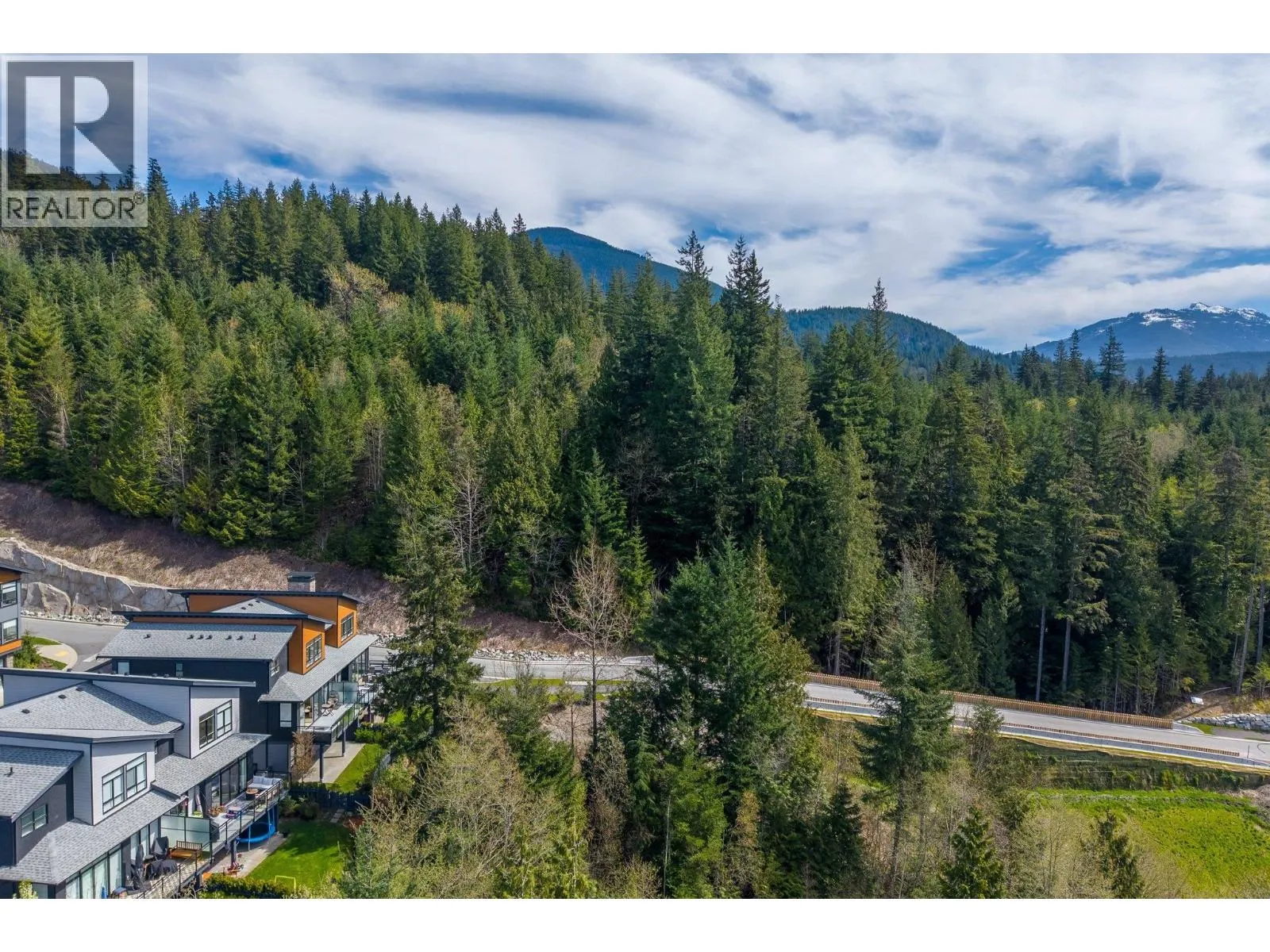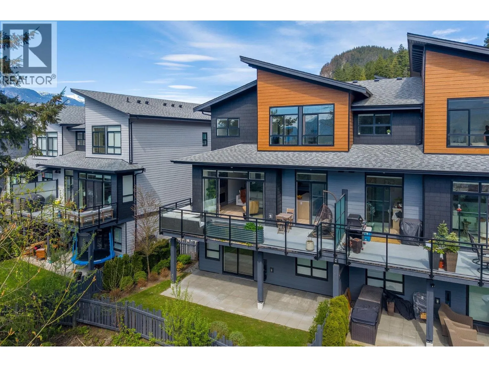 STUNNING half duplex at modern elevated 'Highline' by Polygon w/mountain views, privacy & treed outlook! Enjoy abundant natural light, 3 exposures, 9.5 ft ceilings, over height windows & doors, a true open plan great room w/sense of space. Deluxe kitchen + living w/fireplace both open out to south deck! The width of the home provides a generous layout on all 3 levels. Up: Unique 3 bedrooms all with ensuites, primary with views to the Chief, Habrich + Tantalus Range, laundry rm. Down: option for 4th bedroom, office/media/rec room with full bathroom. Opening out to covered patio + fenced yard tops it all off beautifully! Experience life w/views, next to the forest, walk to the 5 lakes, bike on world class trails! Double garage. This one has it all! No GST (id:27476)