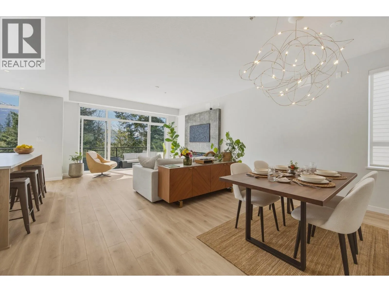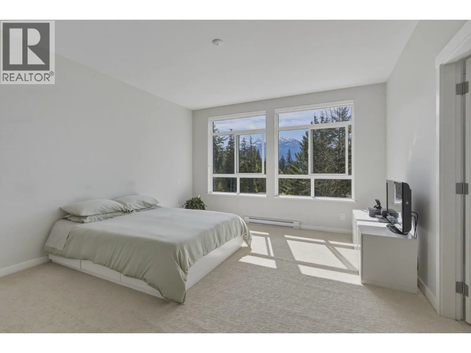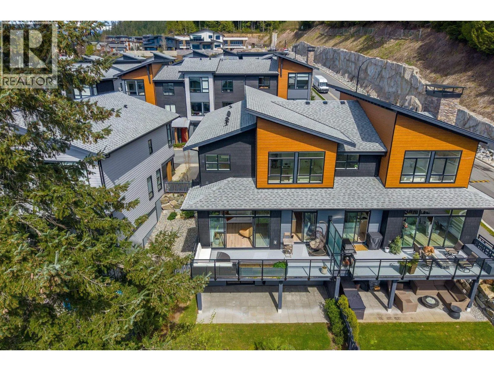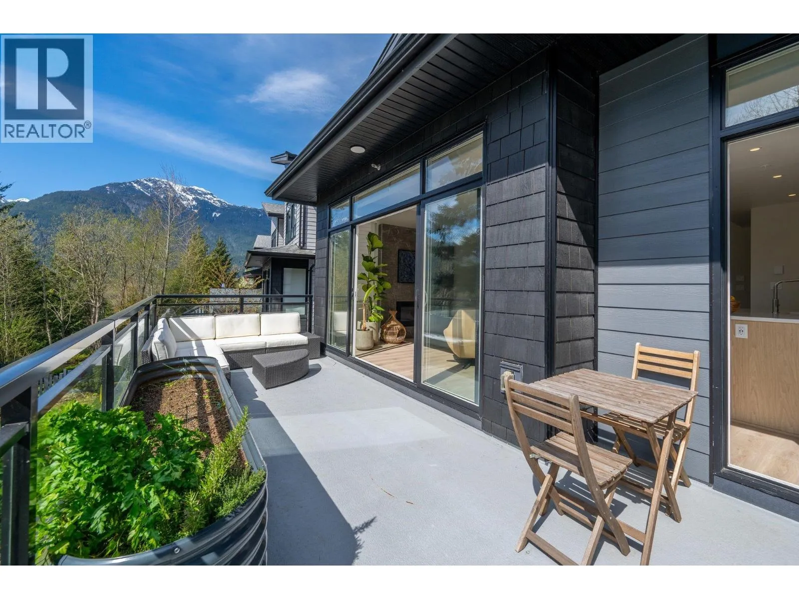 STUNNING half duplex at modern elevated 'Highline' by Polygon w/mountain views, privacy & treed outlook! Enjoy abundant natural light, 3 exposures, 9.5 ft ceilings, over height windows & doors, a true open plan great room w/sense of space. Deluxe kitchen + living w/fireplace both open out to south deck! The width of the home provides a generous layout on all 3 levels. Up: Unique 3 bedrooms all with ensuites, primary with views to the Chief, Habrich + Tantalus Range, laundry rm. Down: option for 4th bedroom, office/media/rec room with full bathroom. Opening out to covered patio + fenced yard tops it all off beautifully! Experience life w/views, next to the forest, walk to the 5 lakes, bike on world class trails! Double garage. This one has it all! No GST (id:27476)