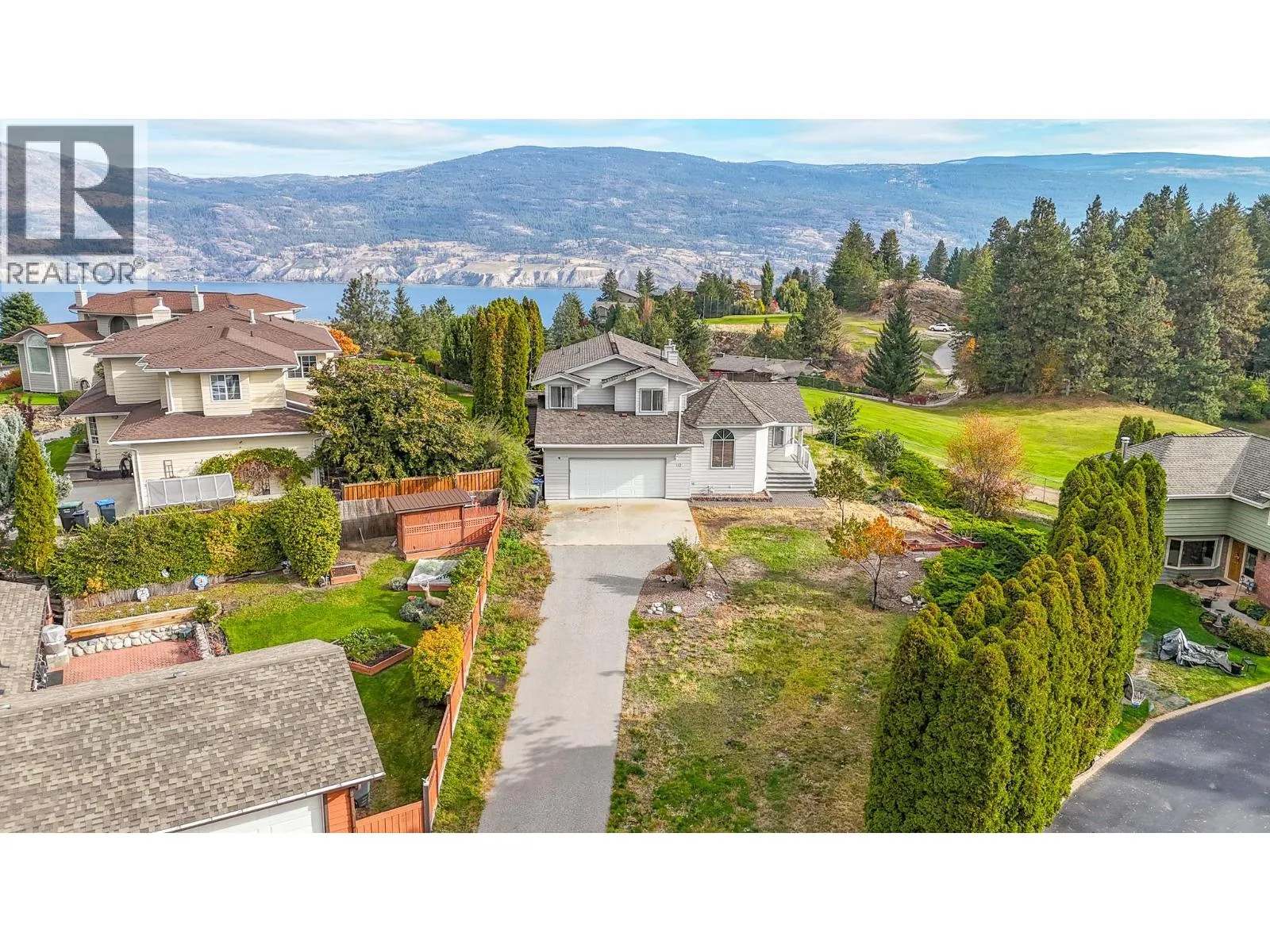 Lovely views of Okanagan Lake from this two-storey home, nestled in the quiet subdivision of Sumac Ridge Lakeview Estates, just north of town. The spacious 3 bedroom and den, 2.5 bathroom home offers the perfect blend of comfort, character, and privacy. Inside, you'll find vaulted ceilings that enhance the open, airy feel of the main living area. A cozy family room off the kitchen, complete with a gas fireplace, creates the perfect space for relaxing or entertaining. The versatile den makes a great home office or hobby space. Upstairs, the large primary suite features a full ensuite bathroom and opens onto a private deckâperfect for enjoying peaceful mornings with views of the 8th tee box and Okanagan Lake. Outdoors, enjoy your tranquil yard with mature landscaping, raised garden boxes and underground irrigation. The double car garage and extended driveway provide ample parking and added privacy from the road. This unique property combines a desirable location, thoughtful layout, and a classic traditional designâideal for families, golf enthusiasts, or anyone seeking a serene lifestyle. (id:27476)