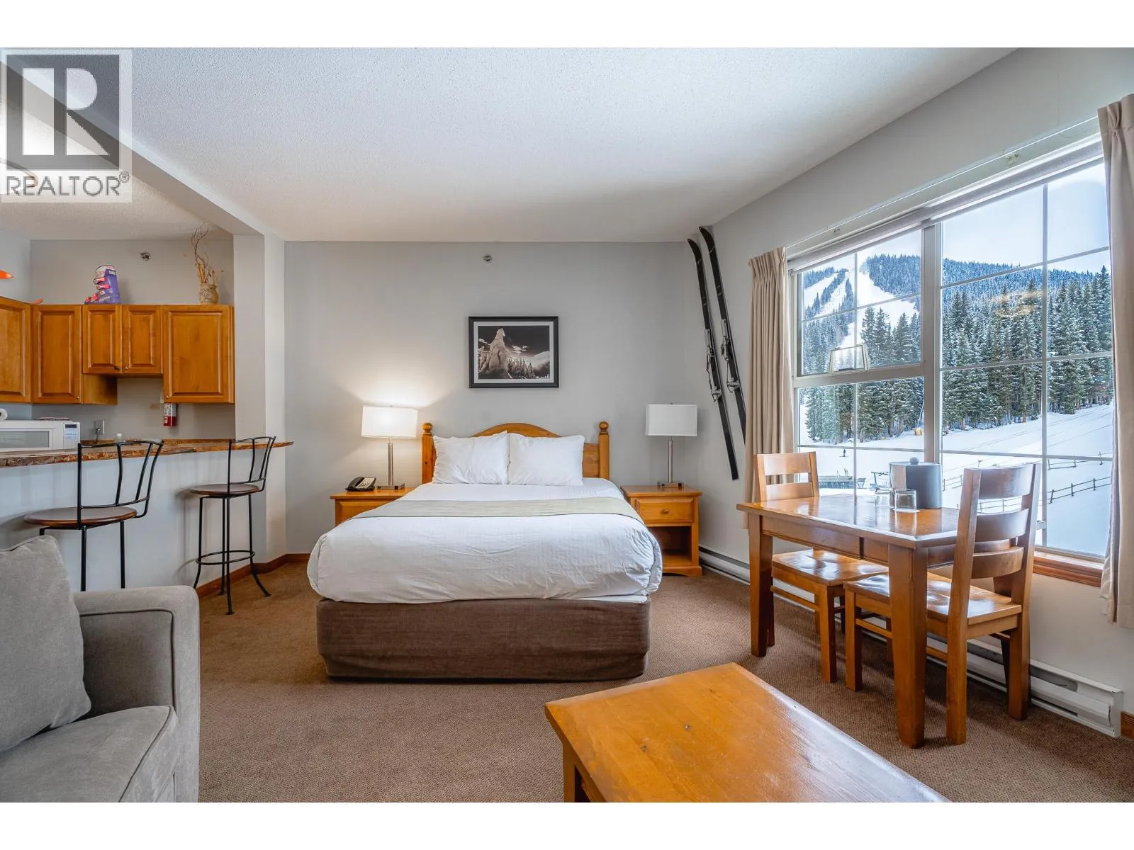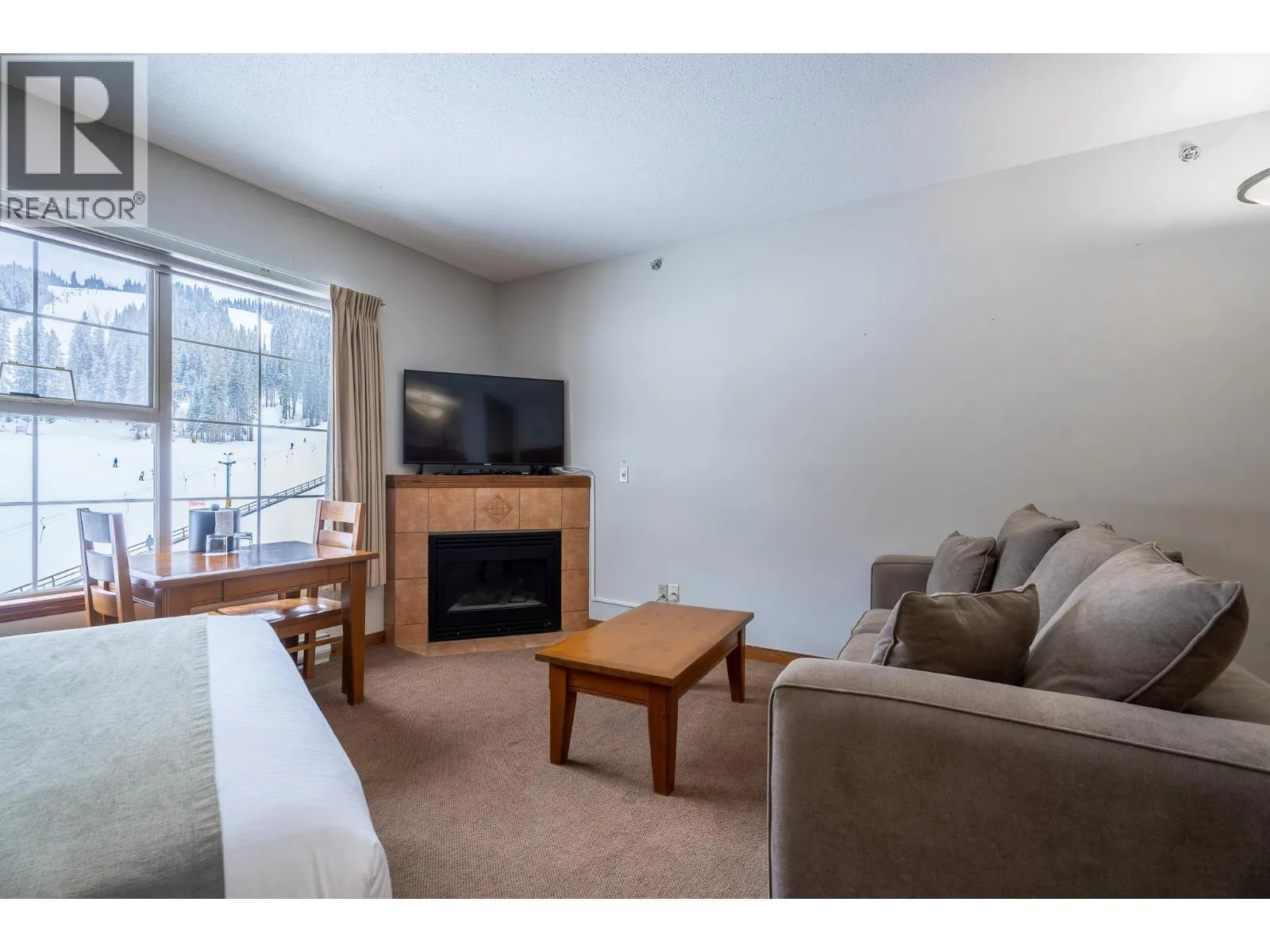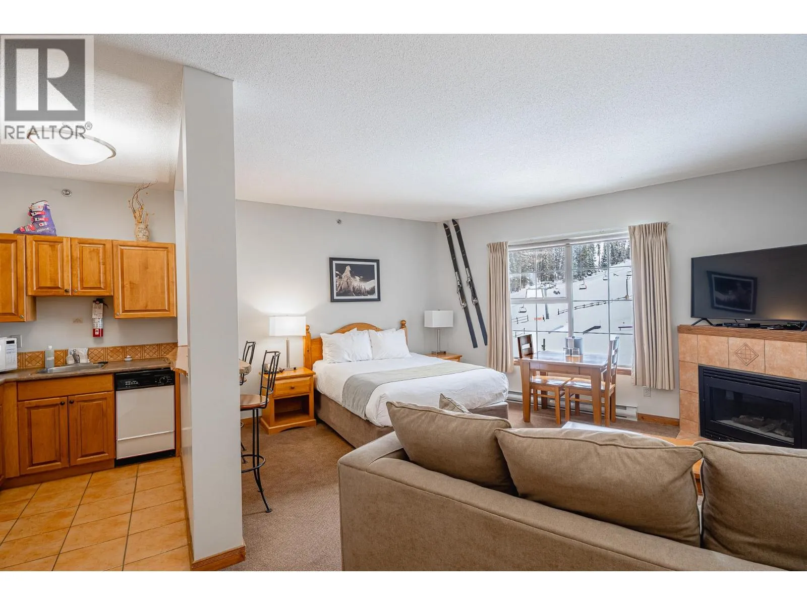 This bright and stylish deluxe studio apartment boasts a full kitchen with ample cabinetry and a private ownerâs storage locker. The inviting open layout, complete with a cozy fireplace, comfortably accommodates four guests. Enjoy breathtaking views of the main ski lifts and runs right from your window. Perfectly positioned in a prime ski-in/ski-out slope side location, this unit also offers a dedicated ski/bike storage room, secure underground parking, a hot tub, a fitness center, and easy access to restaurants and all village amenities. Sundance Lodge is at the heart of the Resort, close to shopping and year-round activities. Owners benefit from up to 180 days of personal use annually, with the peace of mind that front desk management takes care of everything in their absence. This unit may be sold together with the neighboring studio, #406, and comes fully furnished. (id:27476)