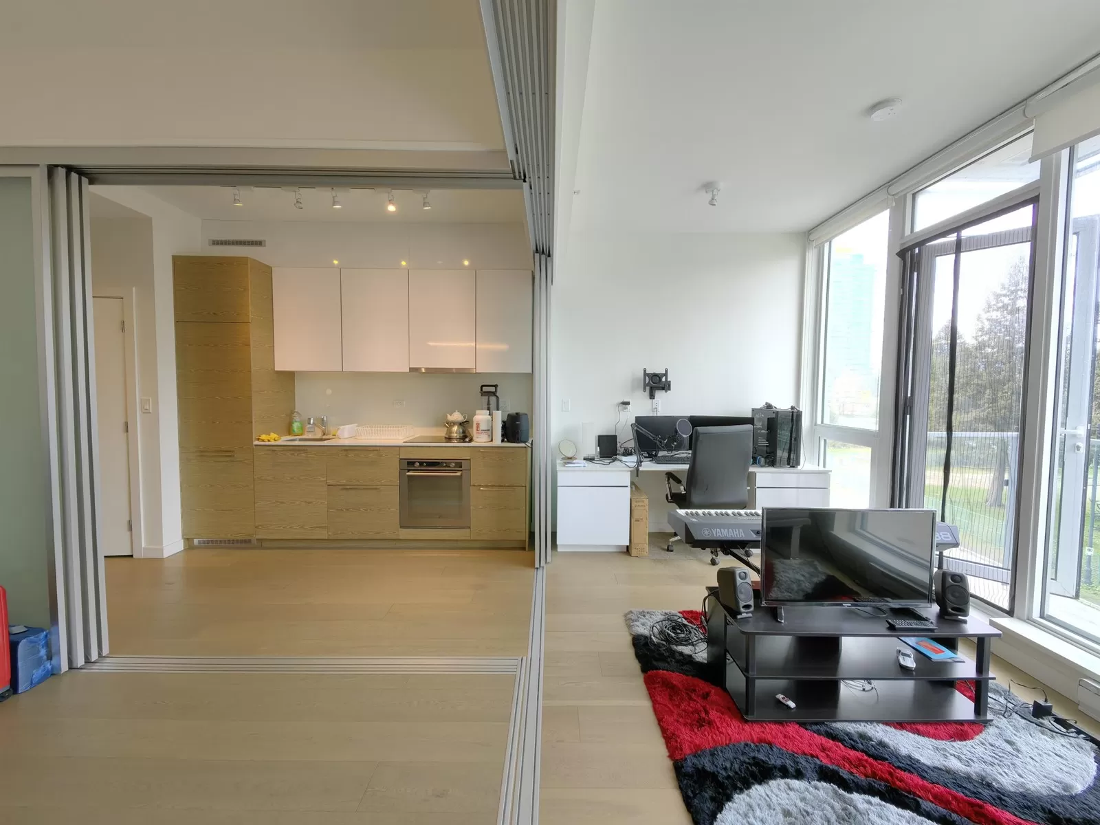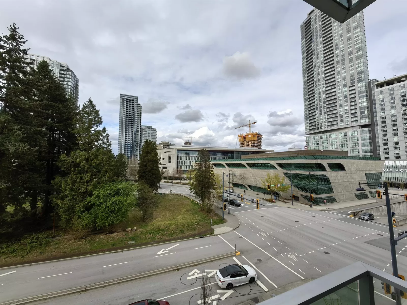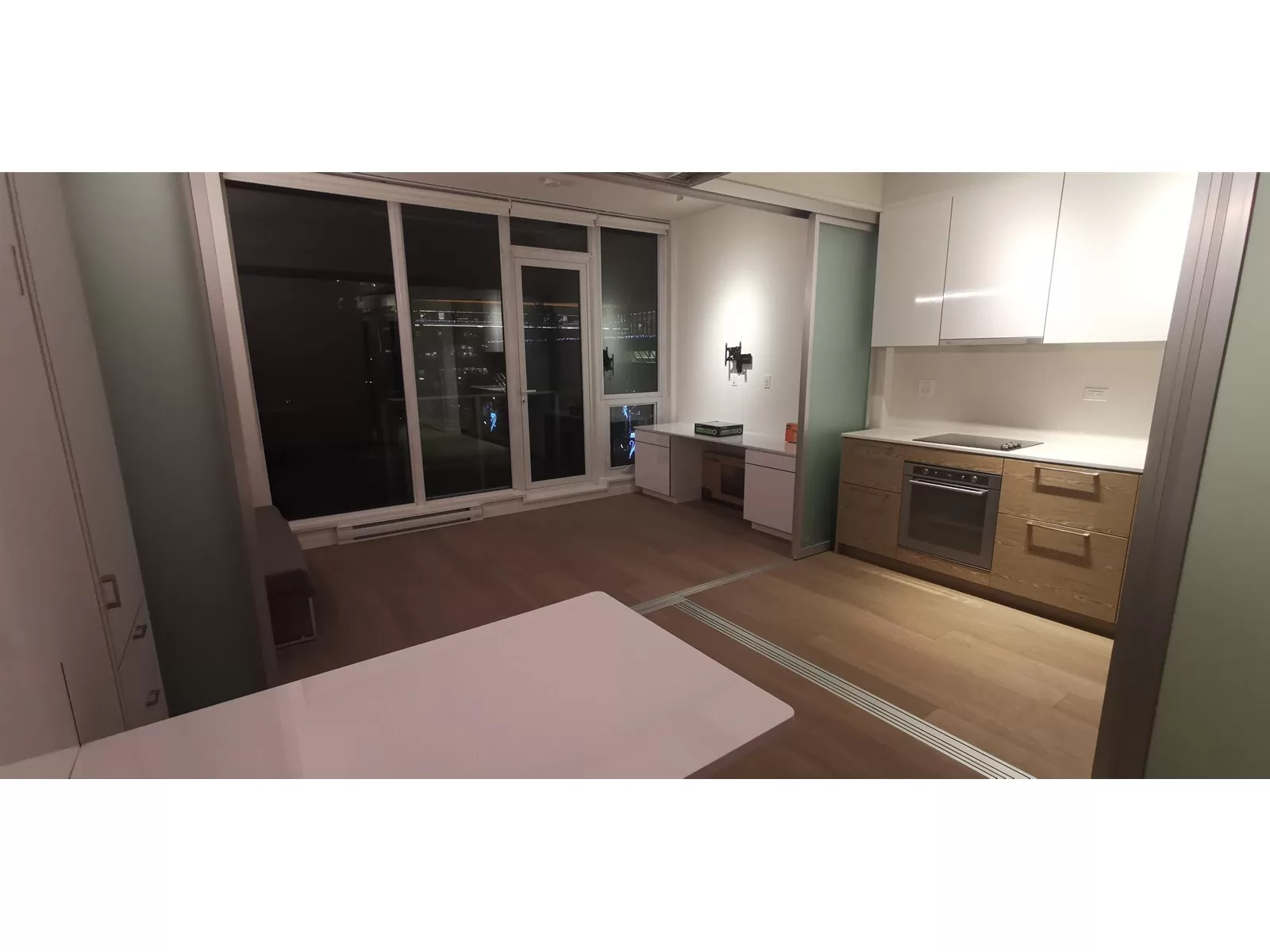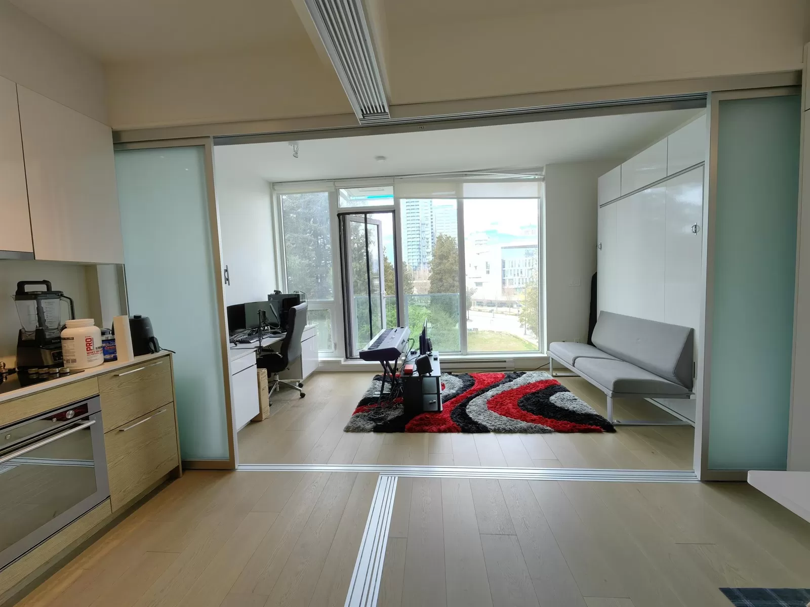 Prime on Plaza! Excellent unbeatable location! Steps from Skytrain , SFU and KPU campuses . The unit includes stainless steel appliances , 2 pull out murphy beds and dining table and sofa with 1 storage locker! Sliding walls to make it 2 bedrooms. Over-height ceilings , hardwood engineered floors ,high-efficiency Low-E windows , custom roller blinds and built-in LED lighting. Amenities include a gym, yoga studio, massage room, sauna/steam room, entertainment rooms with kitchen, business center, study room and a rooftop patio and garden . Call or text for a showing. (id:27476)