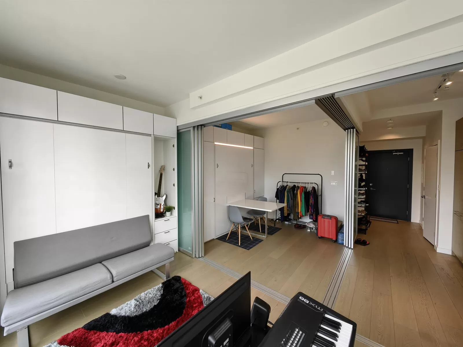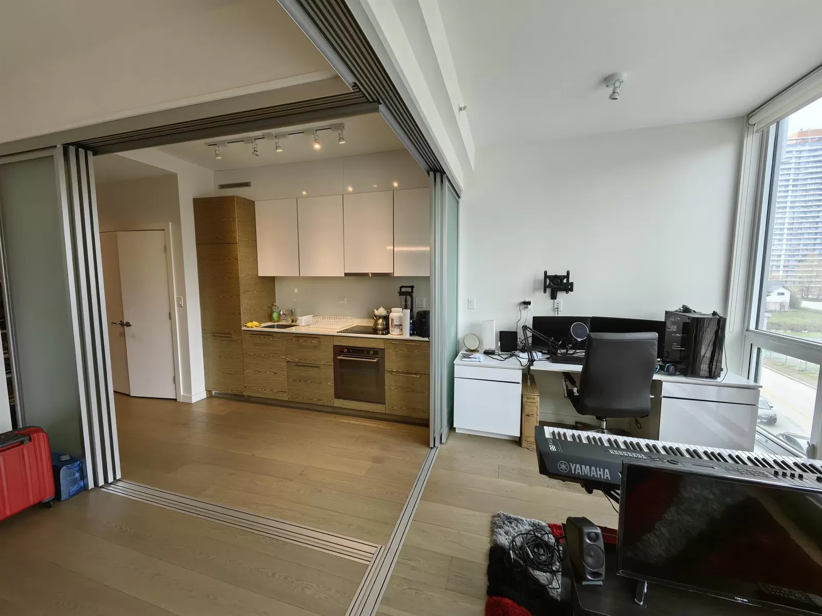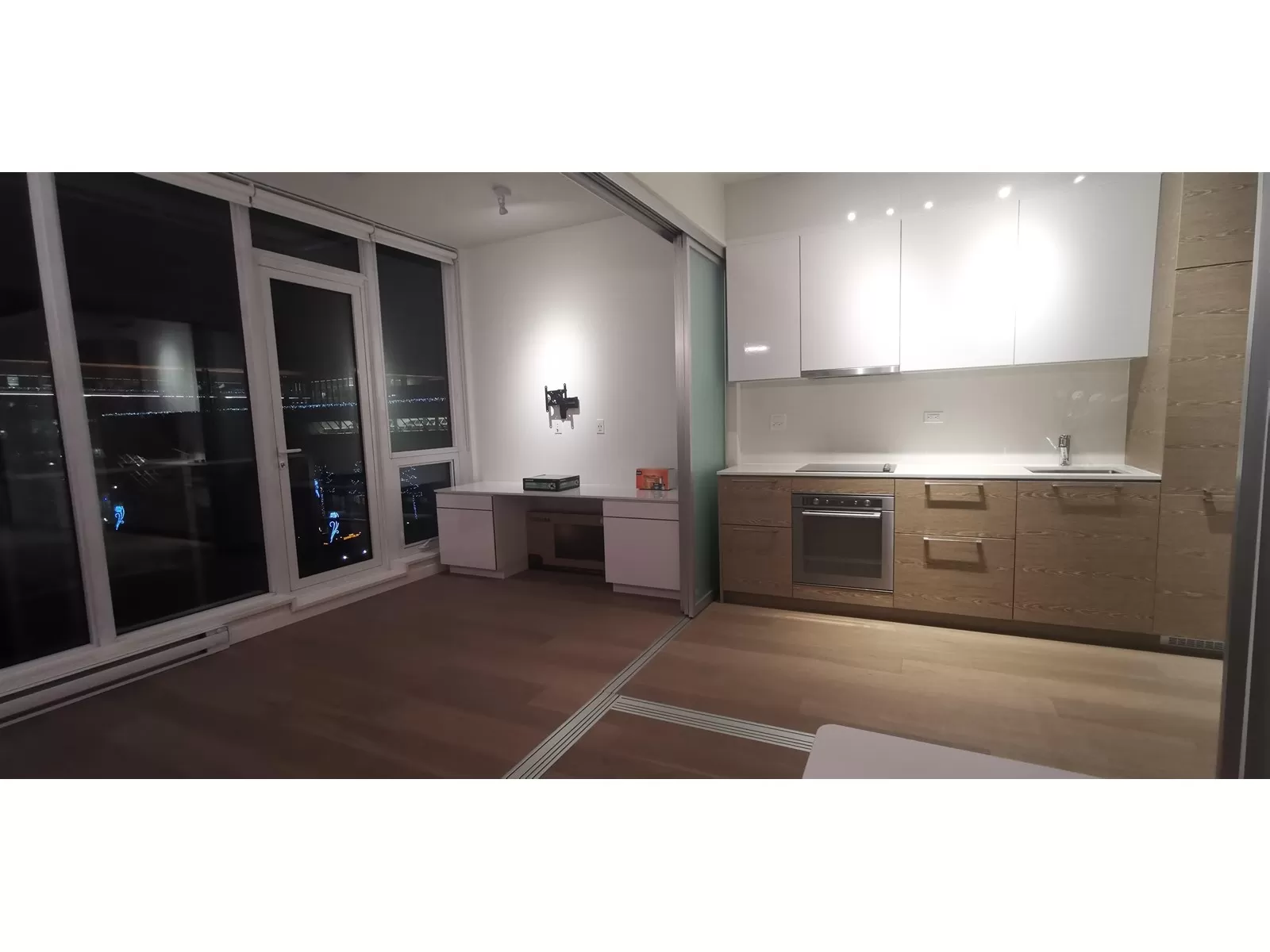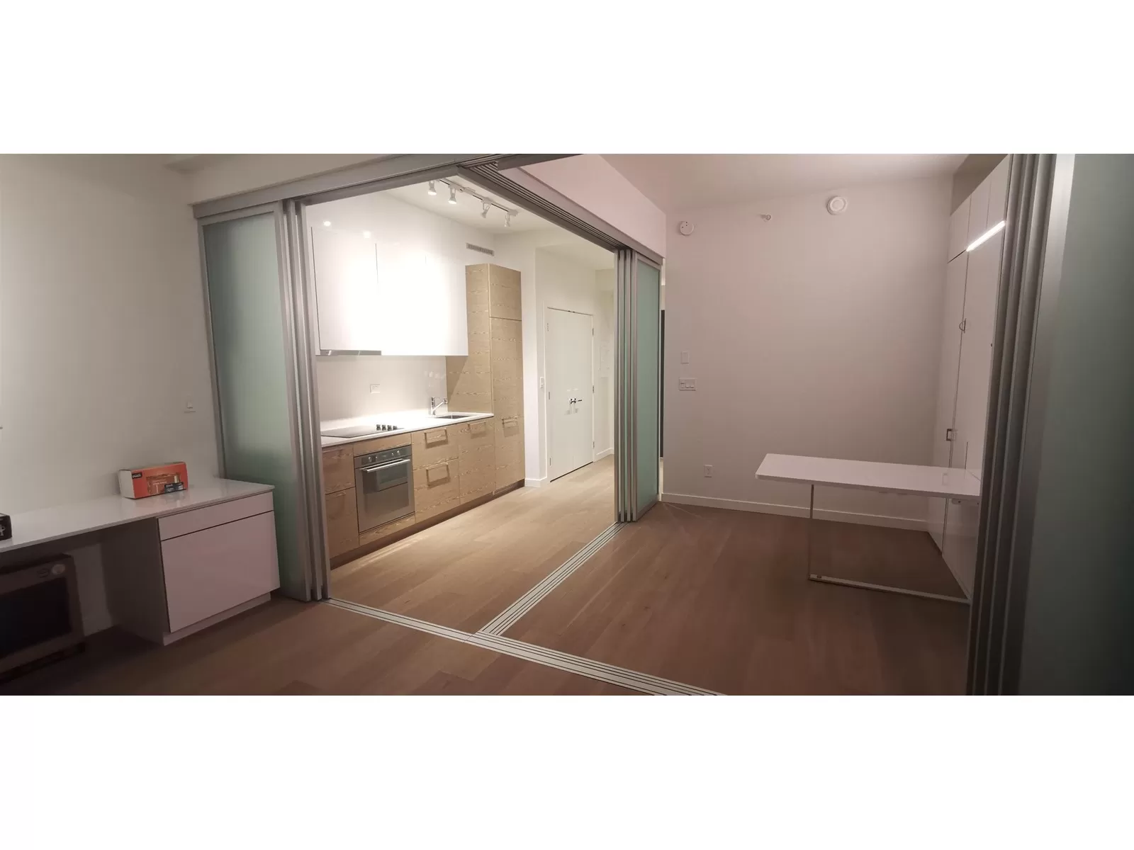 Prime on Plaza! Excellent unbeatable location! Steps from Skytrain , SFU and KPU campuses . The unit includes stainless steel appliances , 2 pull out murphy beds and dining table and sofa with 1 storage locker! Sliding walls to make it 2 bedrooms. Over-height ceilings , hardwood engineered floors ,high-efficiency Low-E windows , custom roller blinds and built-in LED lighting. Amenities include a gym, yoga studio, massage room, sauna/steam room, entertainment rooms with kitchen, business center, study room and a rooftop patio and garden . Call or text for a showing. (id:27476)