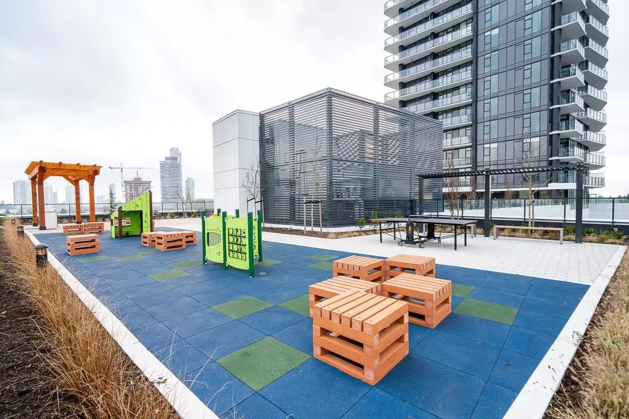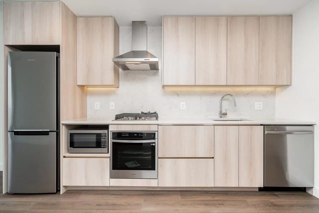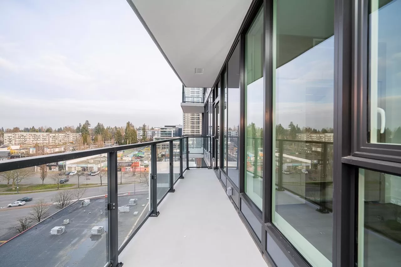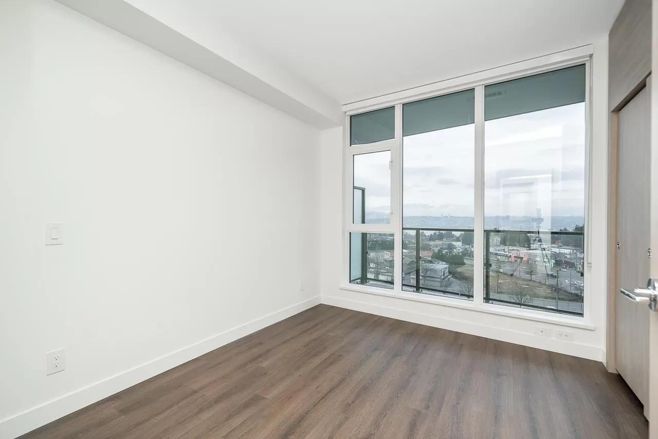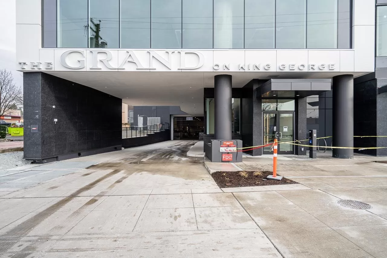 Modern Living at The Grand on King George. Stylish 1-bedroom + den, 1-bathroom condo on the 8th floor with 567 sqft of open living space and a 93 sqft balcony. Features include custom millwork doors, illuminated closet organizers, CENTRAL HEATING & COOLING, Wi-Fi-enabled Samsung appliances, GAS cooktops (included in strata fees), and efficient kitchen cabinet organizers. Enjoy 23,000 sqft of premium amenities: a private off-leash skypark, state-of-the-art fitness centre, VR room, outdoor BBQ and park area, playground, and 24/7 concierge. Conveniently located above five floors of commercial space with coffee shops, medical offices, and daycare at your doorstep. Less than 5 minutes' walking distance from Gateway Skytrain Station, schools, and easy access to Highway 1. (id:27476)