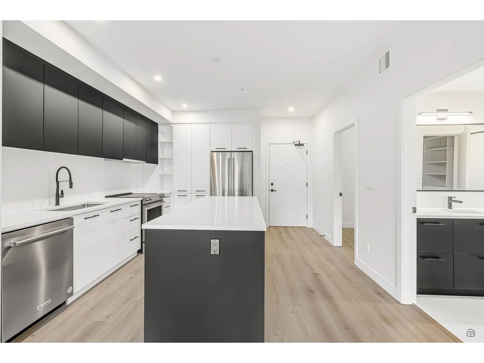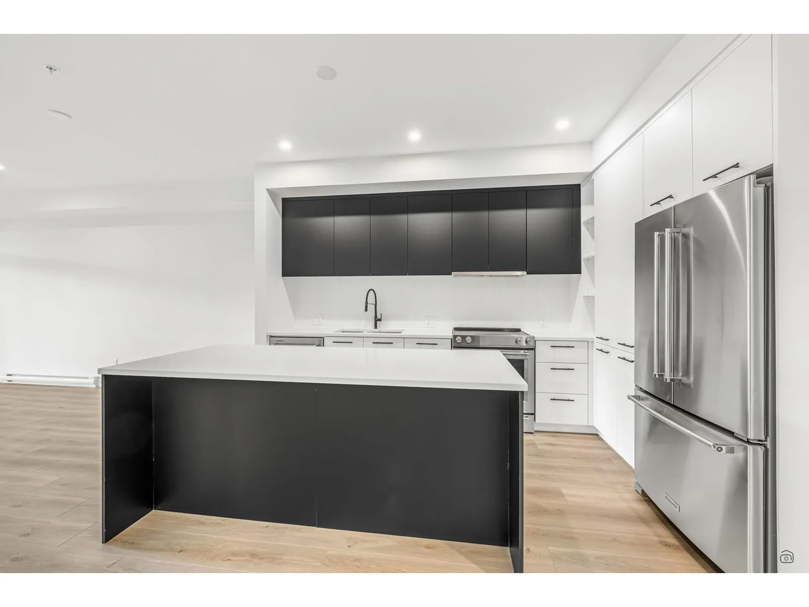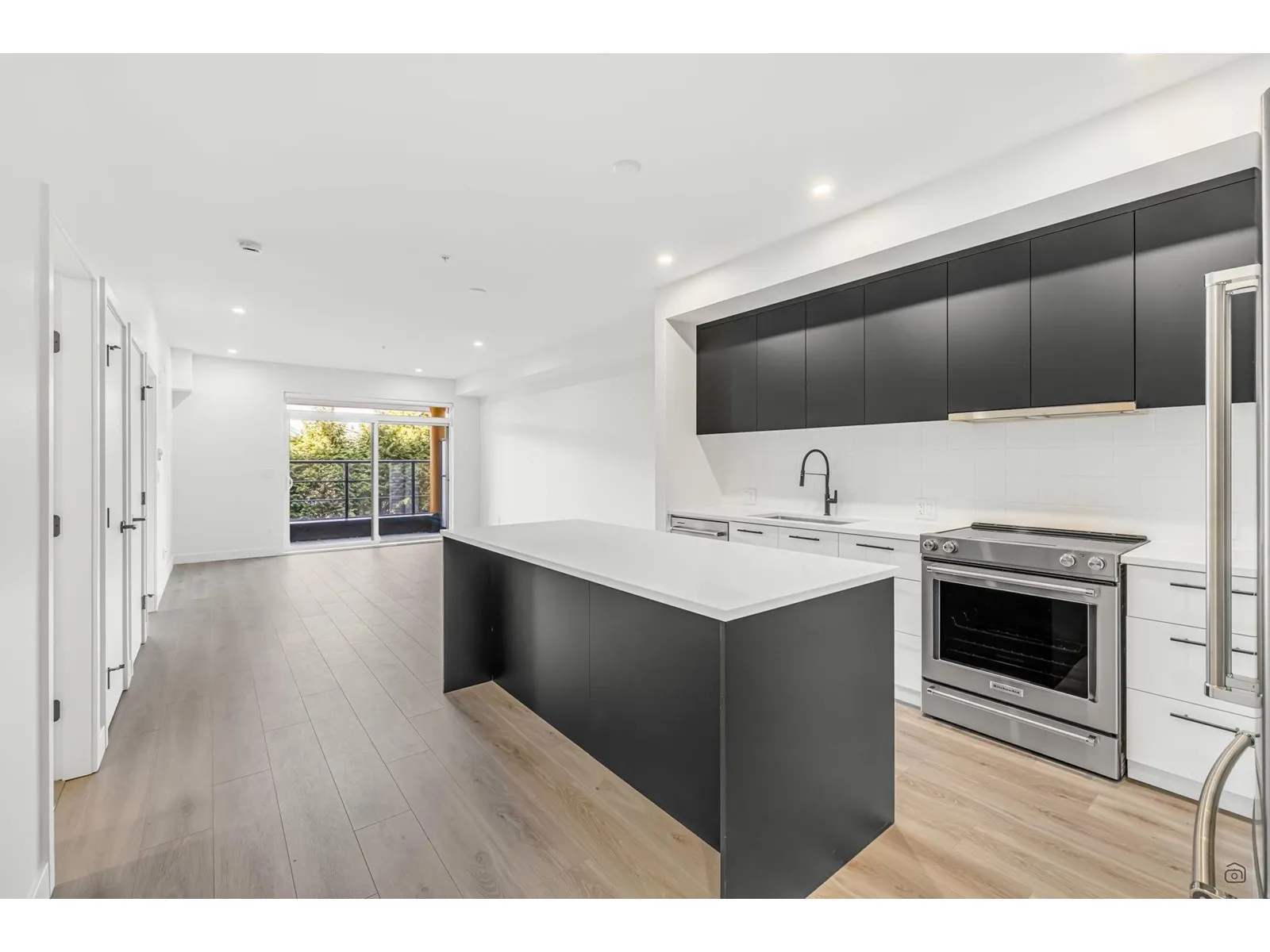 Welcome to Odyssey by the award-winning Forge Properties! This stunning 2-bedroom home features an open-concept layout with full-sized stainless steel appliances, sleek black matte plumbing fixtures, and elegant white quartz countertops complemented by a white tile backsplash. Enjoy the privacy of your own balcony and the warmth of wide-plank wood-grain laminate flooring. Additional highlights include a Whirlpool washer & dryer, rough-in for air conditioning, and a designated parking spot with a storage locker. Residents have access to a state-of-the-art Health & Fitness Centre with a sauna and fully equipped lounges. Ideally situated just off King George Blvd & 152nd St, this home offers convenience with nearby amenities, transit, highways, parks, schools, and a short drive to the beach! (id:27476)