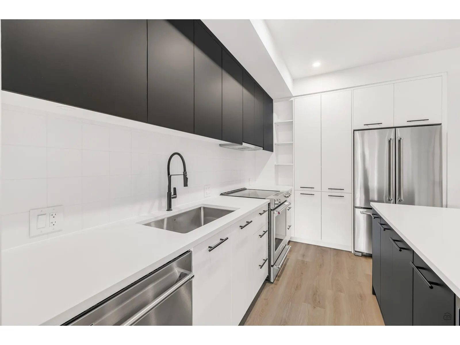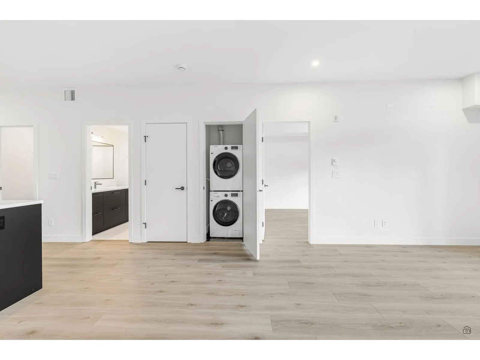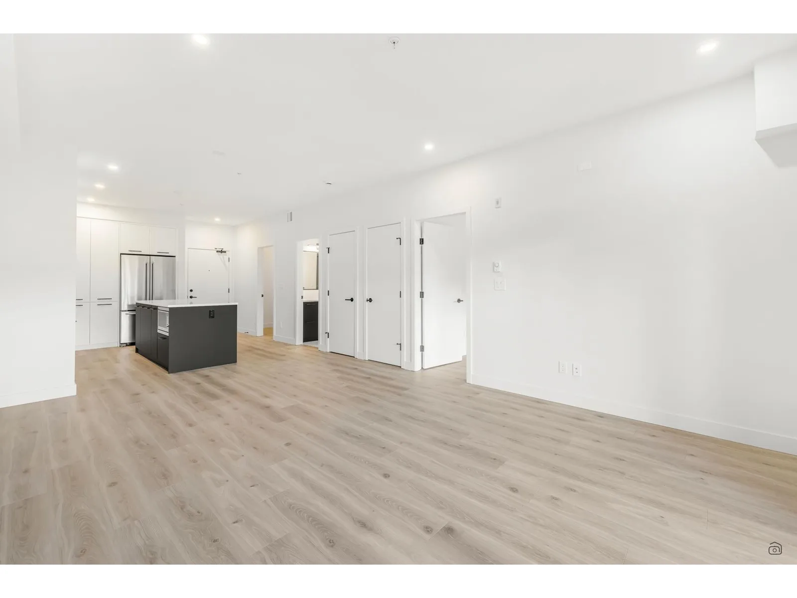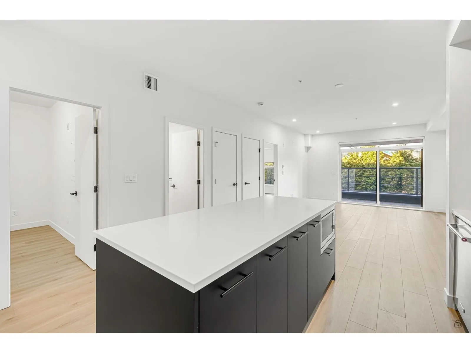 Welcome to Odyssey by the award-winning Forge Properties! This stunning 2-bedroom home features an open-concept layout with full-sized stainless steel appliances, sleek black matte plumbing fixtures, and elegant white quartz countertops complemented by a white tile backsplash. Enjoy the privacy of your own balcony and the warmth of wide-plank wood-grain laminate flooring. Additional highlights include a Whirlpool washer & dryer, rough-in for air conditioning, and a designated parking spot with a storage locker. Residents have access to a state-of-the-art Health & Fitness Centre with a sauna and fully equipped lounges. Ideally situated just off King George Blvd & 152nd St, this home offers convenience with nearby amenities, transit, highways, parks, schools, and a short drive to the beach! (id:27476)