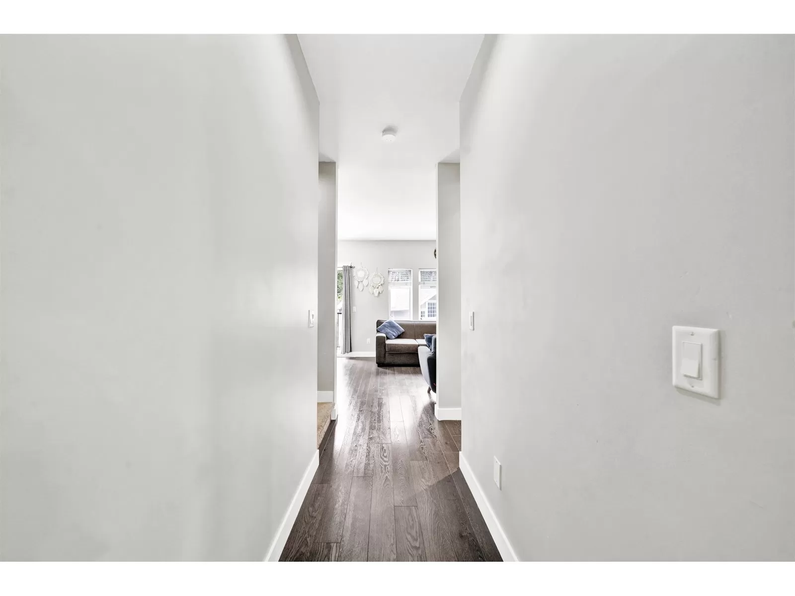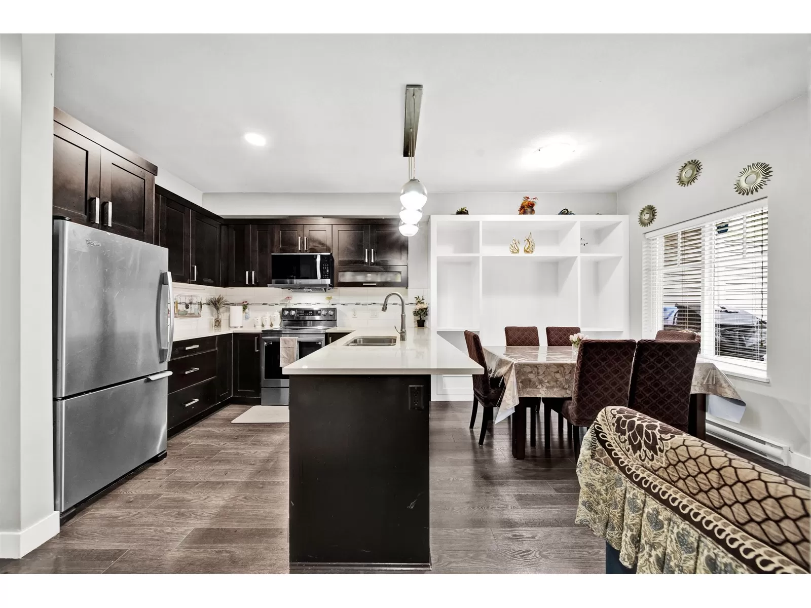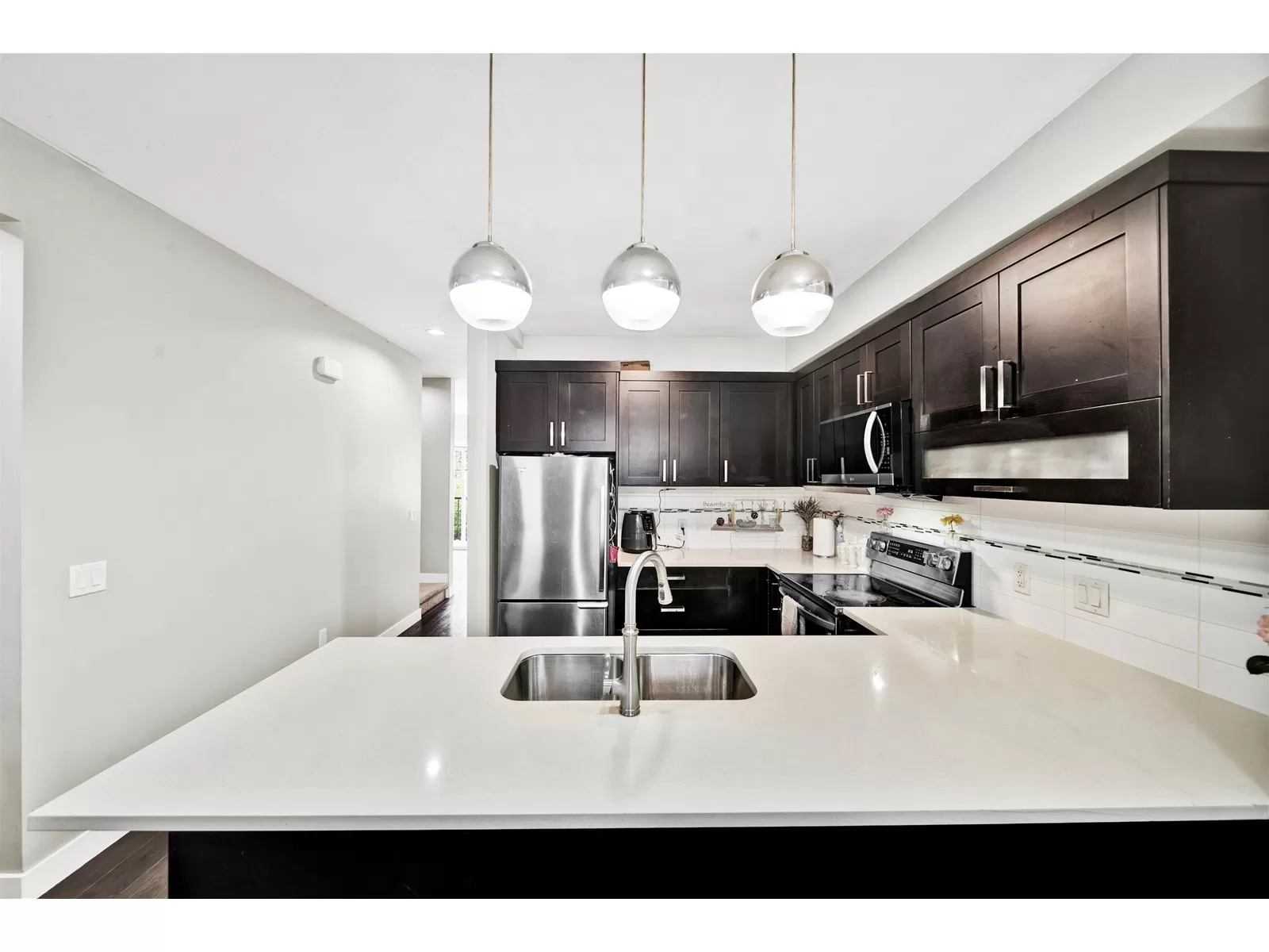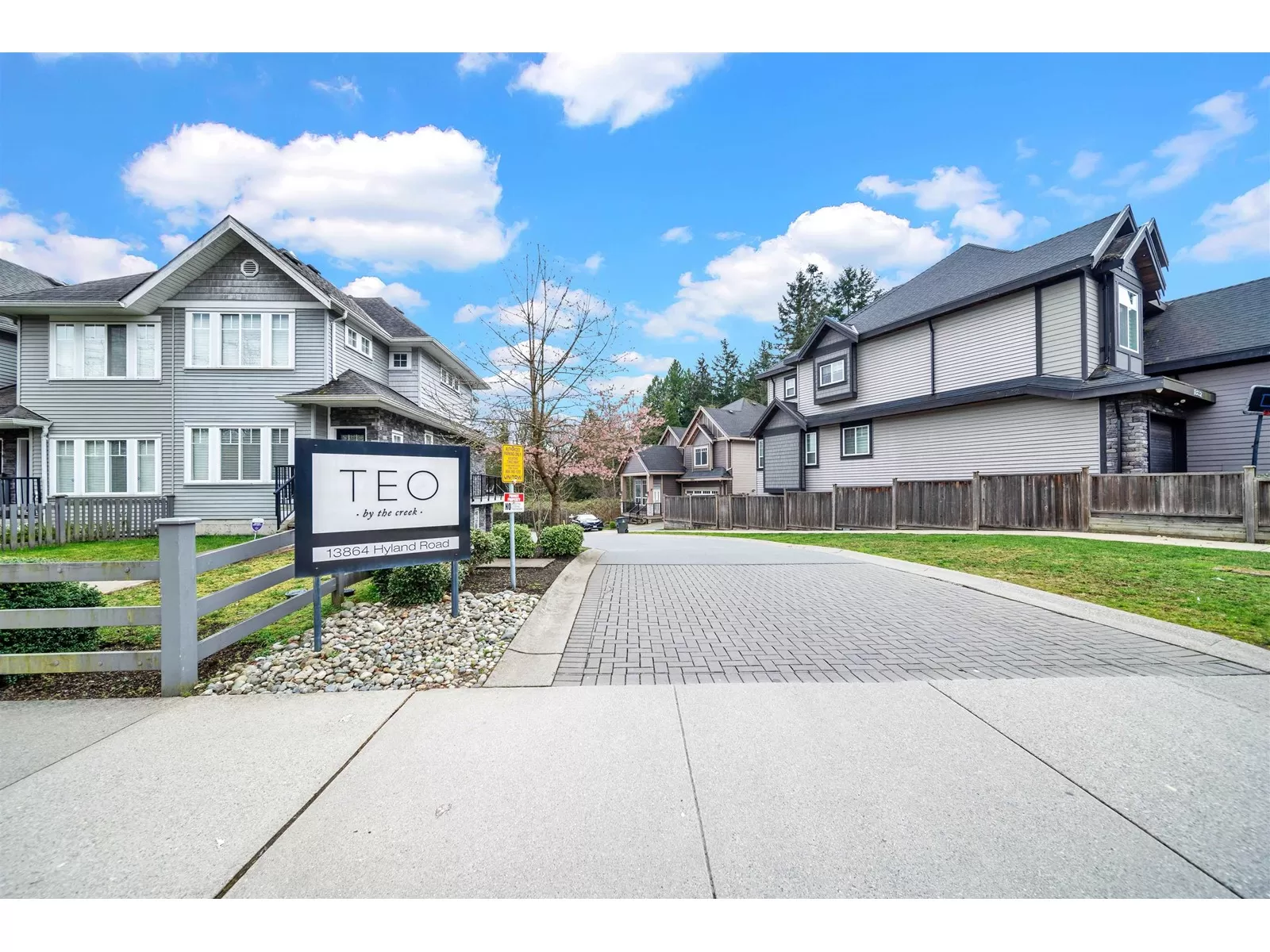 Former show home at Teo by the Creek. This 3 bed / 3 bath townhome faces a protected greenbelt and is situated on the quiet side of the complex. Features include a powder room on the main floor, quartz countertops throughout, soft-close shaker cabinets, stainless steel appliances, and a front-facing balcony. Walk out to a private yard directly from the living room. Freshly painted and well maintained. Convenient location near schools, shopping, transit, and recreation. (id:27476)