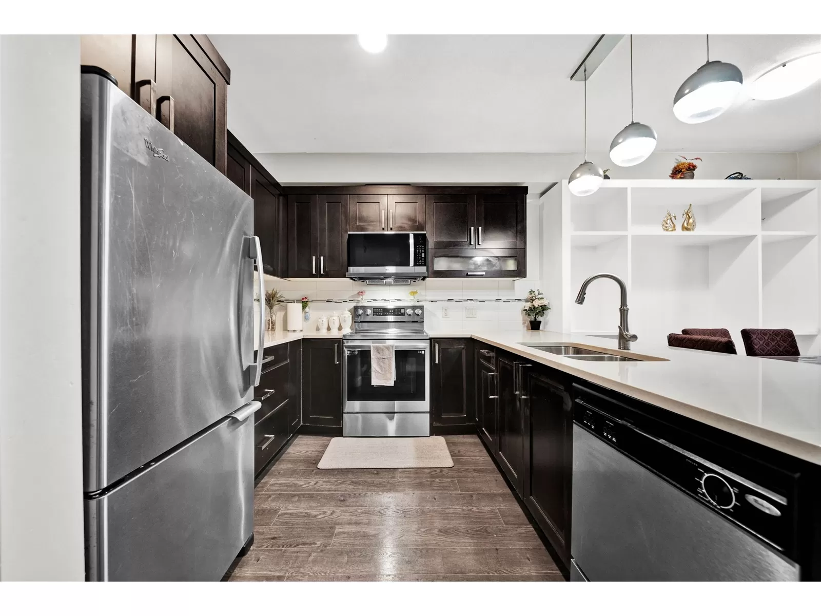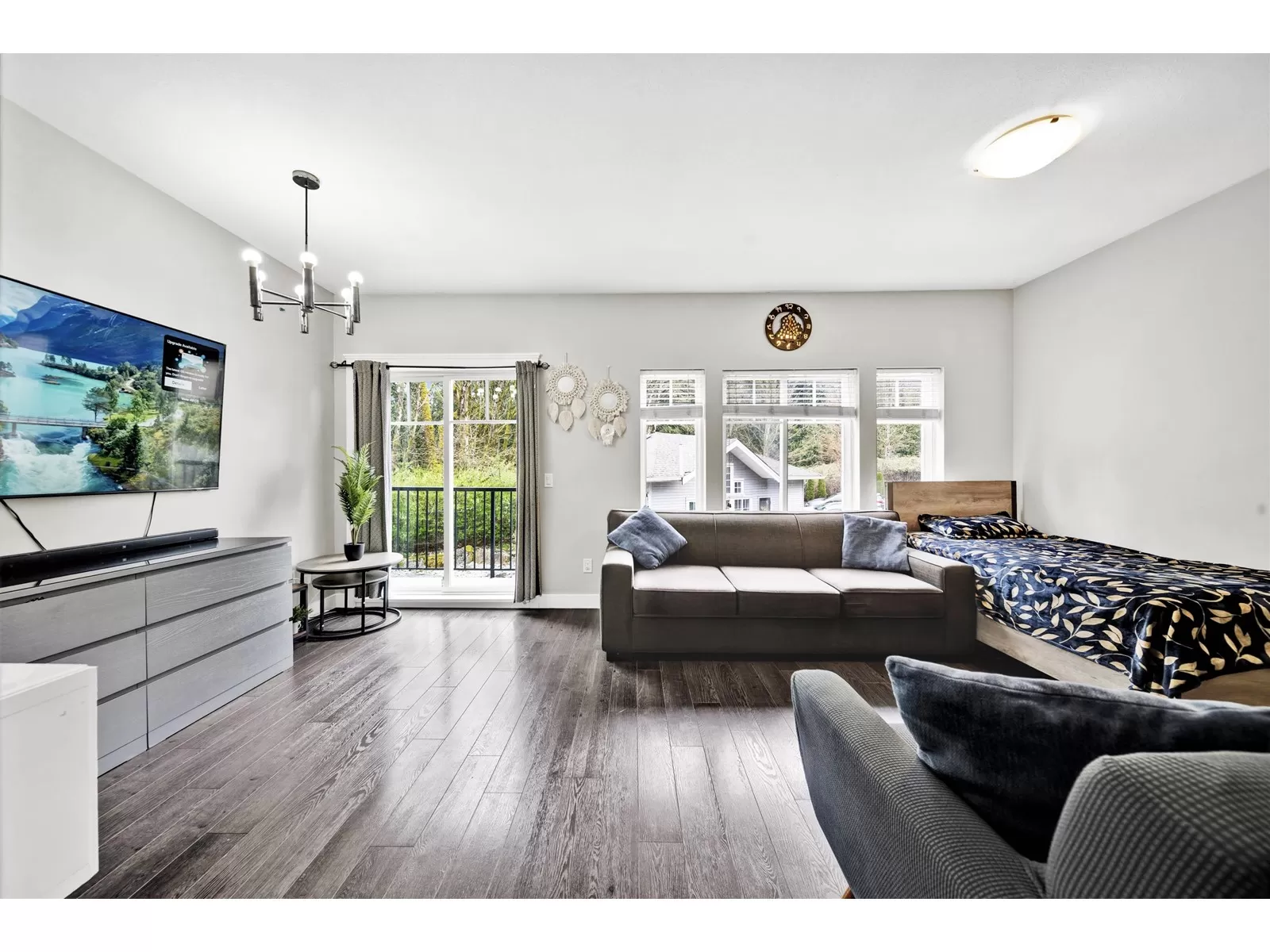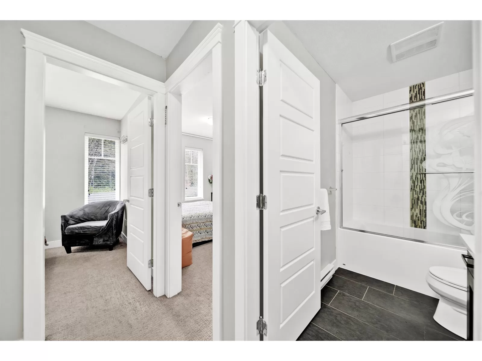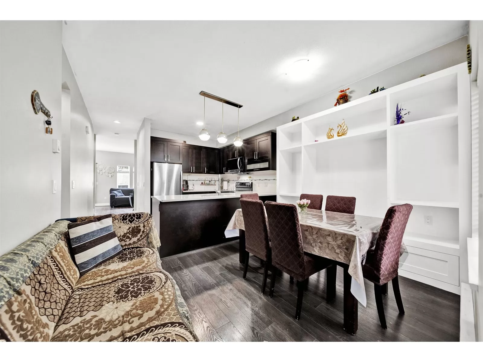 Former show home at Teo by the Creek. This 3 bed / 3 bath townhome faces a protected greenbelt and is situated on the quiet side of the complex. Features include a powder room on the main floor, quartz countertops throughout, soft-close shaker cabinets, stainless steel appliances, and a front-facing balcony. Walk out to a private yard directly from the living room. Freshly painted and well maintained. Convenient location near schools, shopping, transit, and recreation. (id:27476)