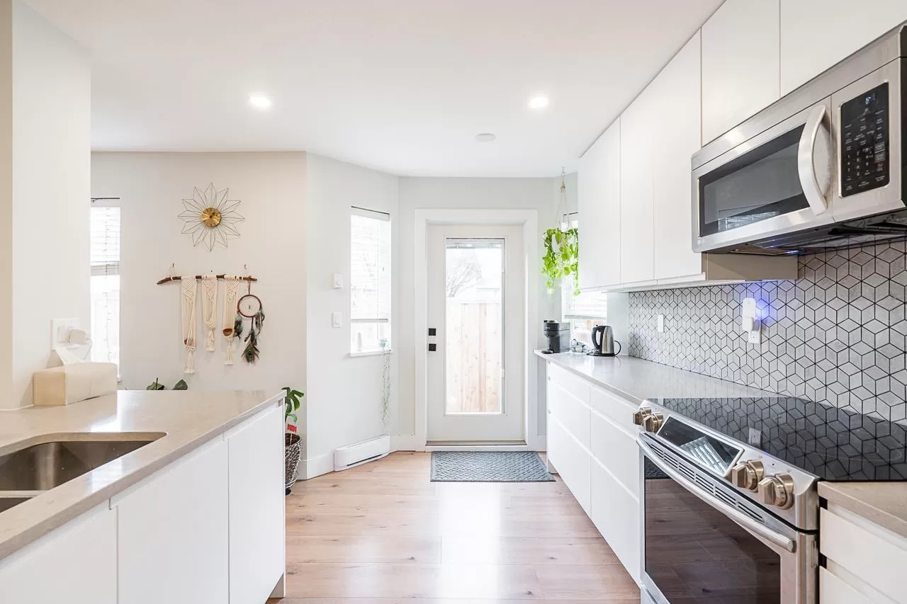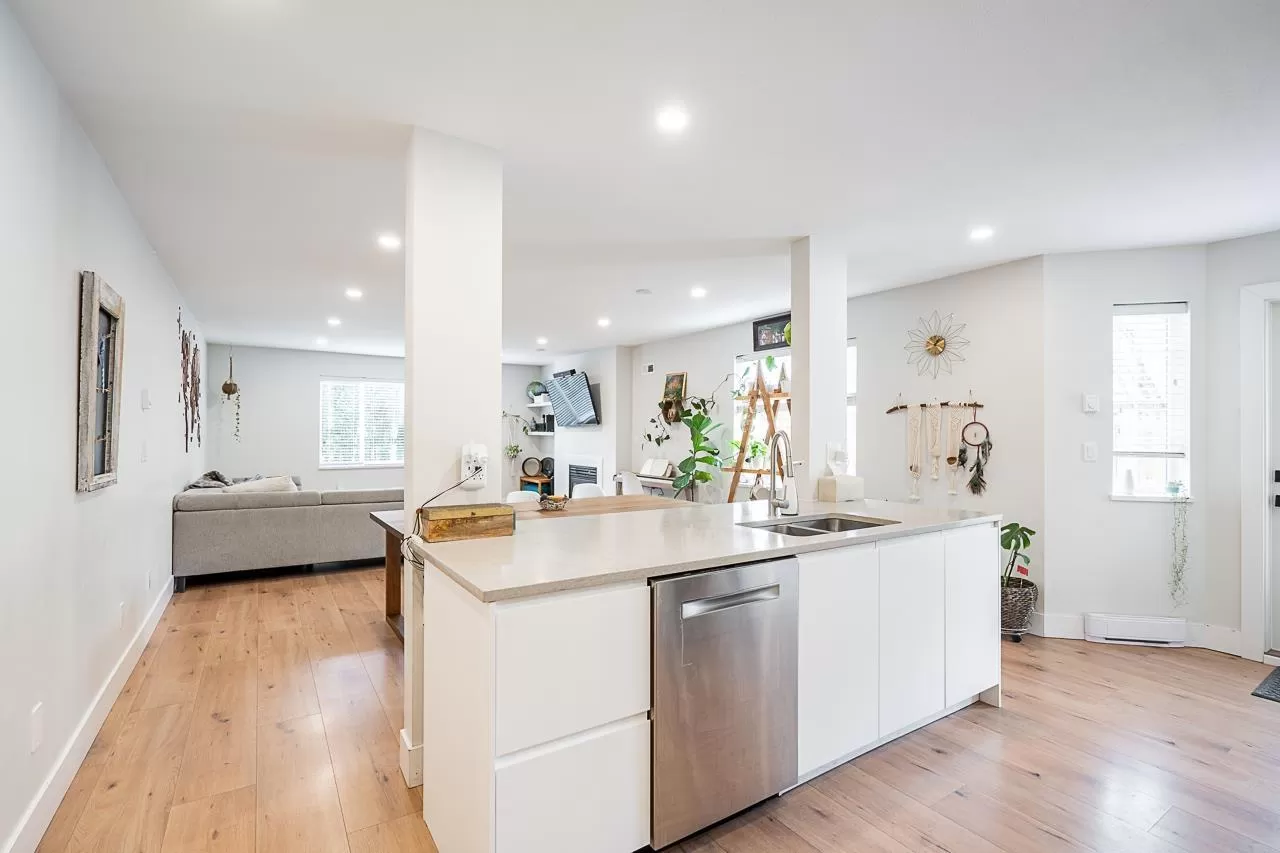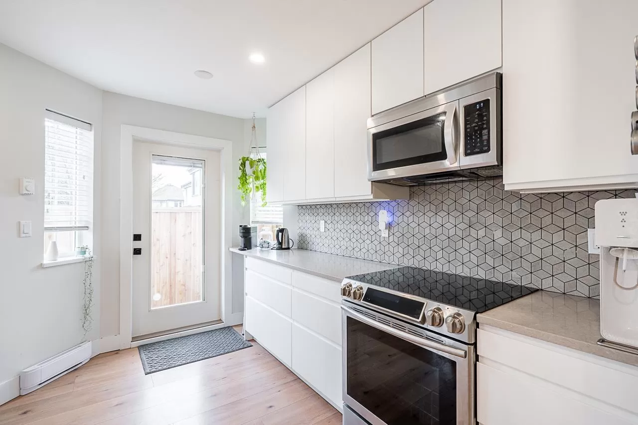 Renovated bright and spacious ground-level end unit townhouse in Fleetwood. Rancher style living at its best with this well-appointed 2 bedroom plus den (could be 3rd bedroom), 2 bathroom home. Features an open-concept great groom with recent updates throughout including new floors, kitchen cabinets with quartz counters and tile backsplash, paint, designer light fixtures, mouldings and stainless steel appliances. Lovely backyard with covered patio and BBQ area perfect for entertaining. Parking includes a single car garage, open parking and visitor parking. Do not miss the opportunity to live in a quiet area of Fleetwood, yet so close to all amenities and future Skytrain! (id:27476)
