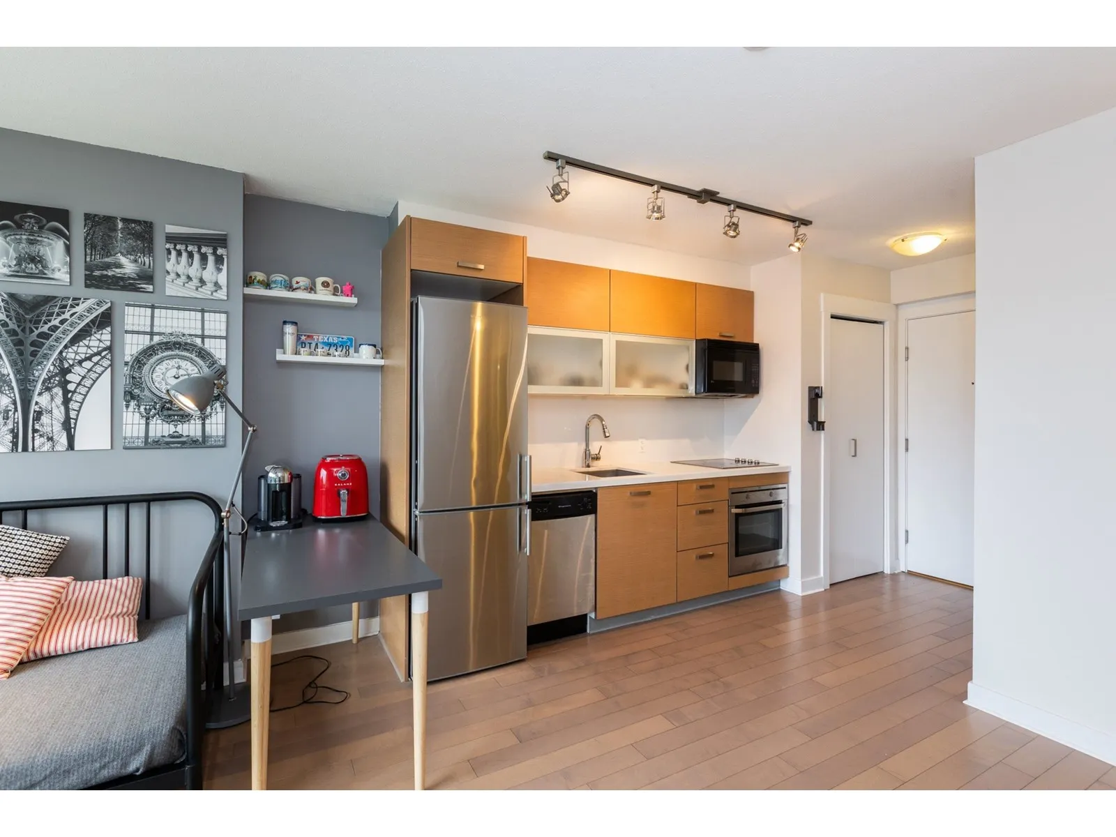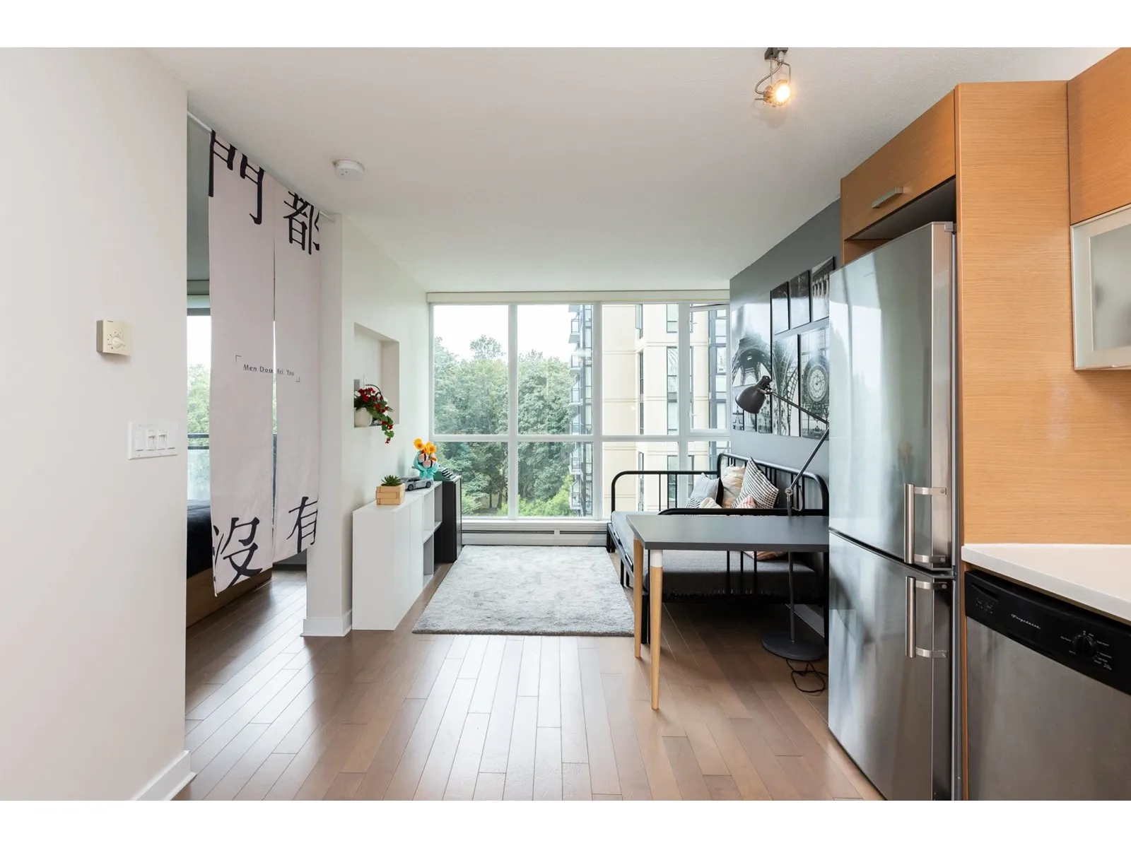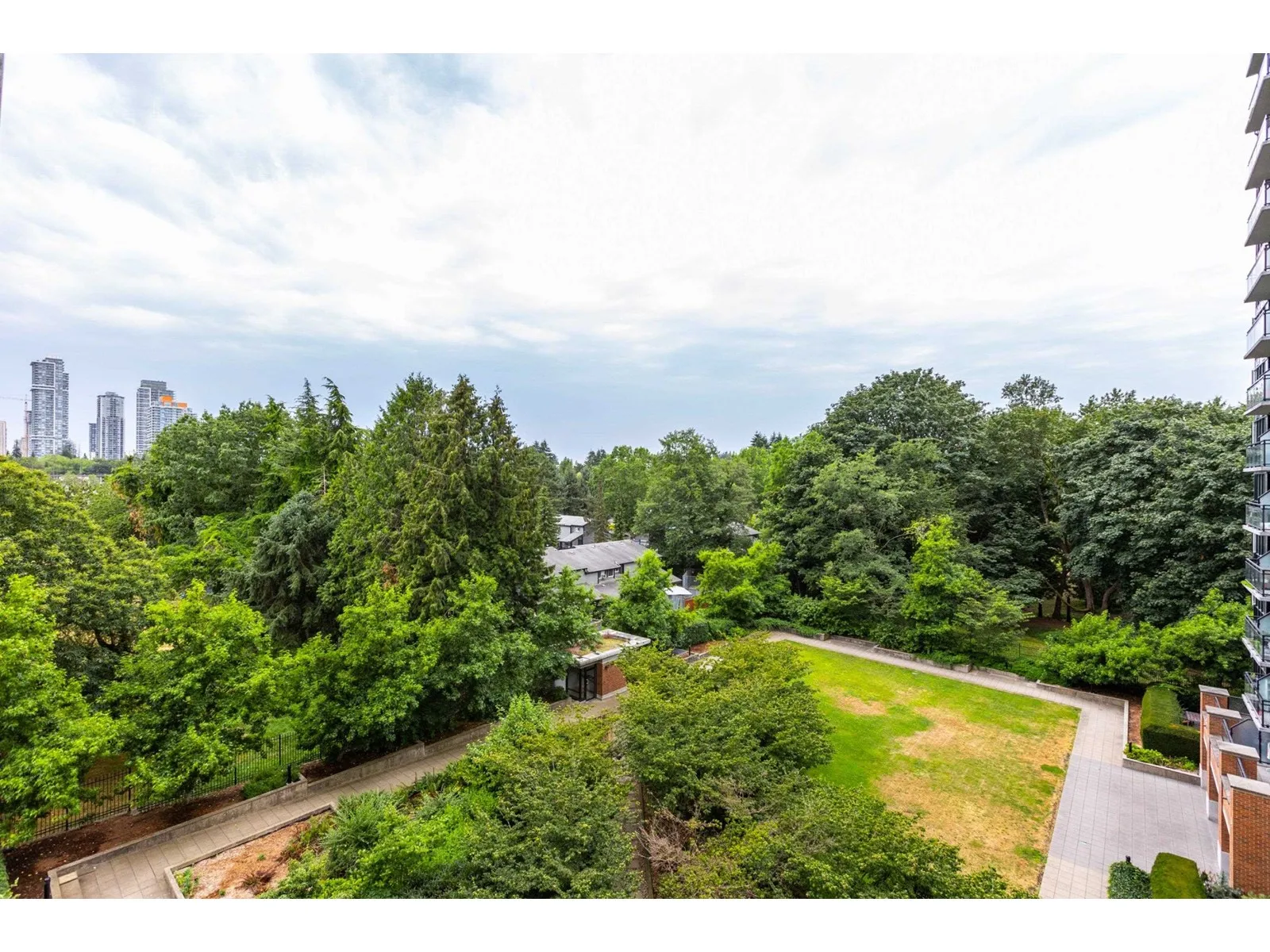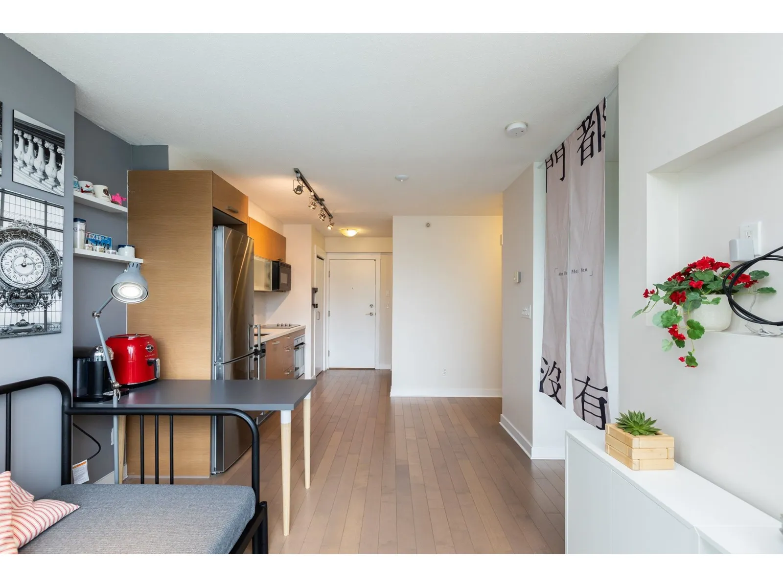 Cozy, quiet and turn key one bedroom + den unit is away from skytrain track, facing courtyard with good view! BRAND NEW floor, high-end stainless appliances, one parking P1-#50 and one locker P4-#441, hot water is included in strata fees. Few minutes walking to skytrain Station, Steps to park, new library, City Hall, TD Bank, Central shops, Walmart, Shoppers Drug Mart, SFU, close to T&T Supermarket. Owner occupied with a flexible possession date! Great for investor and the first time buyer, don't miss it! (id:27476)