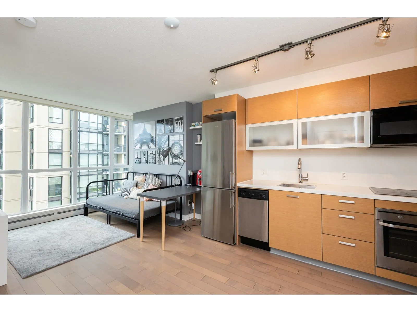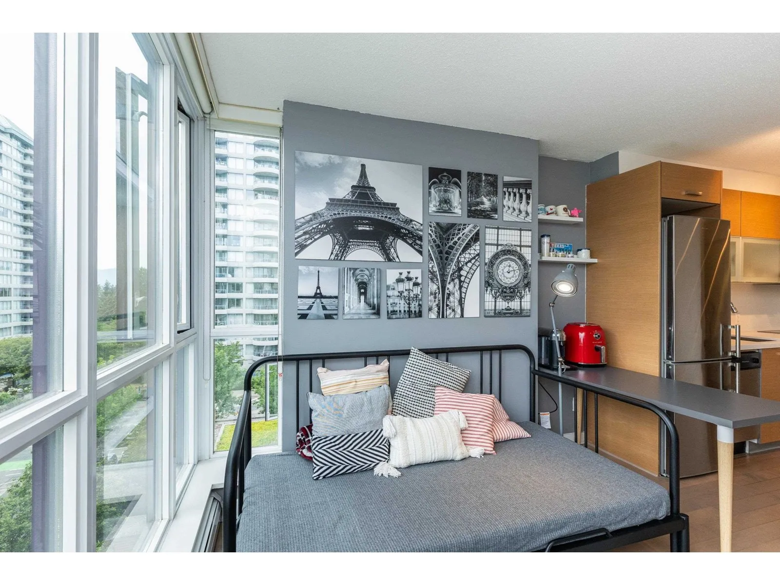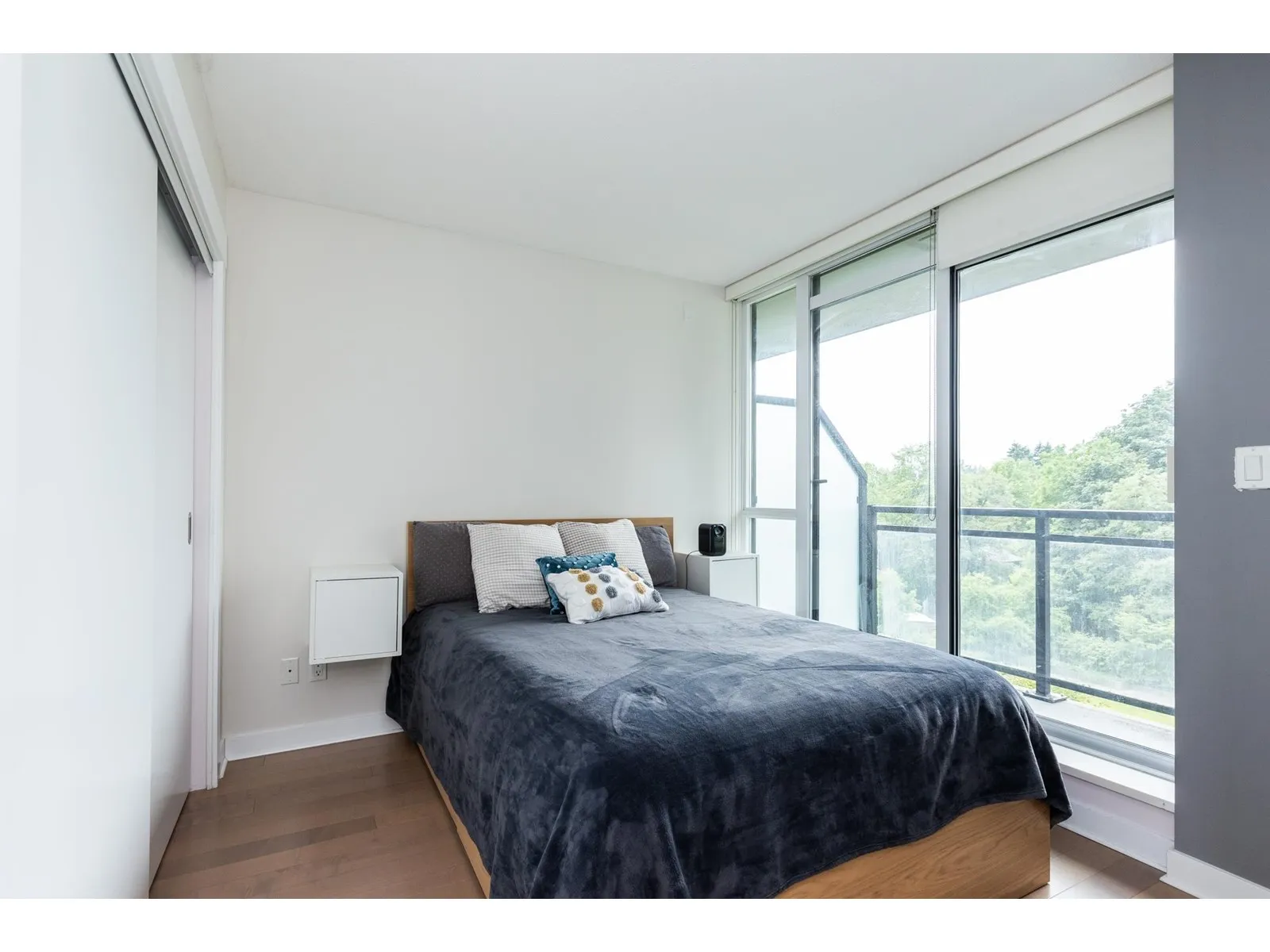Cozy, quiet and turn key one bedroom + den unit is away from skytrain track, facing courtyard with good view! BRAND NEW floor, high-end stainless appliances, one parking P1-#50 and one locker P4-#441, hot water is included in strata fees. Few minutes walking to skytrain Station, Steps to park, new library, City Hall, TD Bank, Central shops, Walmart, Shoppers Drug Mart, SFU, close to T&T Supermarket. Owner occupied with a flexible possession date! Great for investor and the first time buyer, don't miss it! (id:27476)