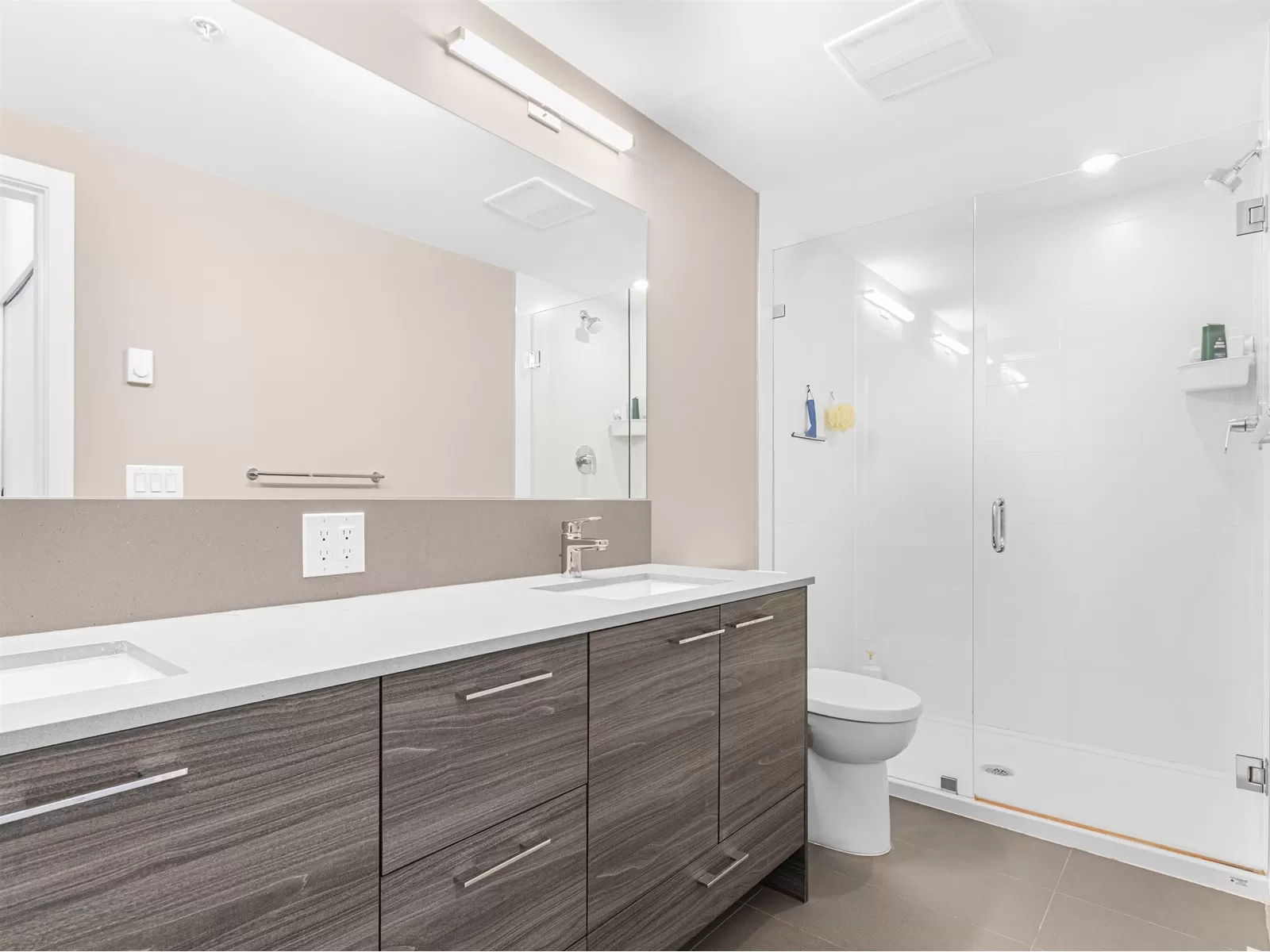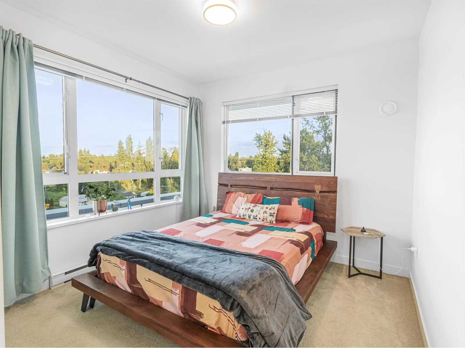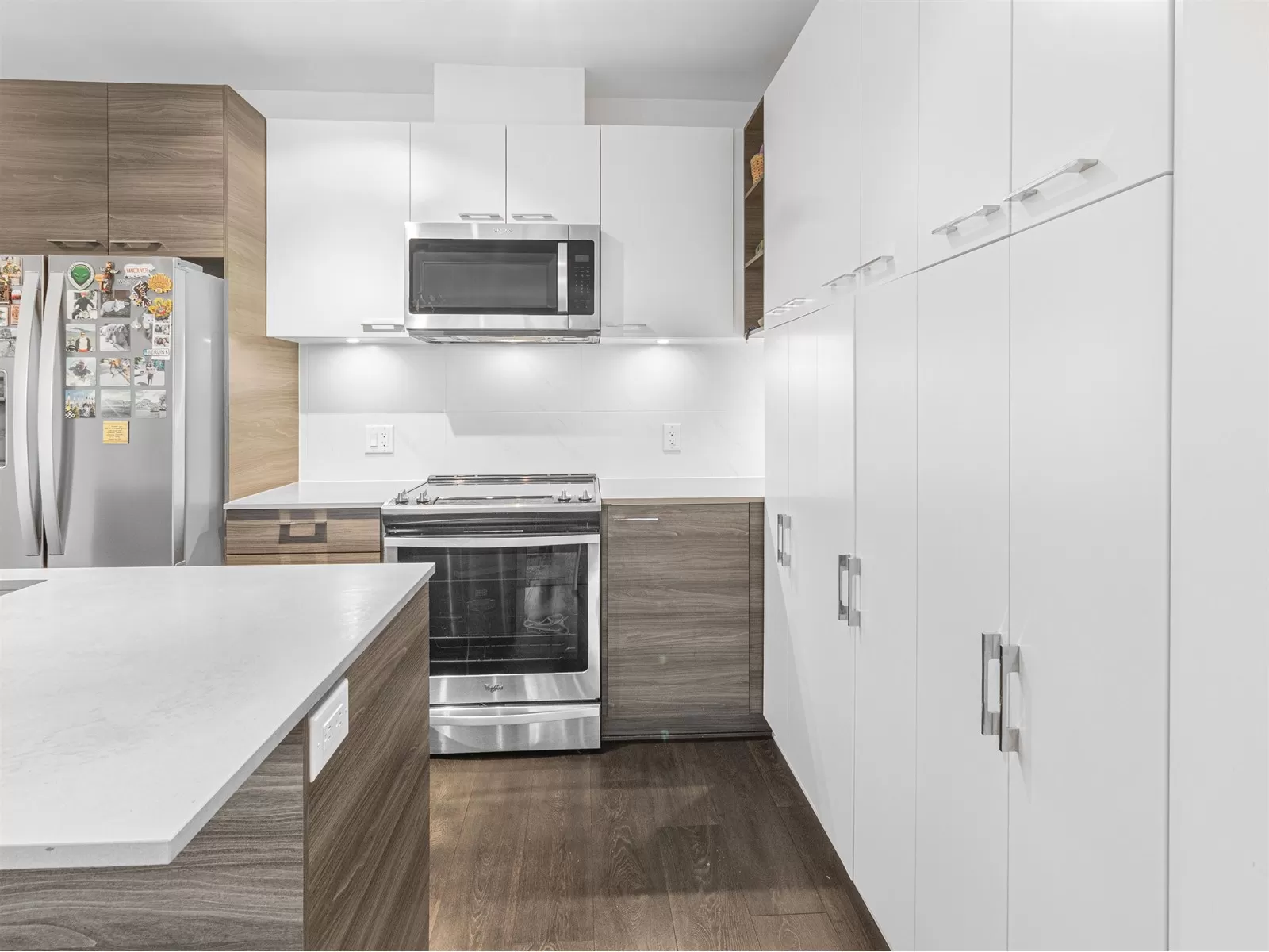 Welcome to this bright and spacious top-floor corner unit at HQ by Porte! This 903 sqft home features large east and south-facing windows that flood the space with natural light, while the north-facing entrance ensures privacy and energy flow. Enjoy panoramic, unobstructed views from this premium top-level suite. Thoughtfully designed, the unit offers 2 parking stalls conveniently located near the elevator and entrance, along with a large corner storage locker and three generous pantry closets. Located just steps from parks, schools, shopping, and express public transit routes, with easy access to the highway and SkyTrain. Exceptional building amenities include a fully-equipped gym, rooftop patio, BBQ area, kids' play zone, and community garden. (id:27476)