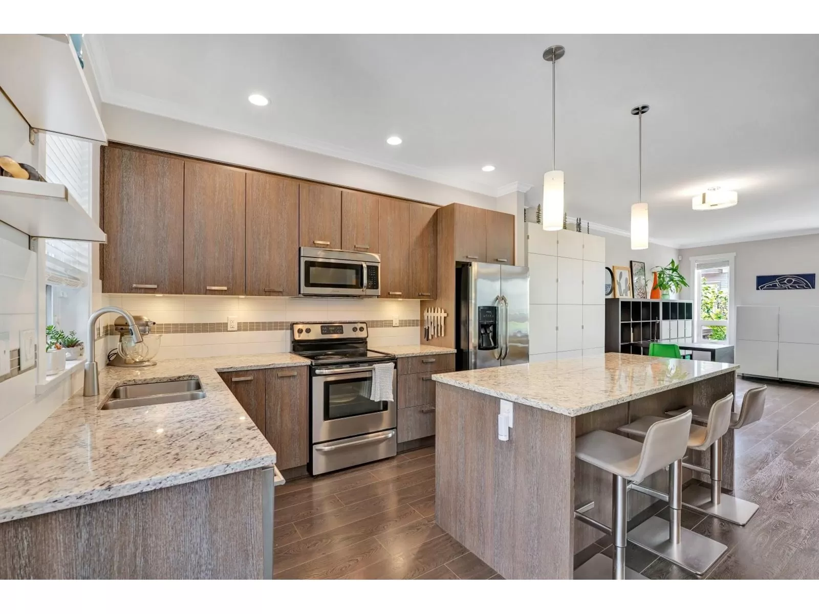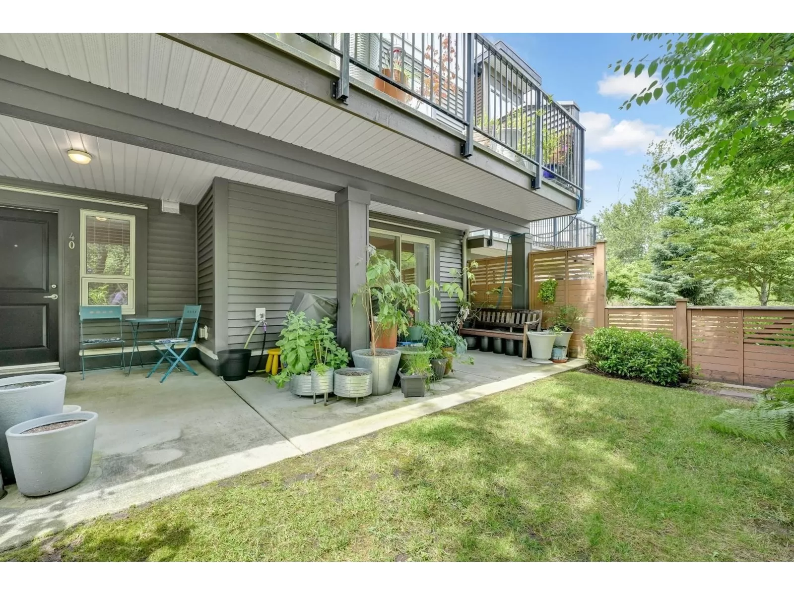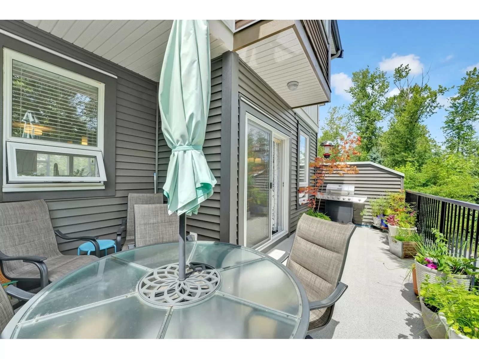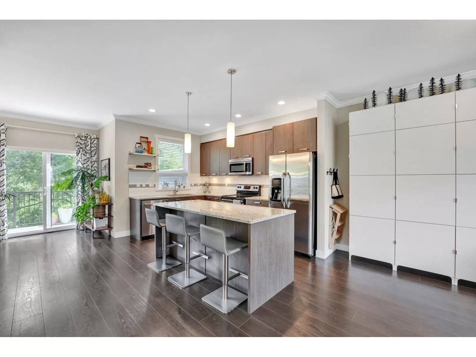 Welcome to one of the largest units in One44 complex, built by award-winning Vesta. This 3-storey townhome offers over 2,300 sqft of living space with 4 bedrooms & 4 bathrooms, situated on the quiet side of the complex facing a serene greenbelt. Main floor features an open layout with 9ft ceilings, oversized windows w/trim, large kitchen with plenty of cabinets, granite countertops & SS appliances, spacious living room w fireplace, dining room, powder room, eating area & extra large balcony, perfect for BBQs. Upstairs - large primary bedroom w/walk in closet & 2 more bedrooms, 2 bathrooms & laundry. The ground level includes 4th bedroom w/full bath & sliding doors leading to a large covered patio & fully fenced, tranquil yard. Bonus: 8 very generous closets, double side-by-side garage & double car driveway. Centrally located near all amenities, transit, schools, Bell Centre, shopping, parks, and restaurants. Easy access to Highways 10, 91 & 99. (id:27476)