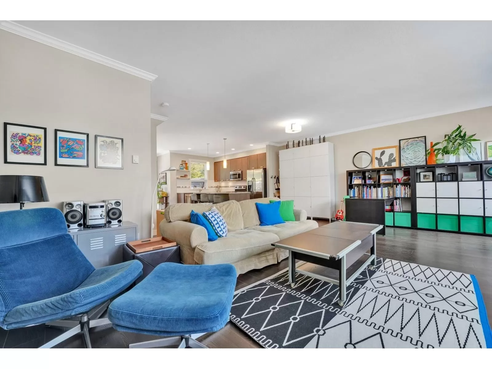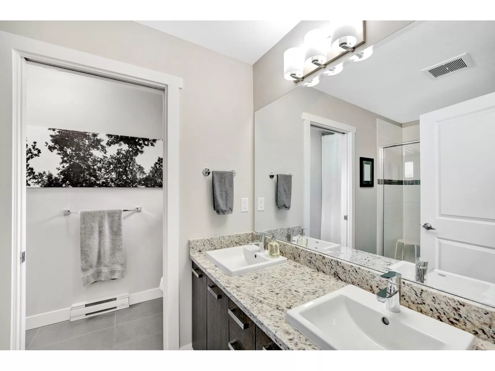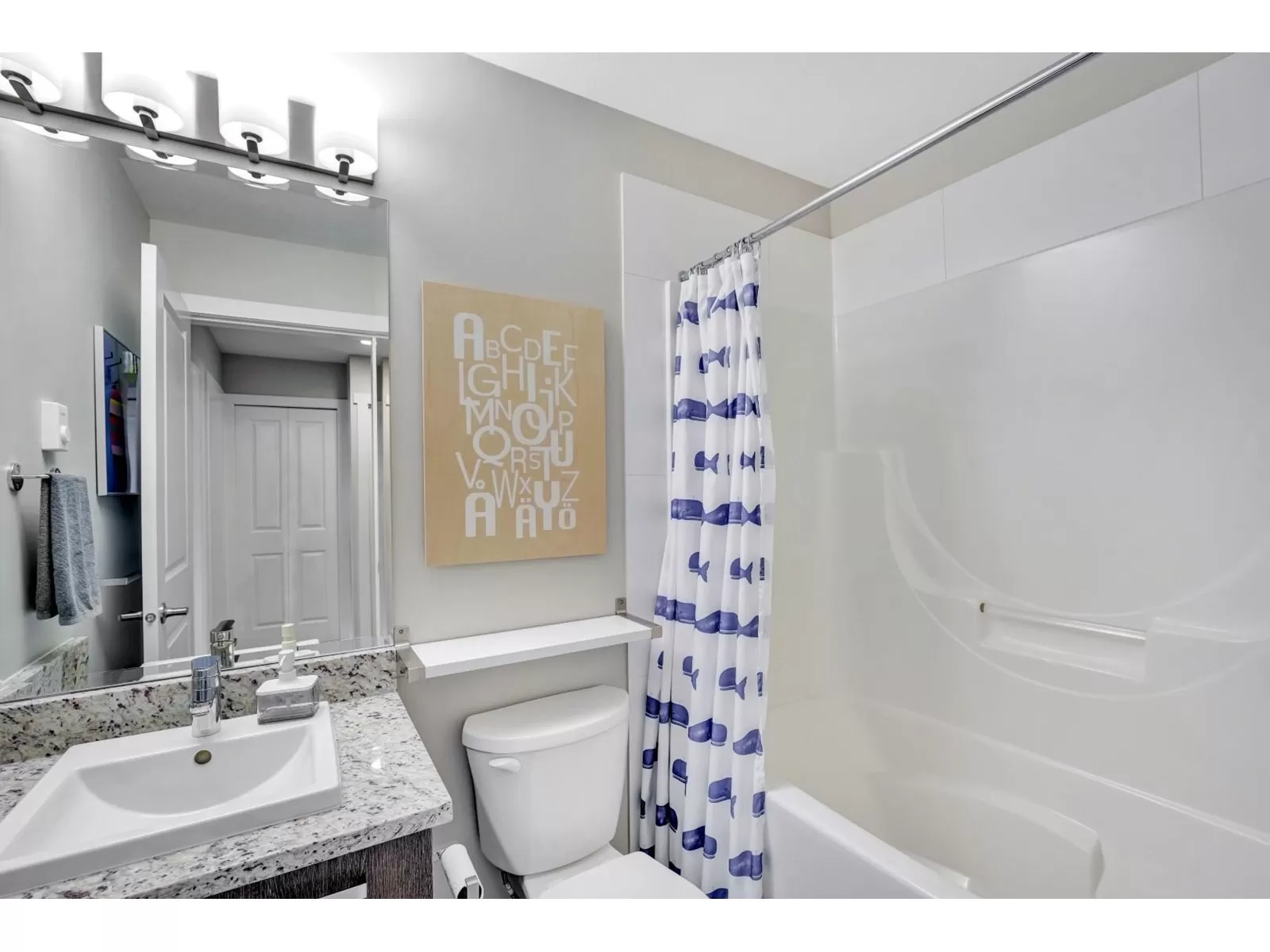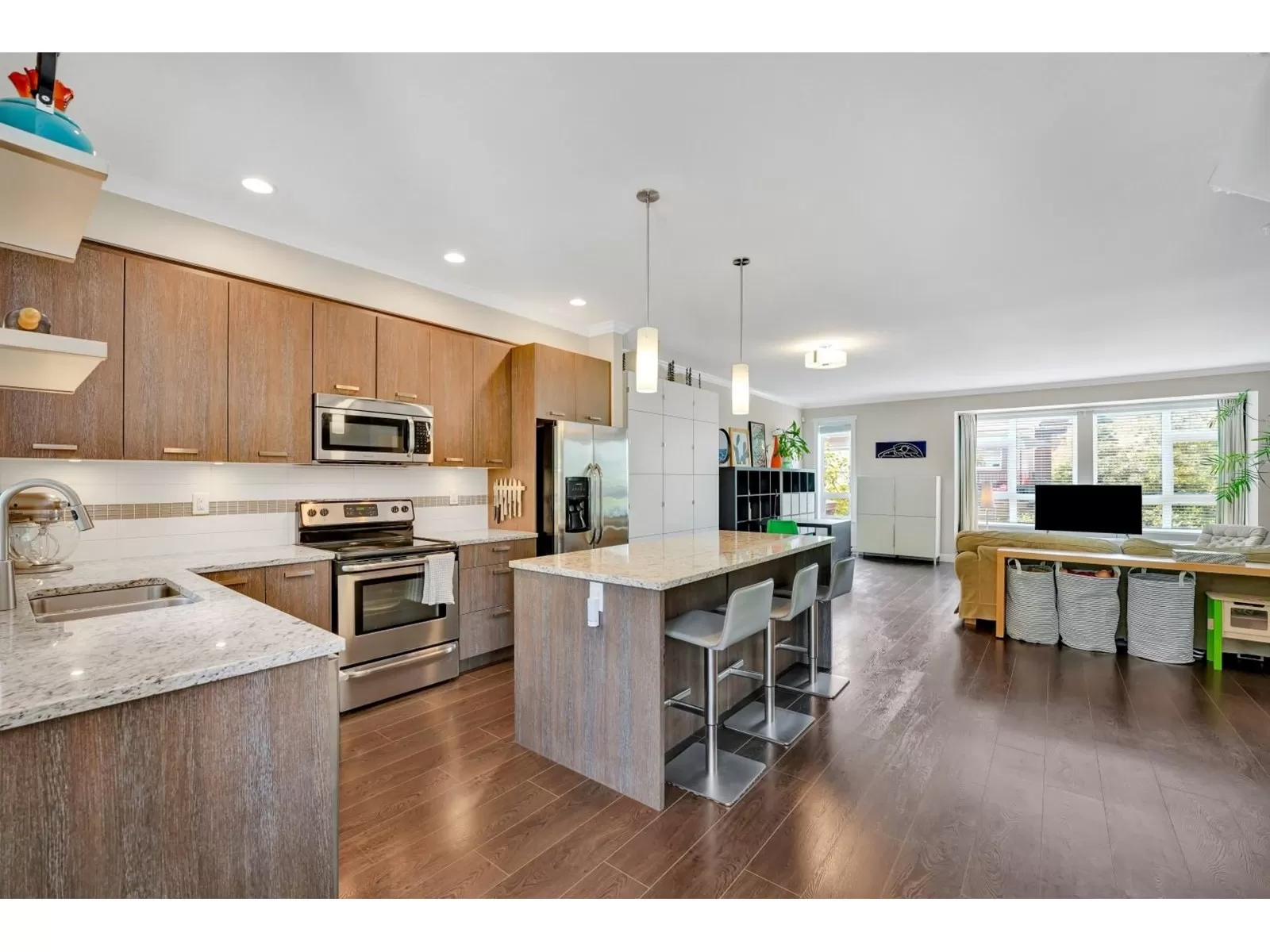 Welcome to one of the largest units in One44 complex, built by award-winning Vesta. This 3-storey townhome offers over 2,300 sqft of living space with 4 bedrooms & 4 bathrooms, situated on the quiet side of the complex facing a serene greenbelt. Main floor features an open layout with 9ft ceilings, oversized windows w/trim, large kitchen with plenty of cabinets, granite countertops & SS appliances, spacious living room w fireplace, dining room, powder room, eating area & extra large balcony, perfect for BBQs. Upstairs - large primary bedroom w/walk in closet & 2 more bedrooms, 2 bathrooms & laundry. The ground level includes 4th bedroom w/full bath & sliding doors leading to a large covered patio & fully fenced, tranquil yard. Bonus: 8 very generous closets, double side-by-side garage & double car driveway. Centrally located near all amenities, transit, schools, Bell Centre, shopping, parks, and restaurants. Easy access to Highways 10, 91 & 99. (id:27476)