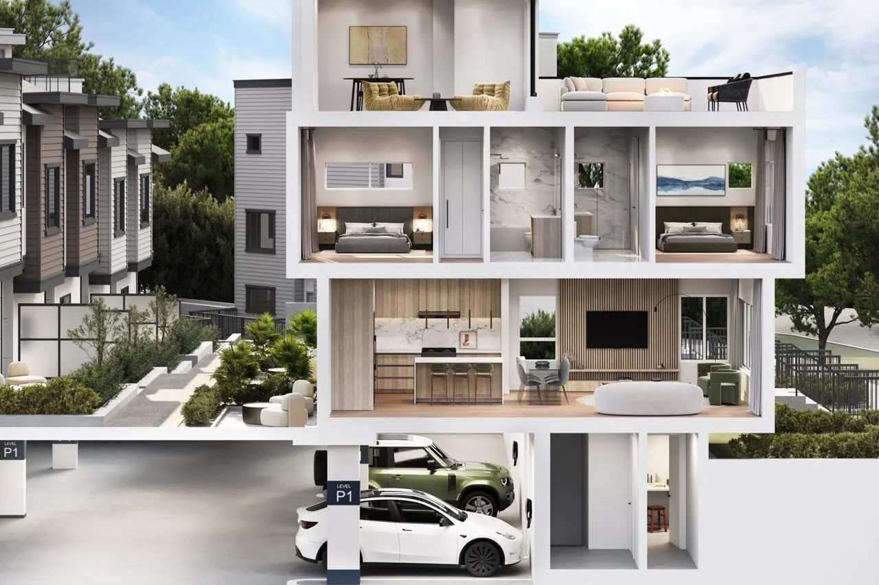 ELISA AT SUNNYSIDE PARK - 2 LEVEL TOWNHOME + BASEMENT - LATE 2026 COMPLETION - MULTI ZONE A/C & MORE. South Surrey's 1st sunroom & rooftop townhomes, offering unobstructed views of a 15-acre park. Single-family like living in a quiet neighbourhood, featuring main living on ground floor, private front yards & spacious back patios. Proximity to shopping, Hwy 99 & King George, acclaimed schools & more! Benefit from 2 secure underground EV parking w/direct access via private entry door into your suite + Flex/Storage, bespoke interiors & energy-efficient heatpumps. Enhancements: built-in storage & combining bedrooms into oversized master suites. With homes ranging from 1339-2033 sf & lowest strata fees Est. $0.14/sf, Elisa presents an unparalleled opportunity for sophisticated living. (id:27476)