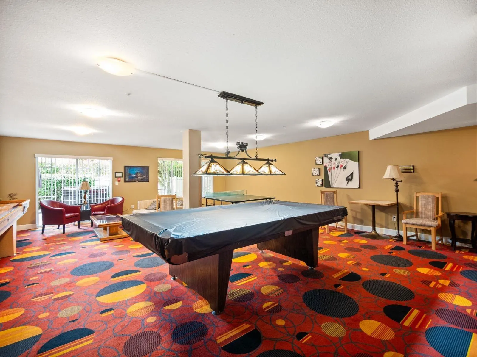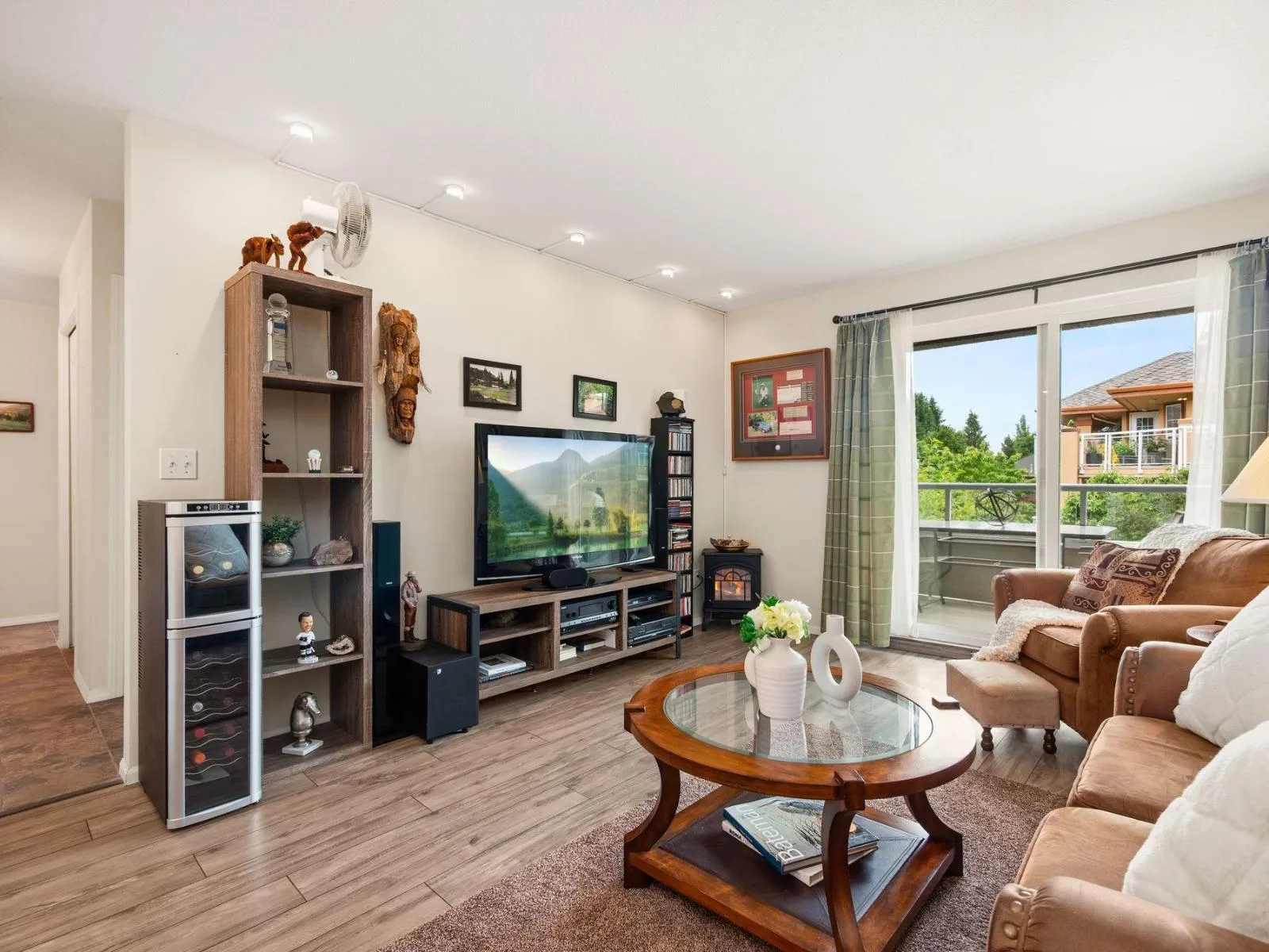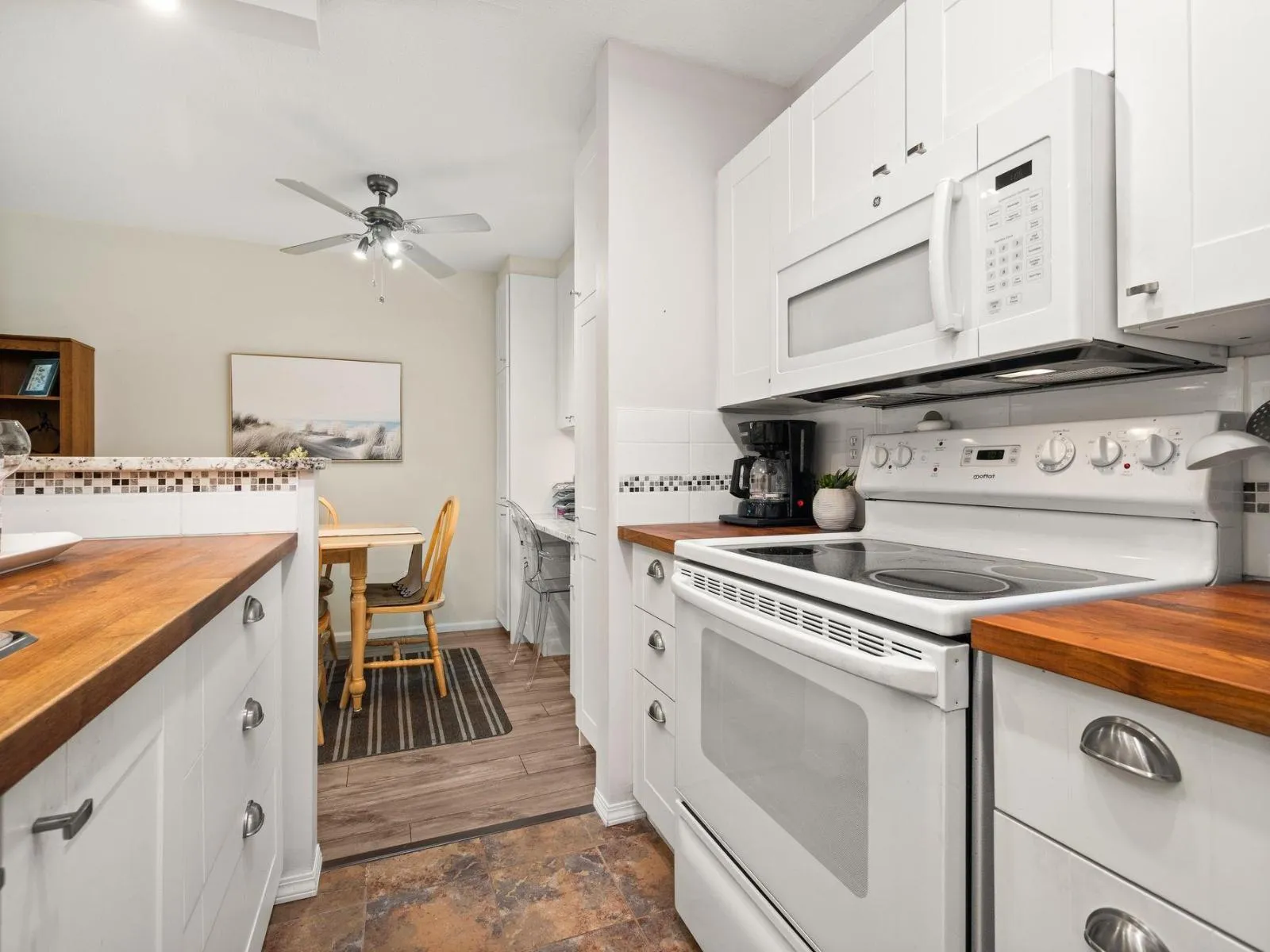 Welcome to this beautifully renovated 2-bedroom, 1-bathroom home offering bright south-facing exposure and a thoughtfully designed interior. The kitchen features crisp white cabinetry, granite and butcher block countertops, accent lighting, and a seamless flow into the living space with new flooring throughout. The full bathroom boasts a walk-in shower, and the dedicated office area includes granite countertops to match the kitchen. Step out onto the spacious deck with sunshade-perfect for relaxing or entertaining all day long. Located in a well-maintained 55+ building, residents enjoy a wealth of amenities including a dining room with a commercial-sized kitchen, a cozy lounge with patio and green space access, one secure parking stall, a storage locker, and ample visitor parking. Ideally situated just steps from the tranquil Semiahmoo Trail and within walking distance to shopping and transit, this home offers both comfort and convenience in a peaceful community setting. (id:27476)