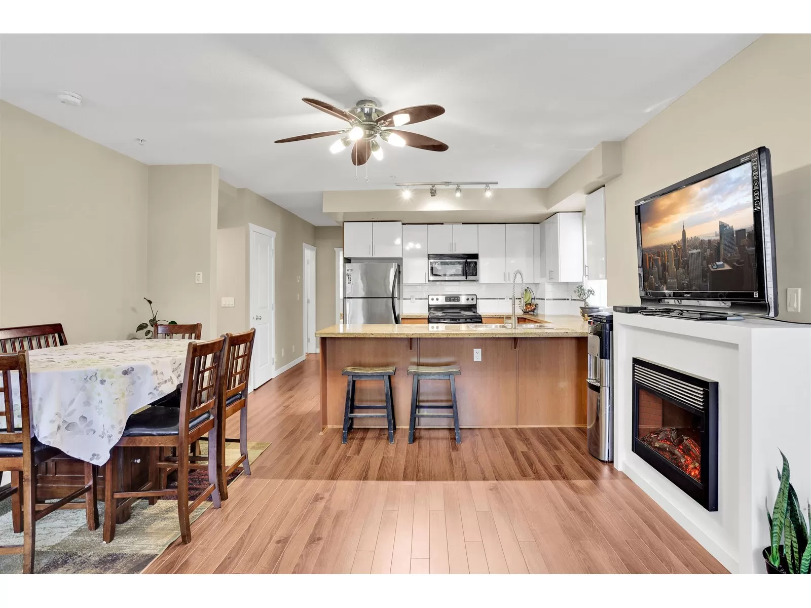 Perfectly Located Home! This bright and cozy corner unit offers exceptional value and comfort. Featuring 4 spacious bedrooms including one conveniently located on the main floor along with a powder room, this home is ideal for families or investors alike. The main level boasts durable laminate flooring. Enjoy cooking in the beautiful kitchen complete with granite countertops, stainless steel appliances and an open concept layout that fills with natural light. Additional highlights include in-suite laundry, two full bathrooms and two dedicated parking spaces. Nestled in a quiet section of the complex, this home offers unbeatable convenience just a 3 minute walk to school, 7 minutes to Central City Mall, and 8 minutes to the SkyTrain. Don't miss out-book your private showin (id:27476)