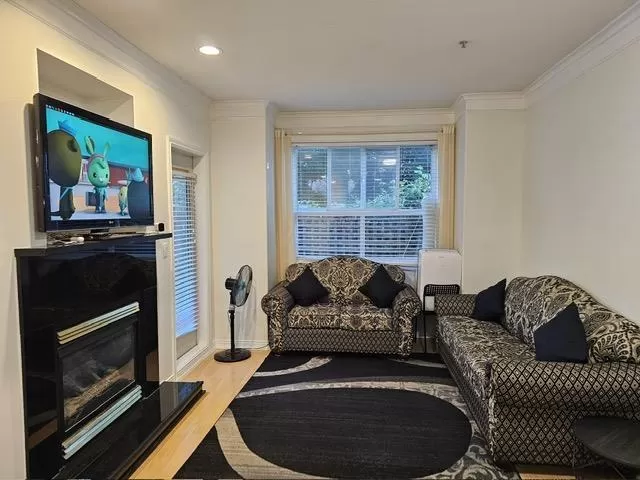 Welcome to this stunning 2-bedroom, 2-bath condo featuring a private entrance off the patio, two parking spots, and a storage locker. The bright and spacious layout offers a large primary bedroom with a walk-in closet and private en-suite. Soaring 9-foot ceilings, crown moldings, and large windows fill the space with natural light. The open-concept kitchen boasts granite countertops and flows seamlessly into the living and dining areas. Tucked away on a quiet cul-de-sac, this home is conveniently located near shopping and transit. Low strata fees include hot water, gas, sewer, water, and garbage collection. Enjoy added perks like a rentable guest suite and amenity room. Pet-friendly . A must-see! (id:27476)
