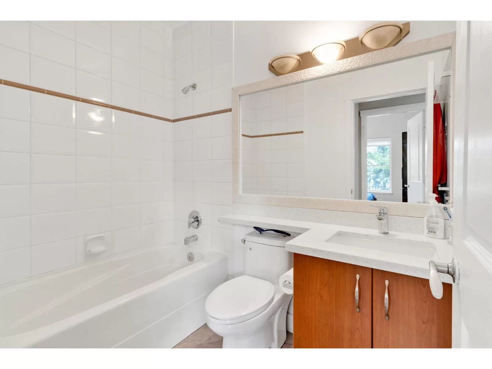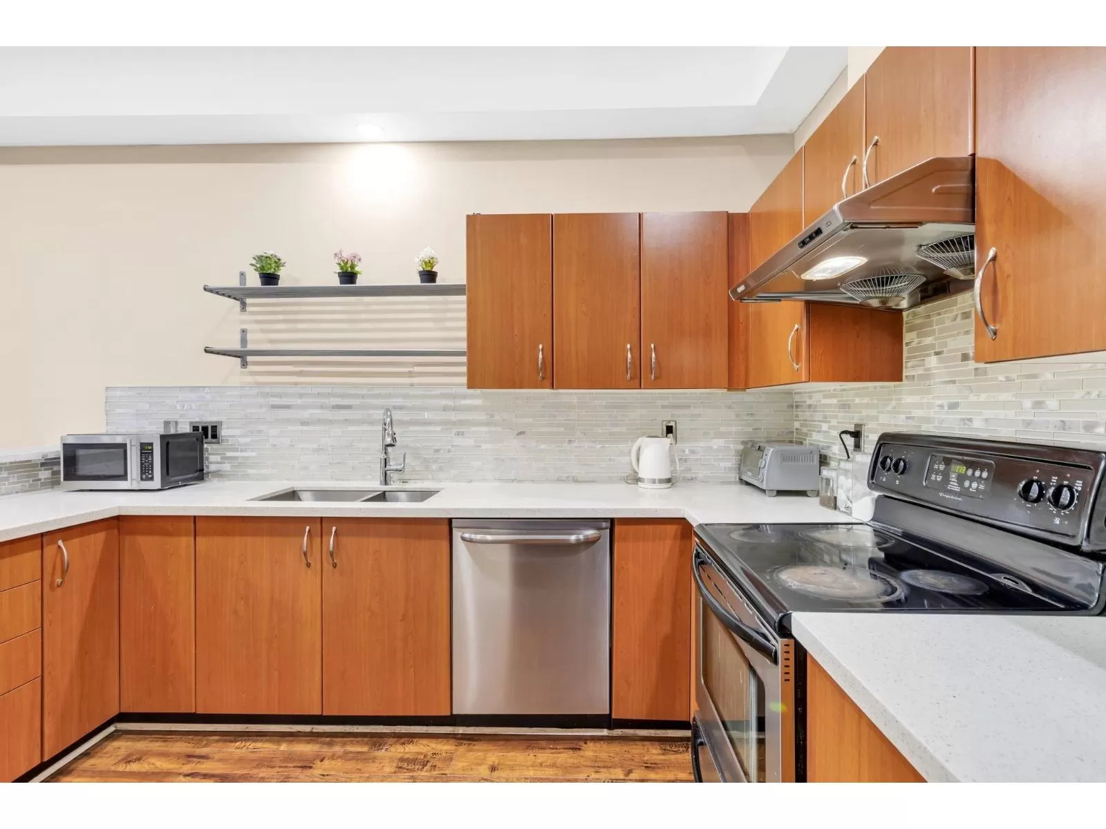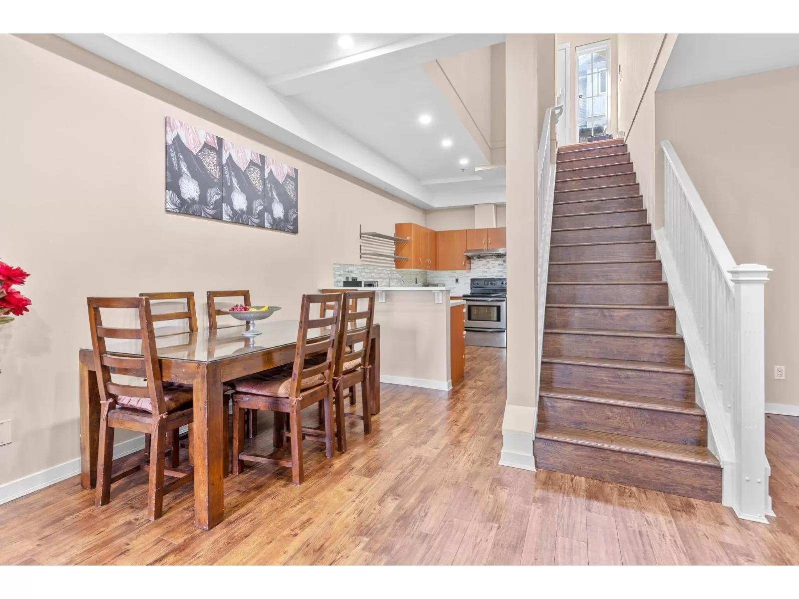 2 bedrooms & 2 baths townhome located in Terrane, walking distance to Scottsdale Shopping Centre with Save-on-Foods, Walmart, many options of restaurants and recreation places. Walking distance to schools and public transportation. You will love this warm and spacious 1st floor unit with new laminate floors. The kitchen area has been refinished with quartz counters and cabinets. Large utility room accommodates more storage space. Street parking access to the peaceful front yard. (id:27476)