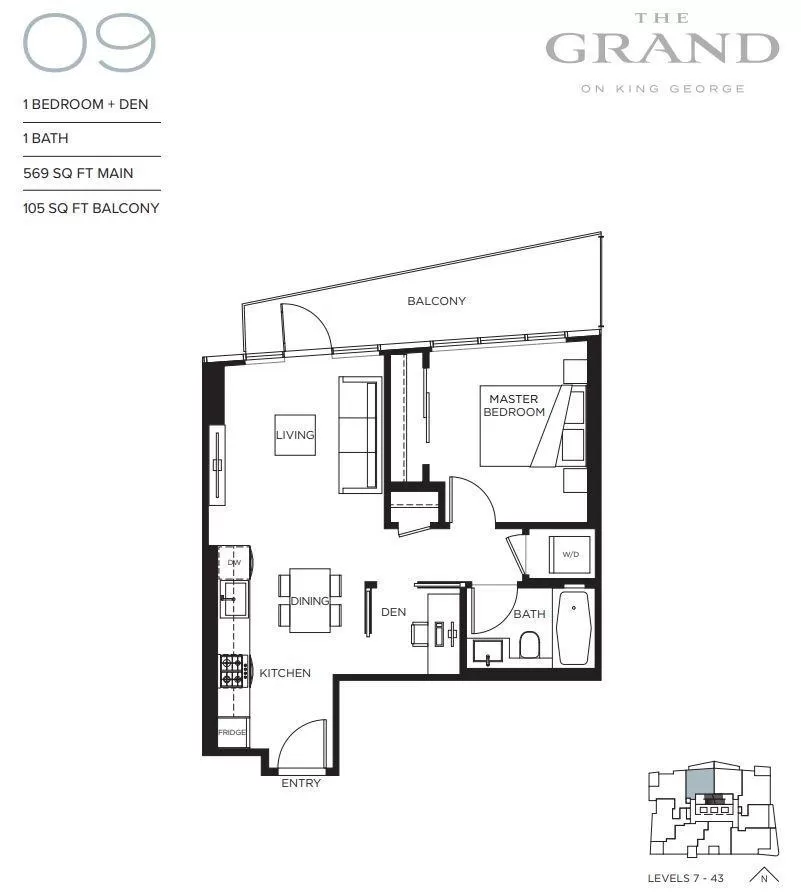 Welcome to The Grand on King George! This beautifully designed 1-bedroom + den suite offers 569 SQ. FT. of contemporary living space with stunning views. Residents enjoy over 23,000 SQ. FT. of premium indoor and outdoor amenities, including a state-of-the-art fitness centre, off-leash dog park and dog wash station, private VR room, golf simulator, outdoor BBQ area, landscaped park space, children's playground, and 24/7 concierge service. The home feature central heating & cooling, gas cooktop (gas included in strata fees), smart kitchen cabinet organizers, and so much more! (id:27476)