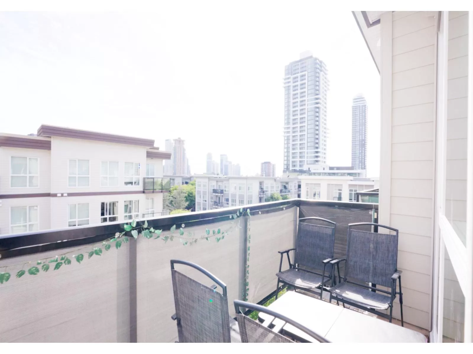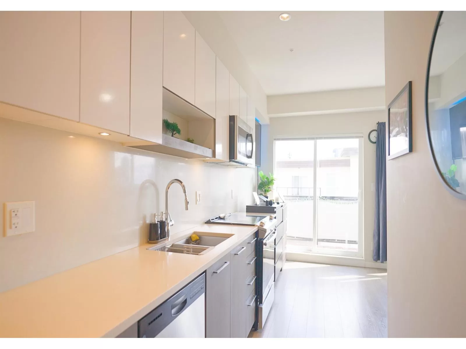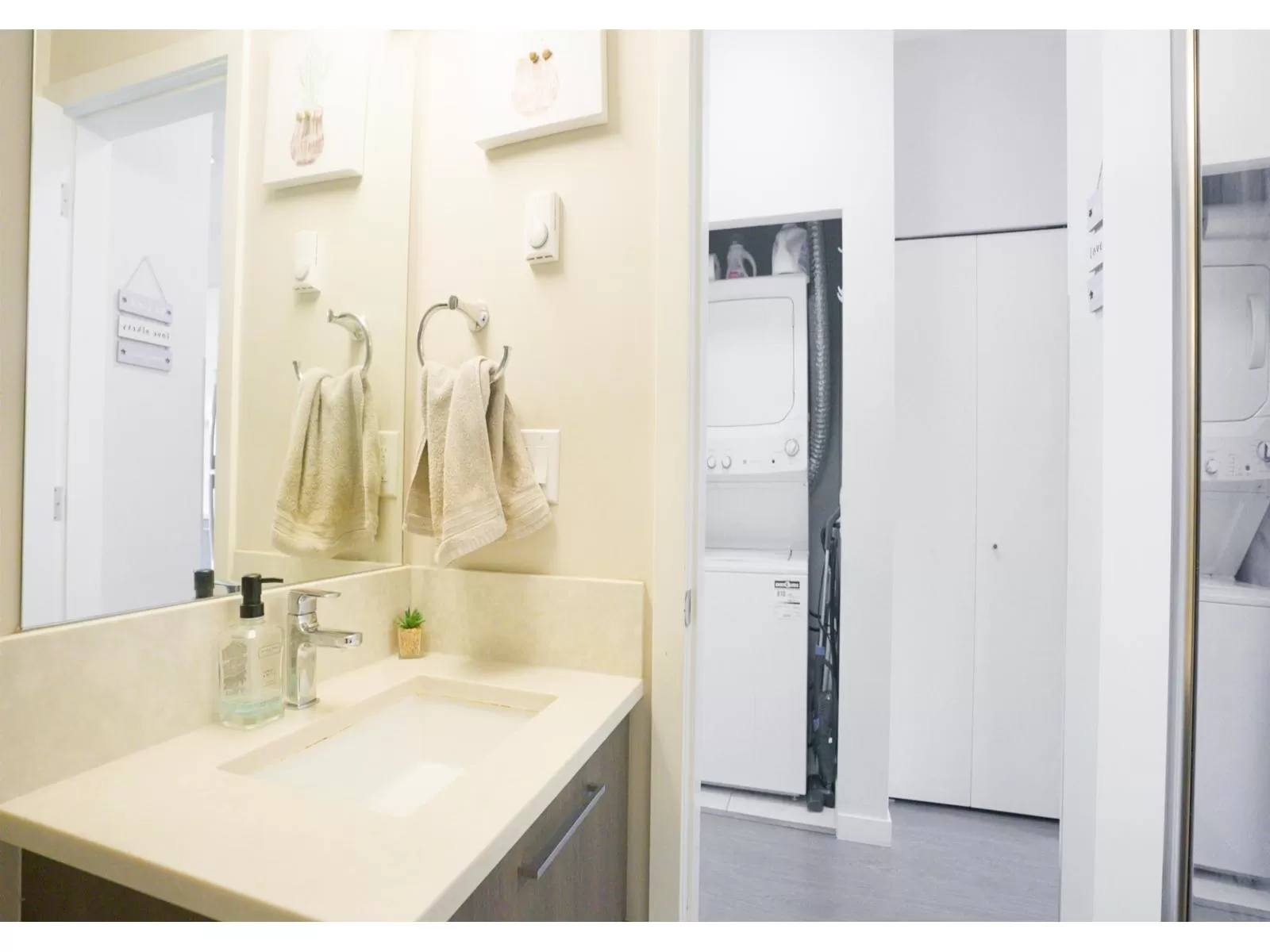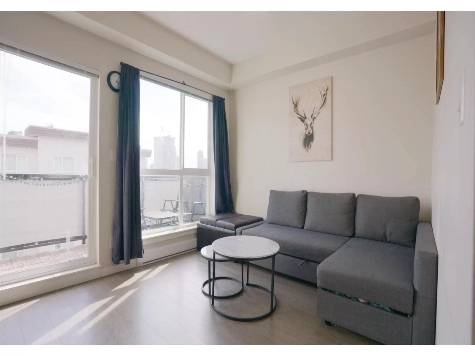 This immaculate 1-bedroom, 1-bathroom, 1-parking, 1-locker penthouse corner unit features modern laminate flooring, 9-ft ceilings, quartz countertops, stainless steel appliances, and a full-sized washer/dryer. . The unit comes with a low $292 strata fee and access to top amenities including a gym (no extra fee required) and a rooftop patio located just in front of the unit with BBQs, a fire table, and stunning city views. All this is just minutes from SkyTrain and local shops, making it a perfectly located, move-in ready home. Locker #29 parking #28 Enjoy a south-facing balcony with sunlight all day, conveniently positioned with the stairwell on one side of the unit and the electric room on the other-ideal for privacy and enjoying music without disturbing neighbors. (id:27476)